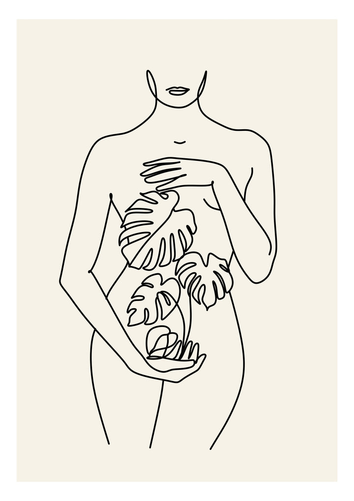 "Exotic Greenery" poster features minimalist line art depicting a nude woman holding a lush, detailed Monstera plant against a neutral background. This Scandi-inspired, minimalist illustration blends simplicity with botanical elegance, making it an ideal piece for modern and boho interiors. The contrast between the intricate leaf design and clean lines emphasizes serene natural beauty. Perfect for those seeking contemporary wall art.