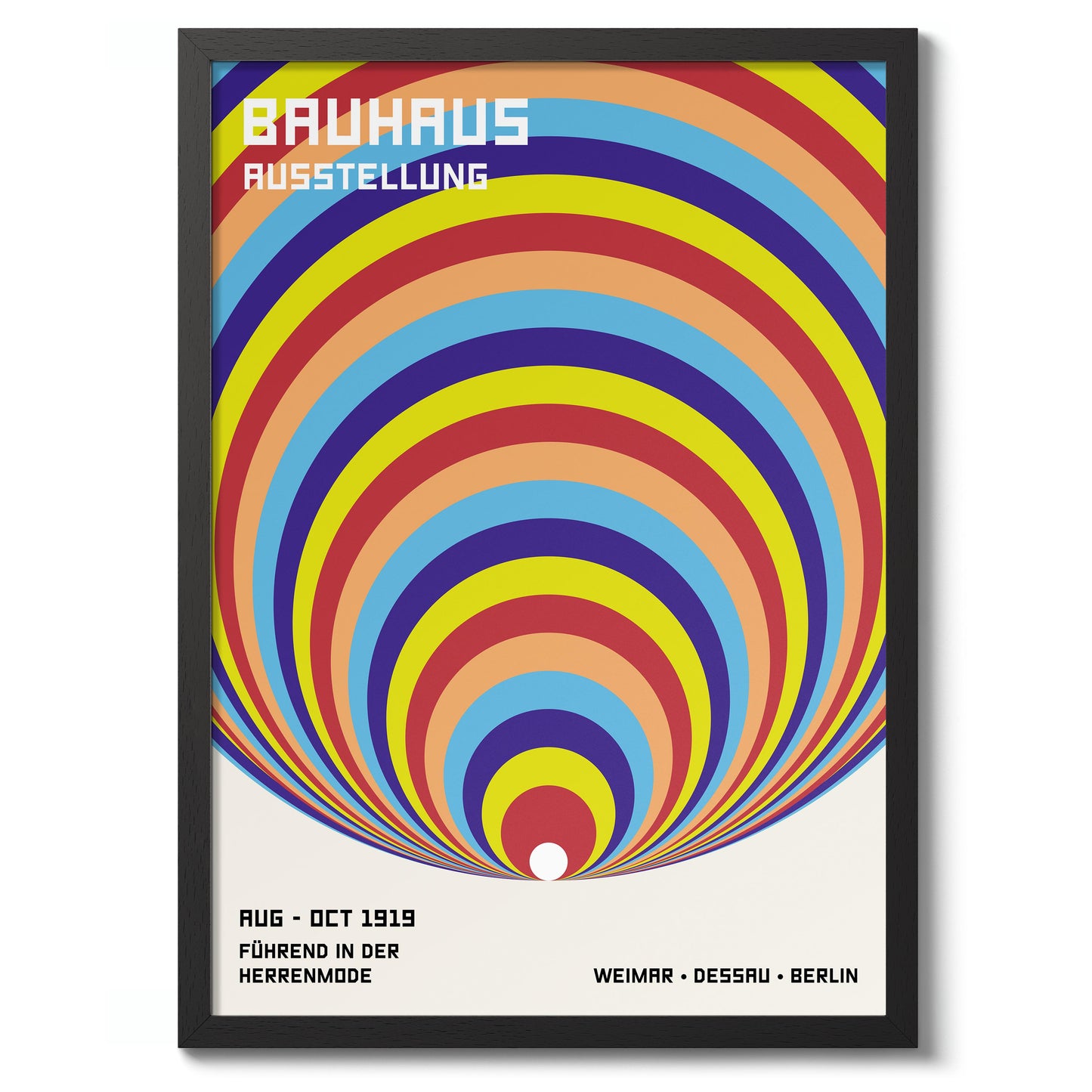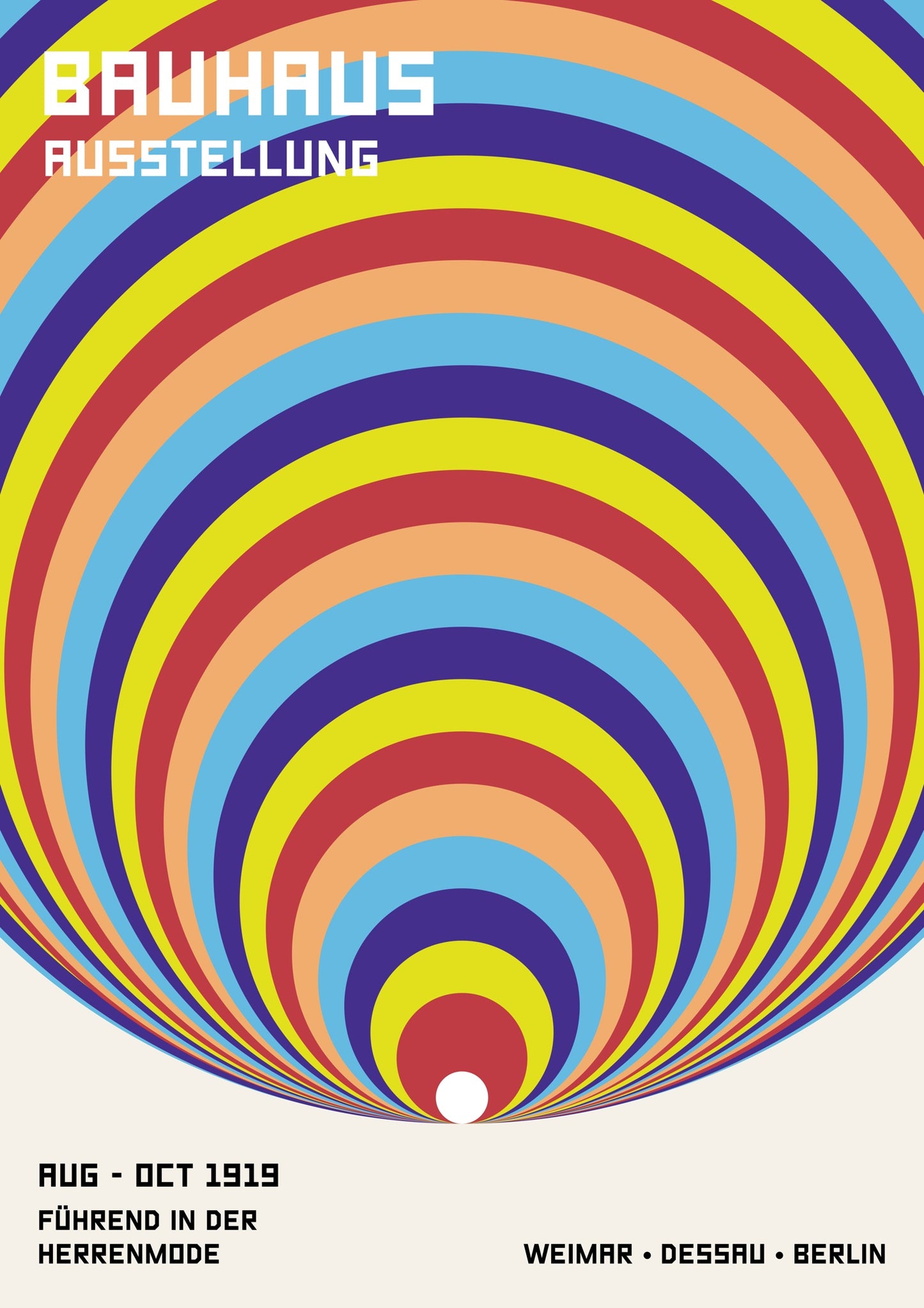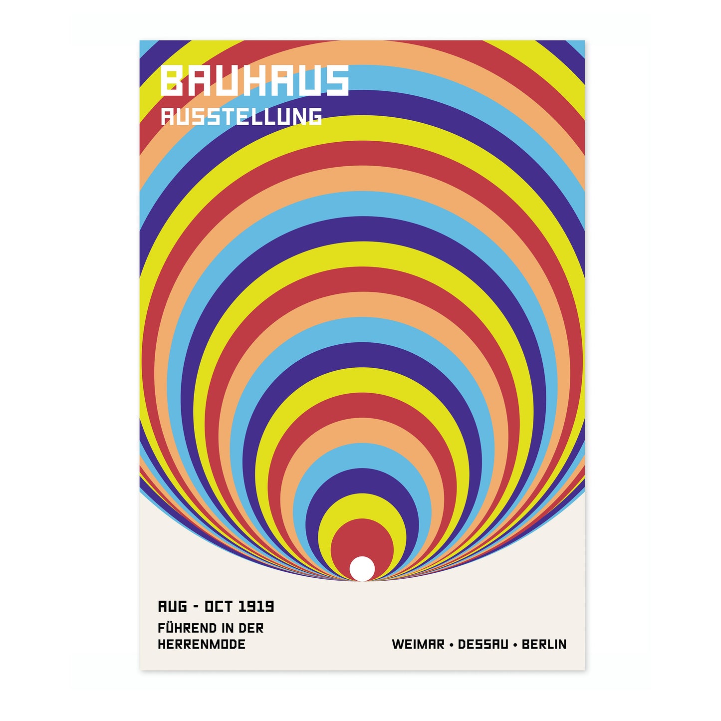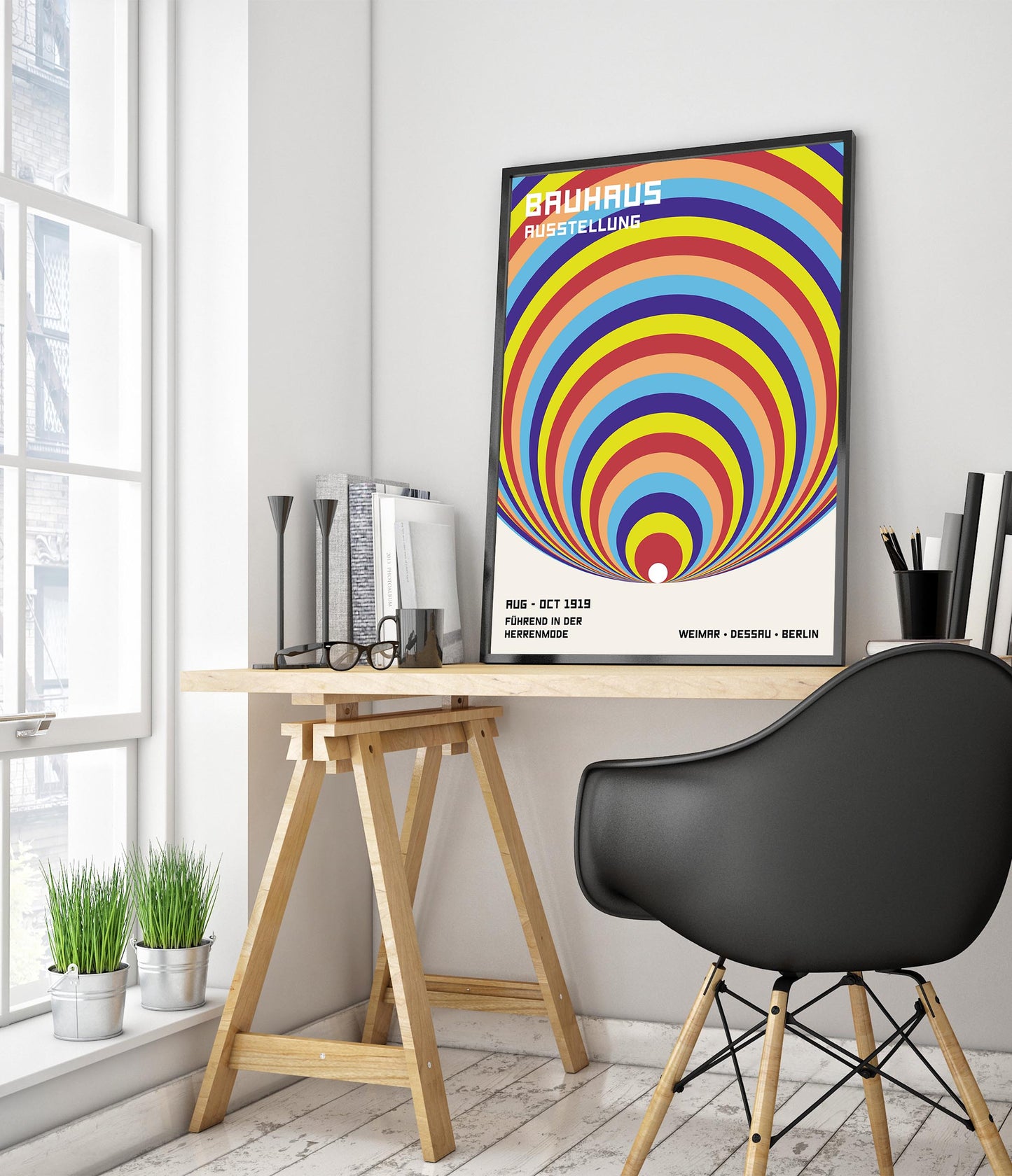 This vibrant Bauhaus-inspired poster, titled "Expanding Circles," features bold, concentric circles in vivid hues, creating a striking geometric pattern. Ideal for mid-century modern enthusiasts, this graphic exhibition print captures the essence of early 20th-century design. Perfect for adding a dynamic visual element to any space, this artwork masterfully combines shape and colour in a timeless style.