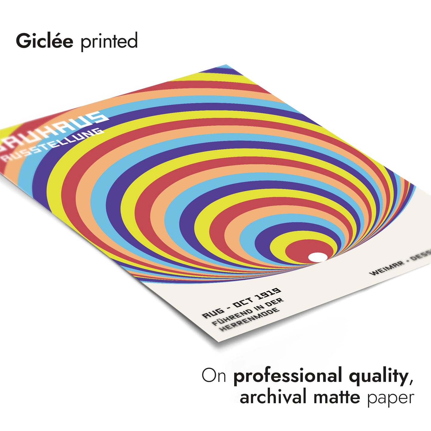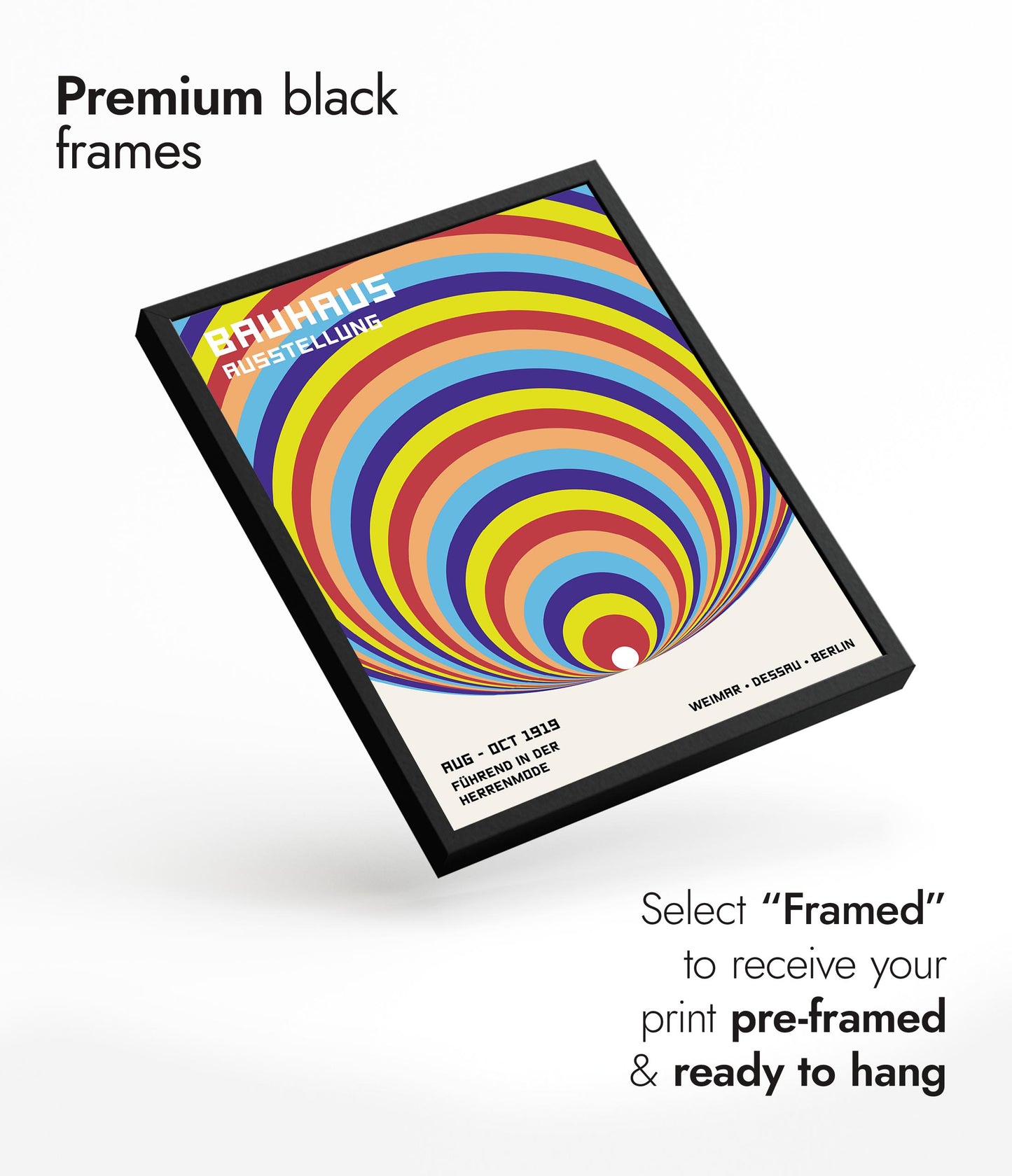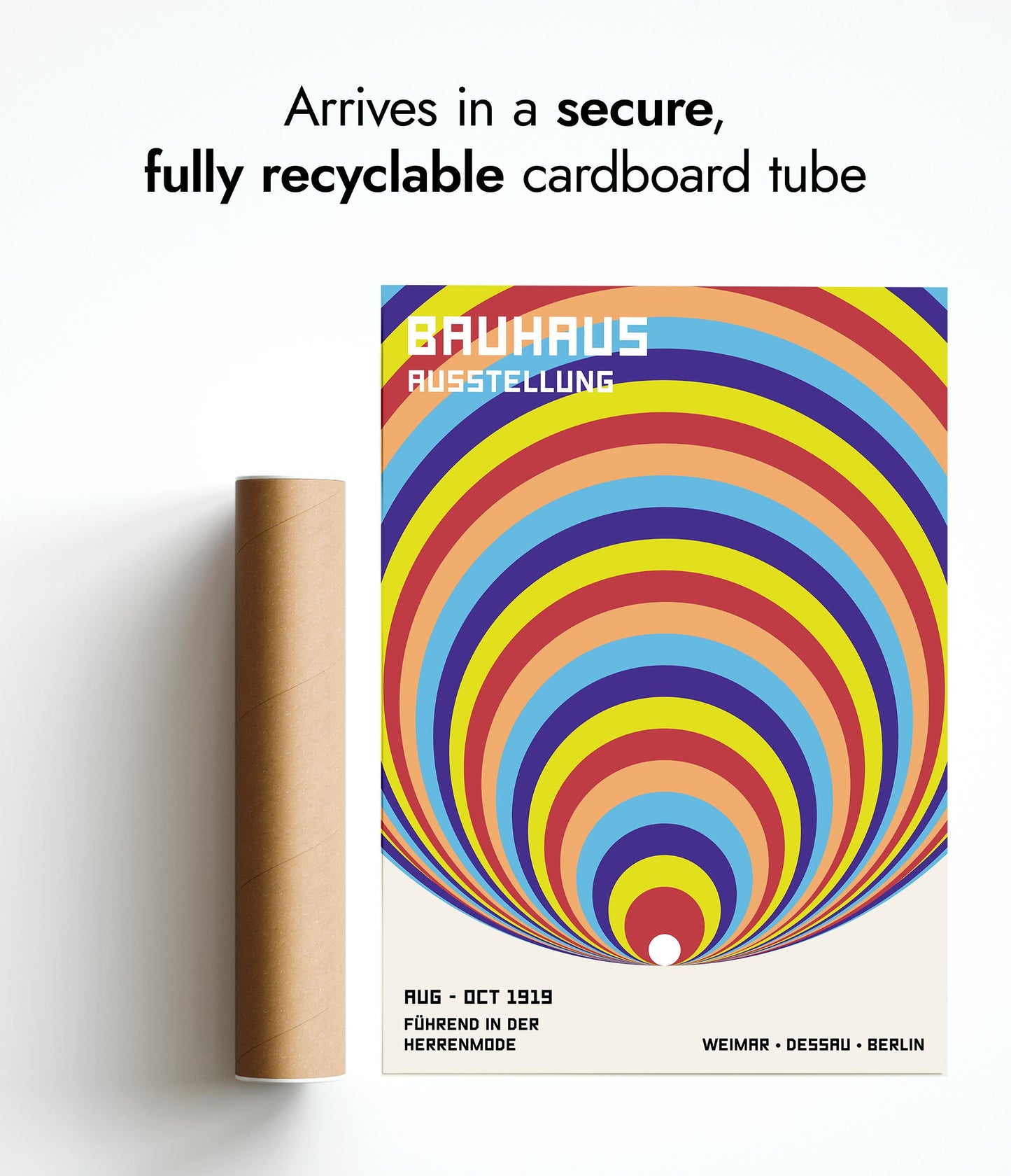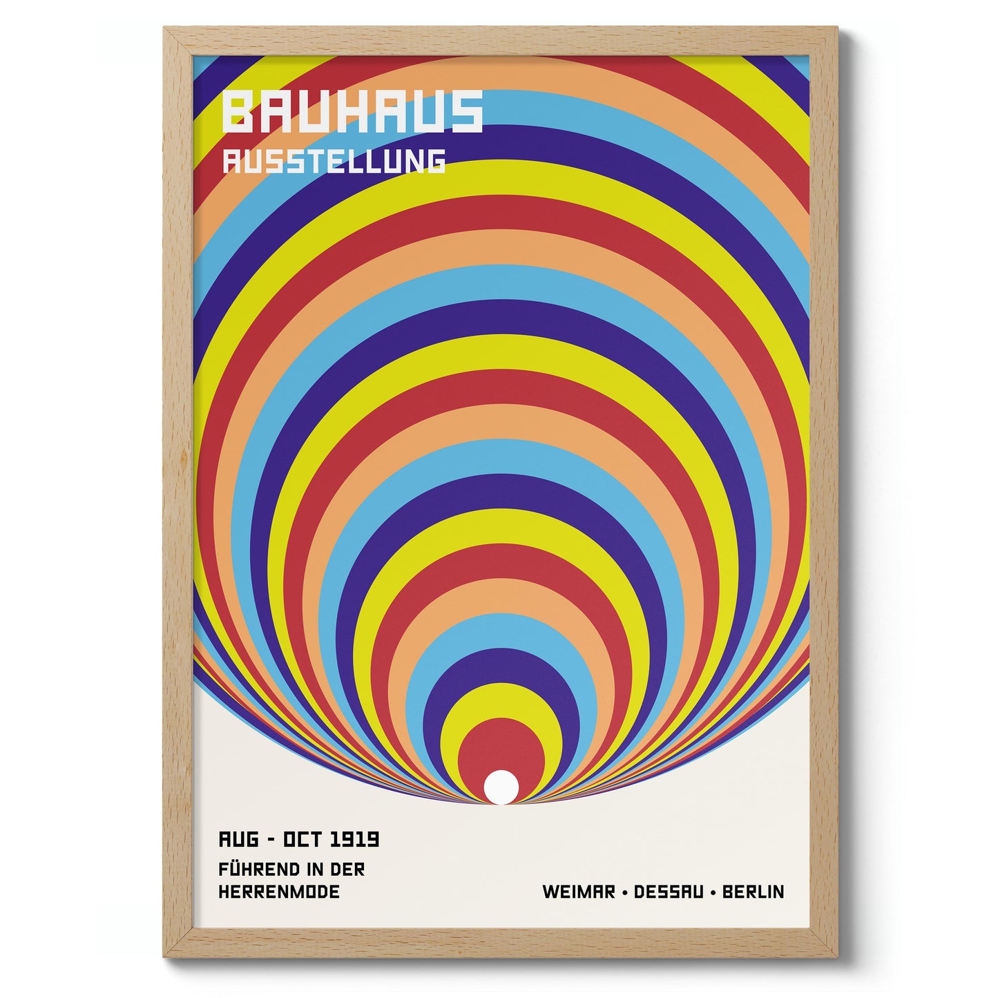 This vibrant Bauhaus-inspired poster, titled "Expanding Circles," features bold, concentric circles in vivid hues, creating a striking geometric pattern. Ideal for mid-century modern enthusiasts, this graphic exhibition print captures the essence of early 20th-century design. Perfect for adding a dynamic visual element to any space, this artwork masterfully combines shape and colour in a timeless style.