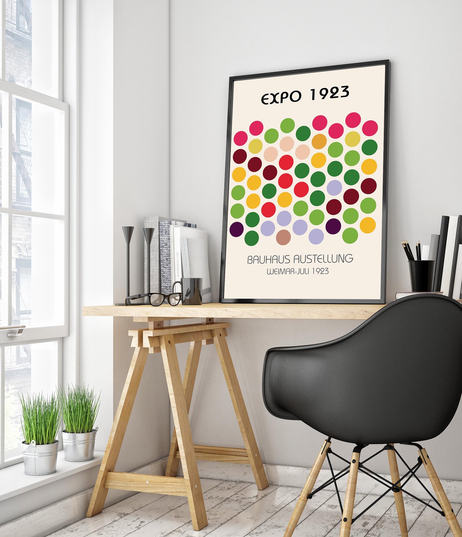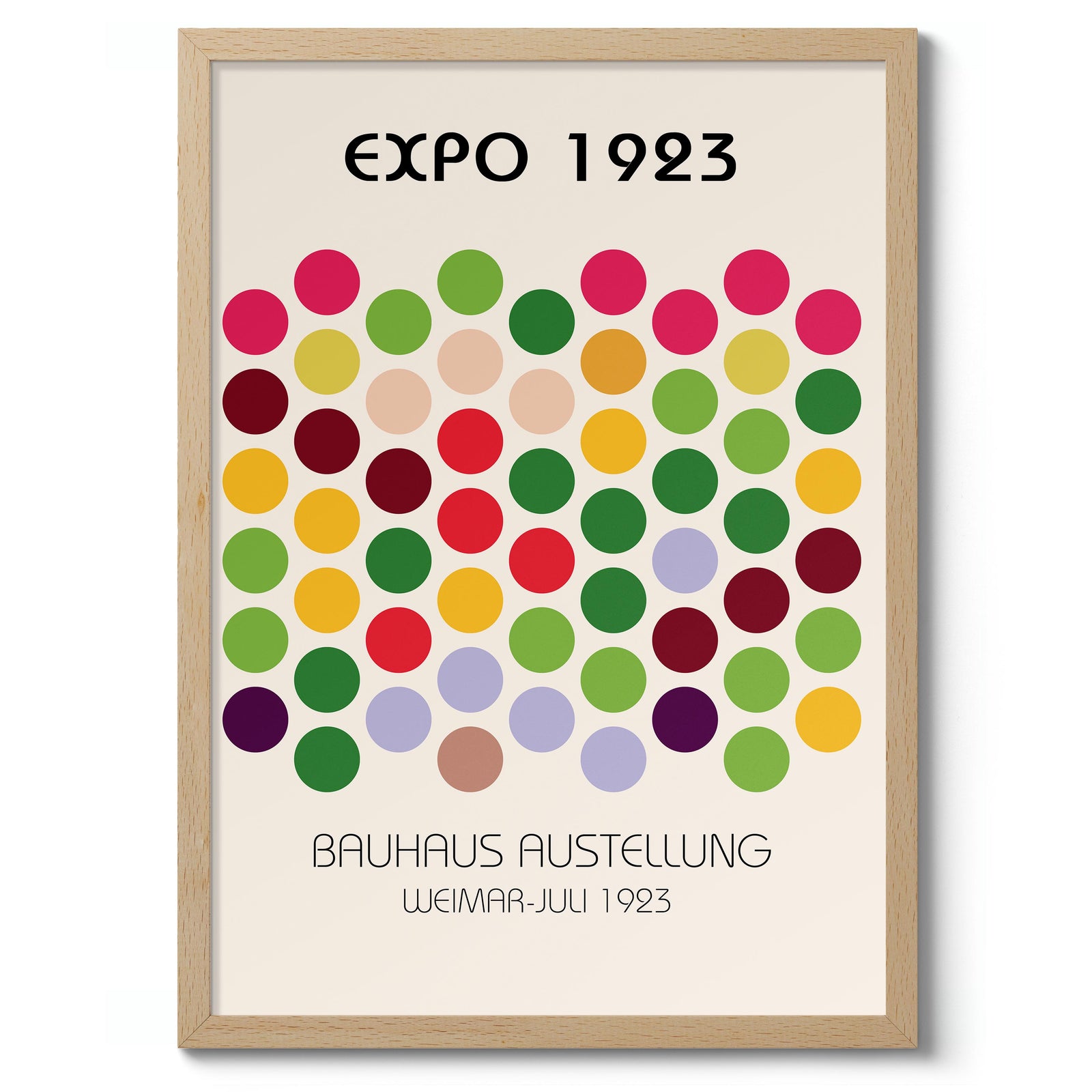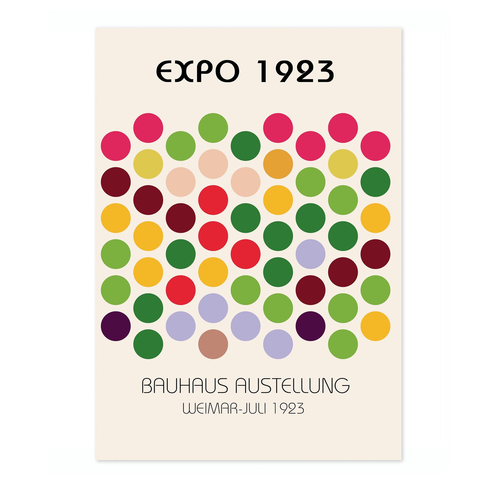 The "Expo 1923" poster features a vibrant array of colourful circles arranged in a geometric pattern, evoking mid-century Bauhaus design principles. The bold, abstract composition is complemented by minimalist typography, making it an ideal addition for enthusiasts of graphic and geometric art. Perfect for adding a historical and artistic statement to any room.