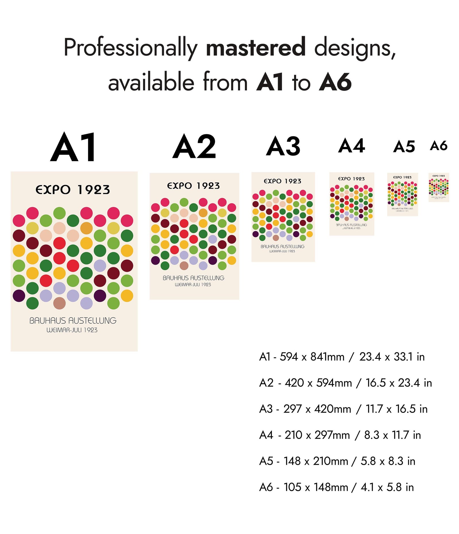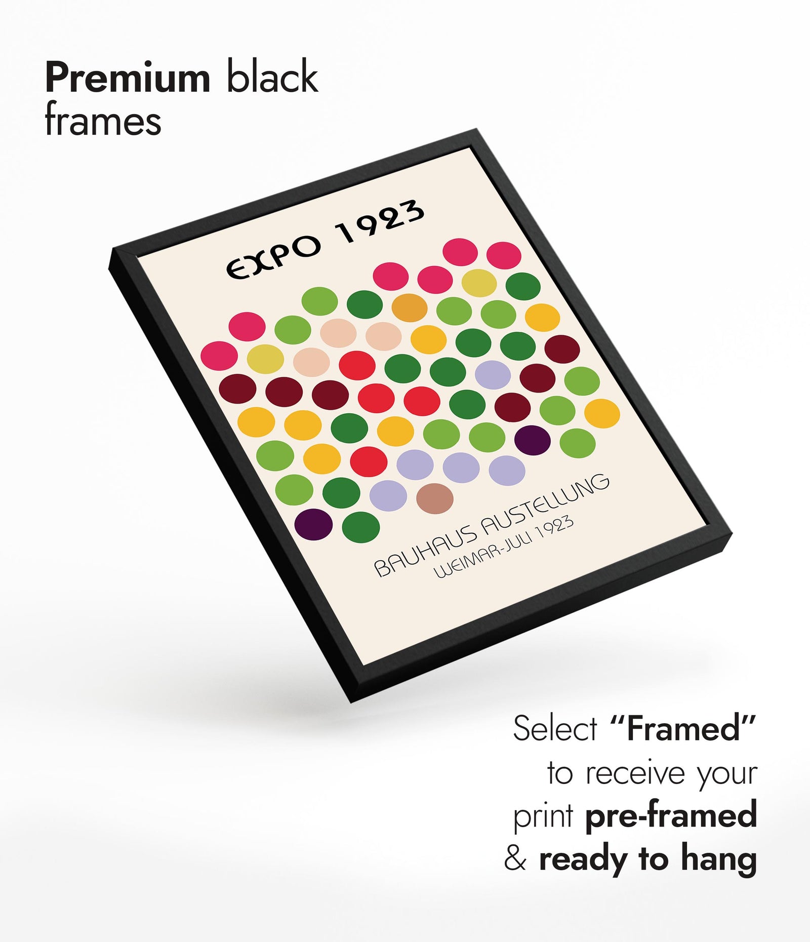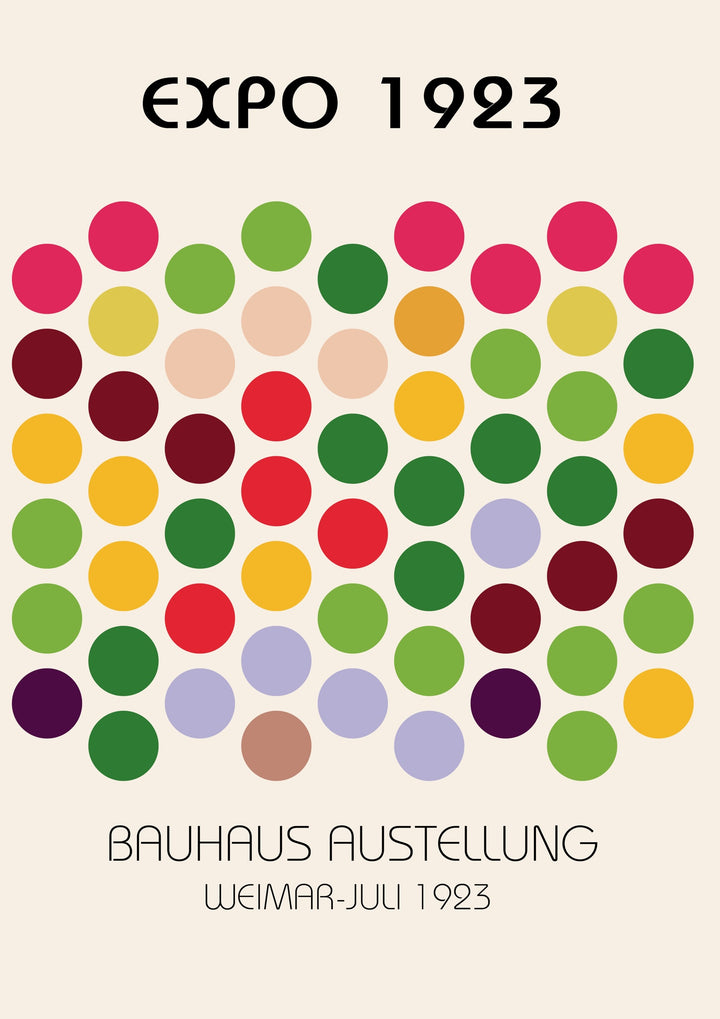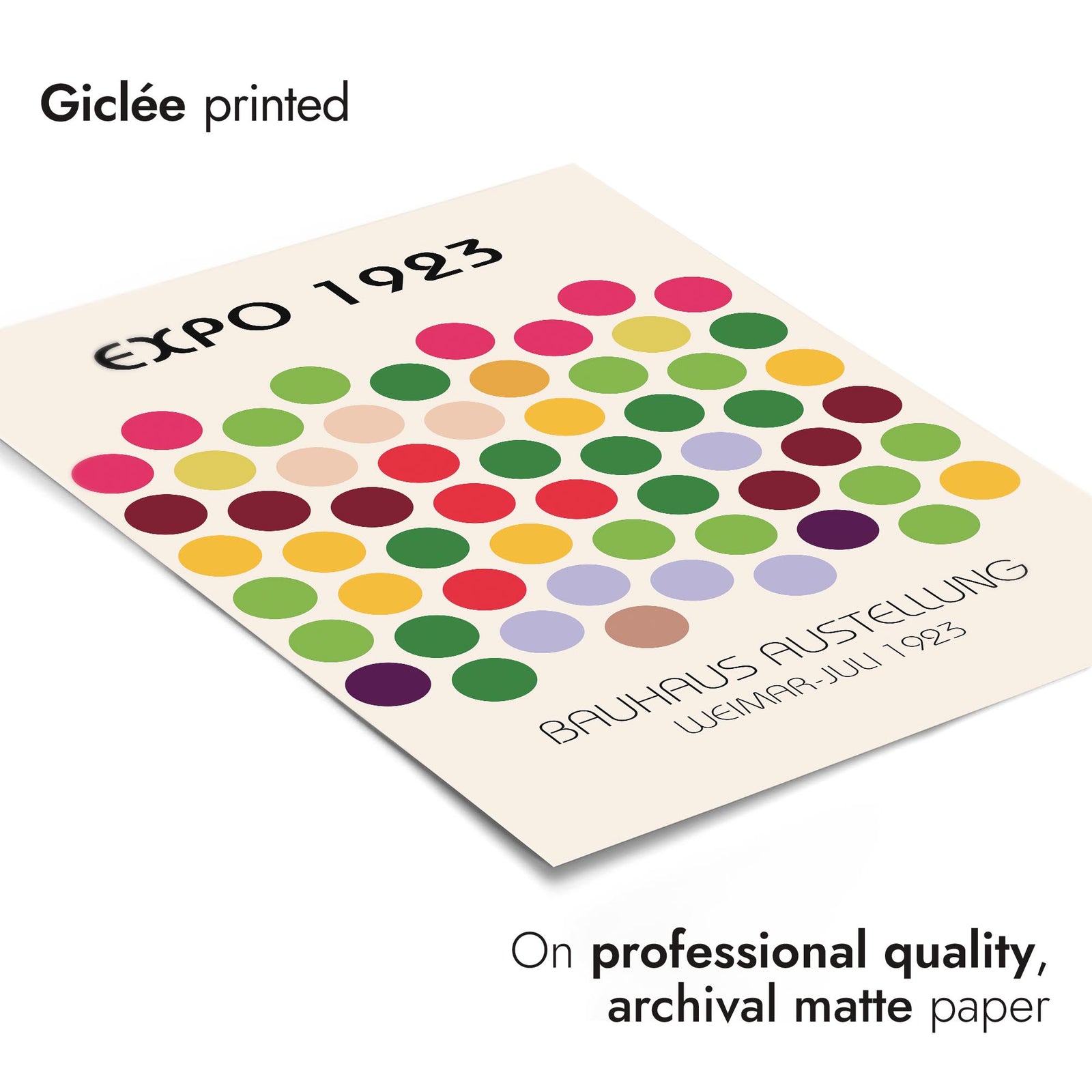 The "Expo 1923" poster features a vibrant array of colourful circles arranged in a geometric pattern, evoking mid-century Bauhaus design principles. The bold, abstract composition is complemented by minimalist typography, making it an ideal addition for enthusiasts of graphic and geometric art. Perfect for adding a historical and artistic statement to any room.