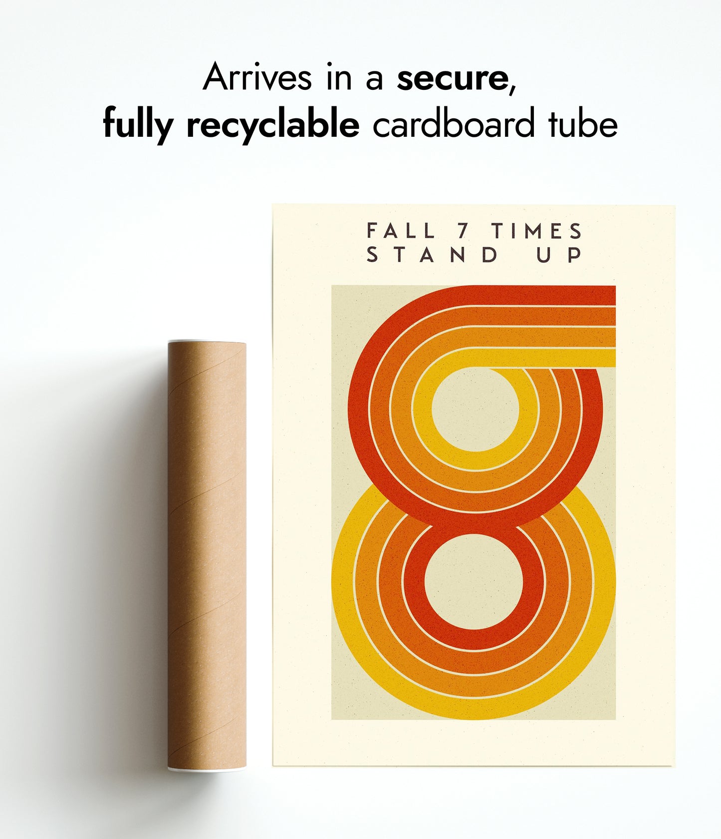 This "Fall 7 Times Stand Up" poster features an abstract design inspired by Bauhaus and modern minimalism. Dominated by concentric circles and bold linear forms, the composition uses a retro palette of orange and yellow. The poster's text embodies resilience, seamlessly blending motivational elements with geometric artistry, making it a standout piece for enthusiasts of mid-century modern design.
