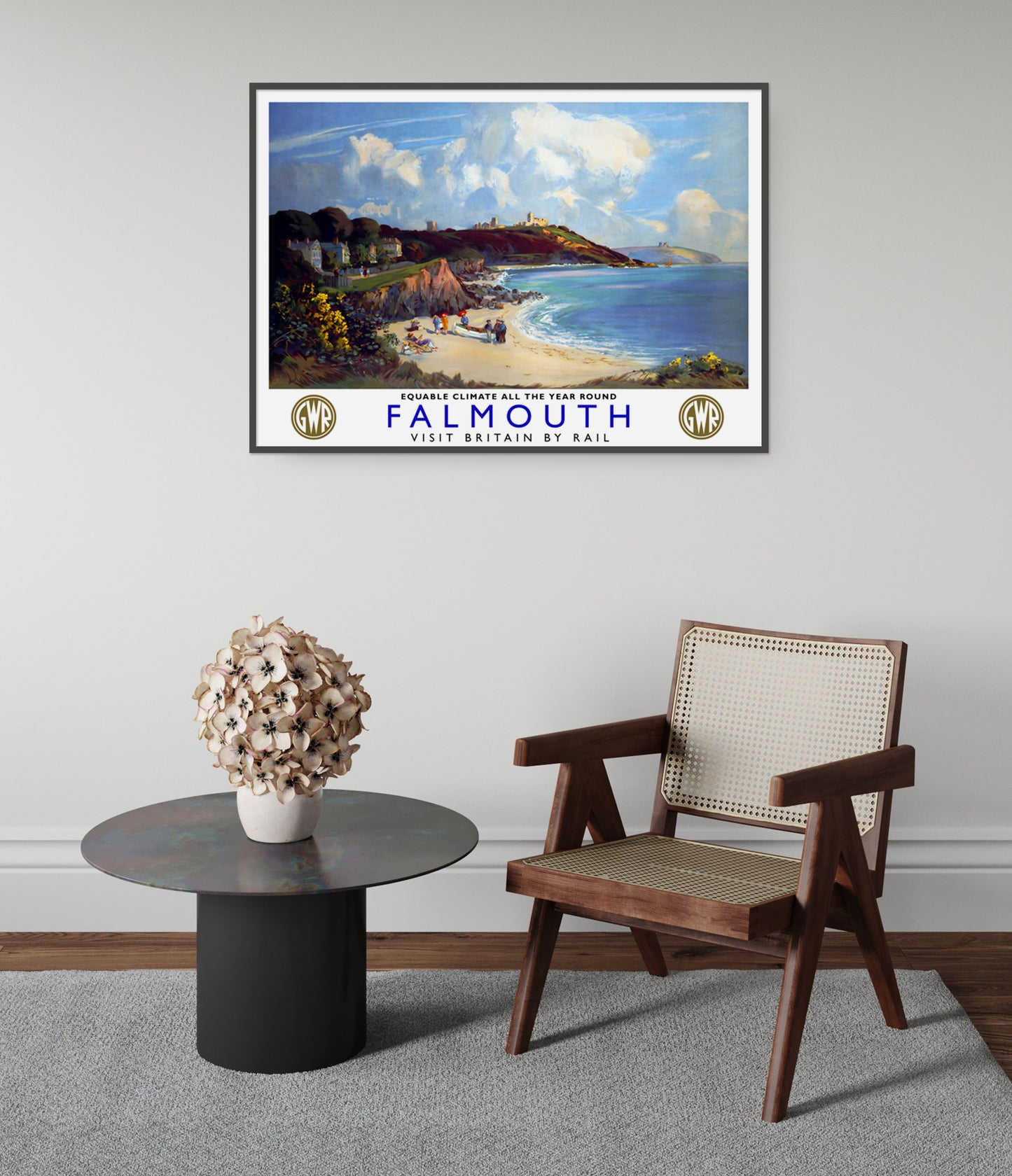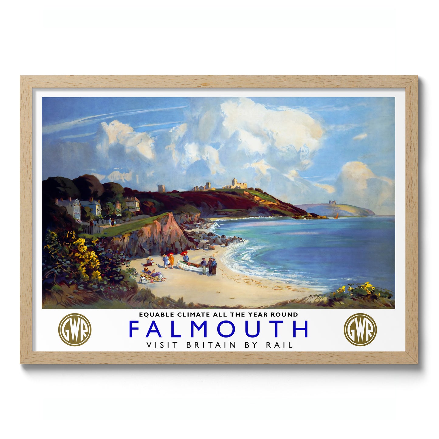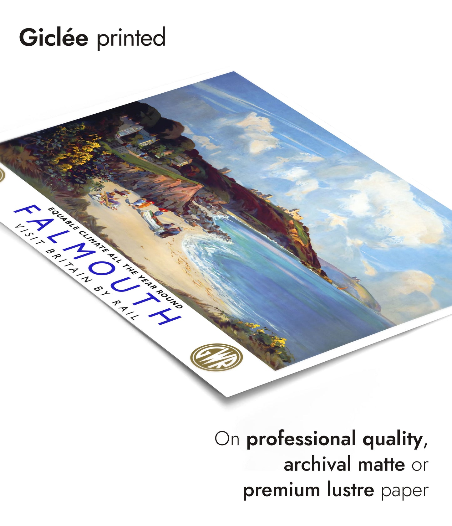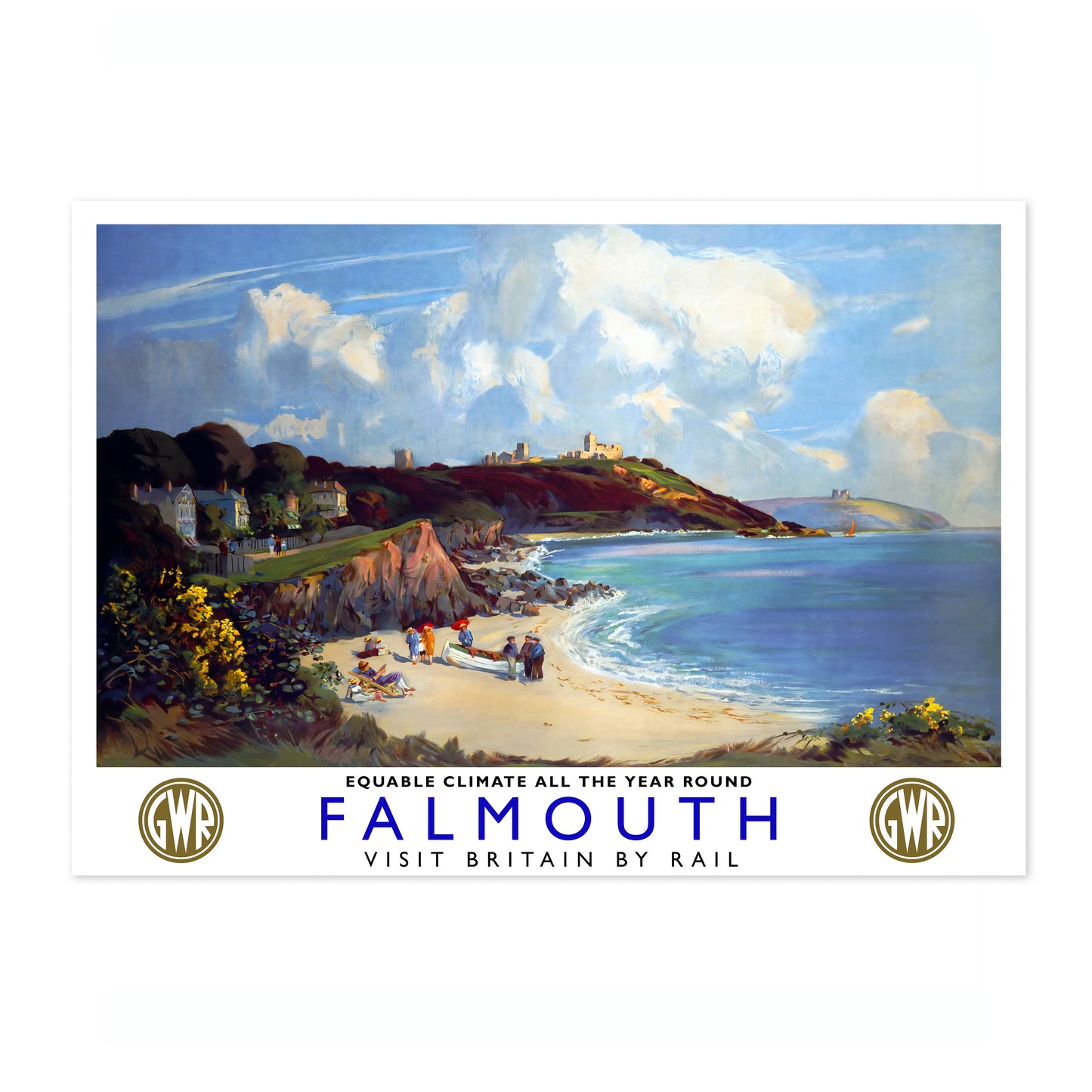 This vintage-style poster of "Falmouth" captures a serene British seaside with vibrant details. Illustrated clouds drift over a picturesque bay and sandy beach, framed by majestic cliffs. This travel poster, promoting Cornwall, England, showcases a timeless allure, inviting viewers to explore the equable climate year-round. Ideal for those passionate about classic landscape art and British coastal scenes.