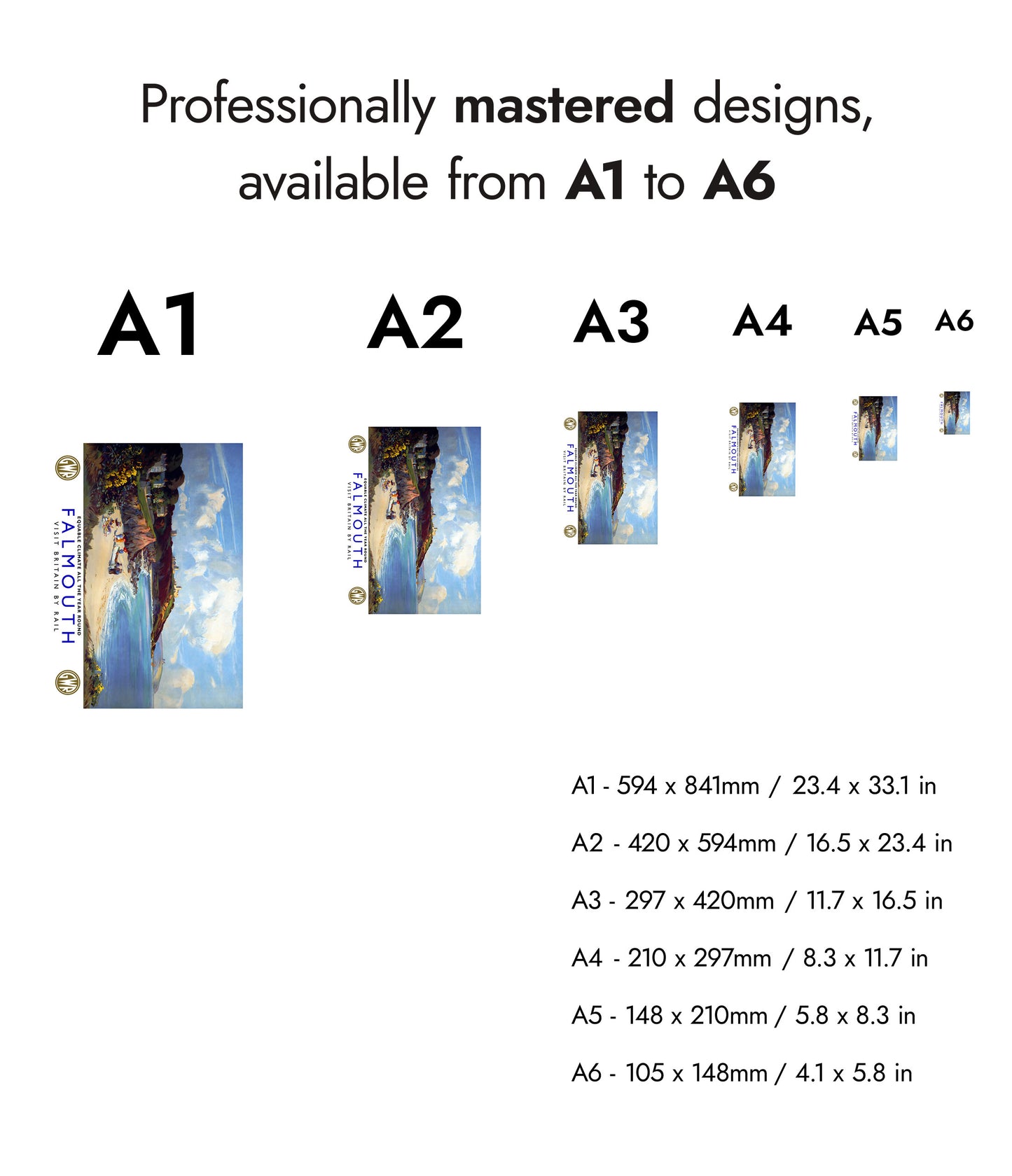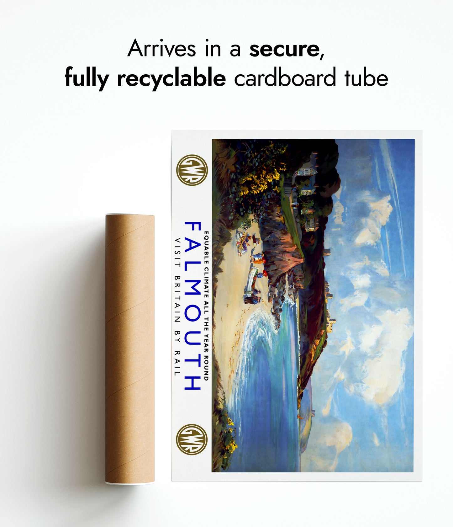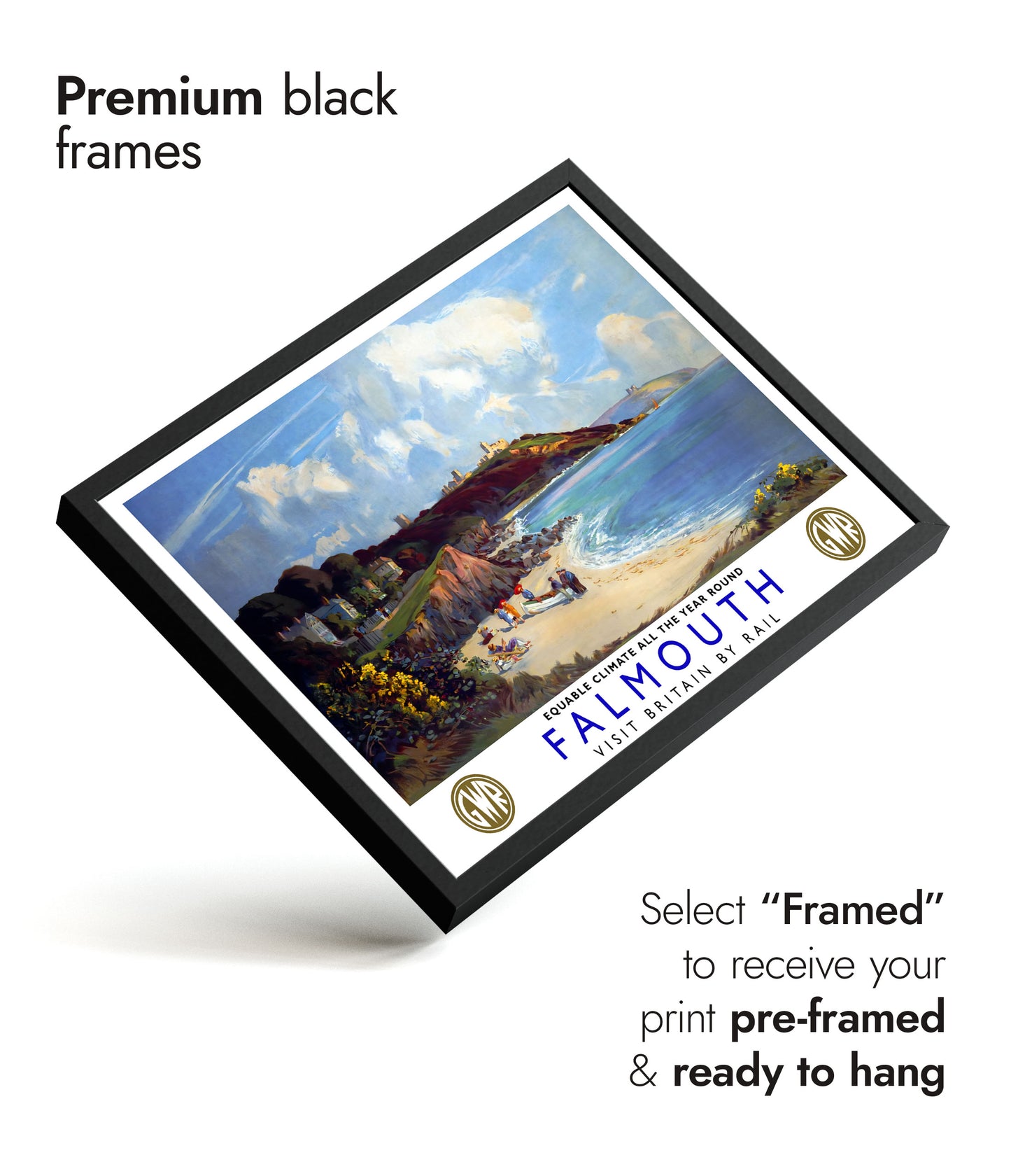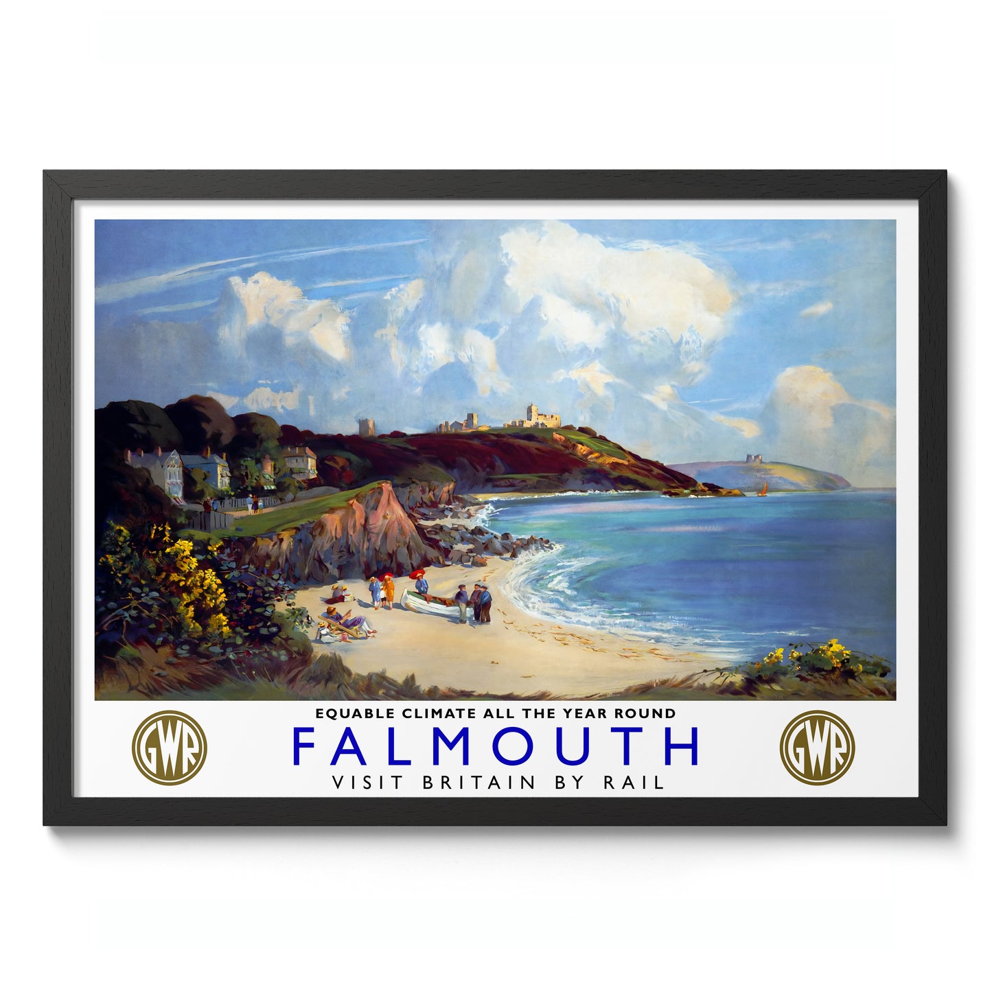 This vintage-style poster of "Falmouth" captures a serene British seaside with vibrant details. Illustrated clouds drift over a picturesque bay and sandy beach, framed by majestic cliffs. This travel poster, promoting Cornwall, England, showcases a timeless allure, inviting viewers to explore the equable climate year-round. Ideal for those passionate about classic landscape art and British coastal scenes.