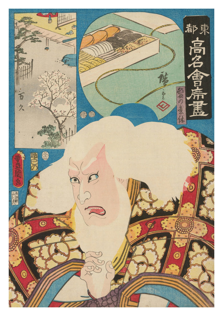 This "Famous Restaurants of the Eastern Metropolis" poster by Utagawa Kunisada showcases a traditional Japanese woodblock print. The artwork features a detailed portrait of a man in a vibrant kimono against a backdrop of iconic eateries. Rich in illustrative detail and Ukiyo-e style, this piece highlights cultural elements of Japan, perfect for those appreciating historical art.