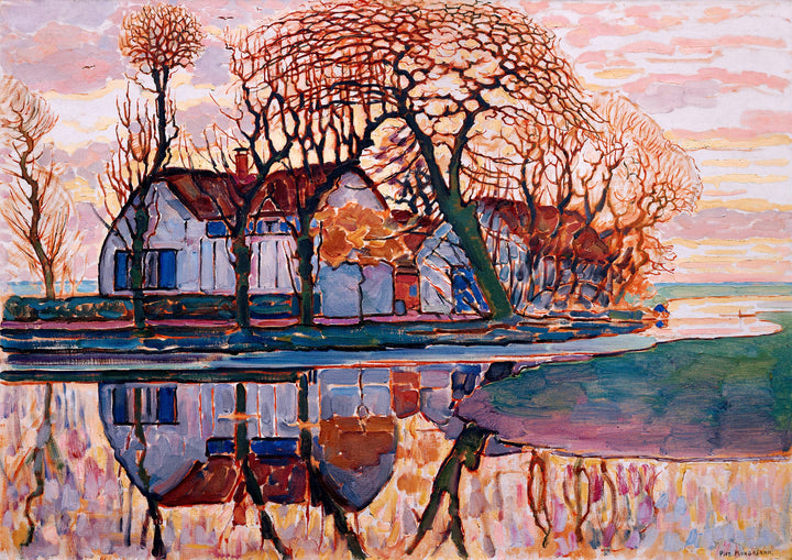 This poster of "Farm near Duivendrecht" by Piet Mondrian showcases a serene countryside scene. Captured in the Post-Impressionist style, the landscape features quaint houses and bare trees reflected in a calm pond under a colourful sunset sky. Ideal for art enthusiasts, this piece beautifully blends natural elements with a tranquil setting, making it perfect for any room.