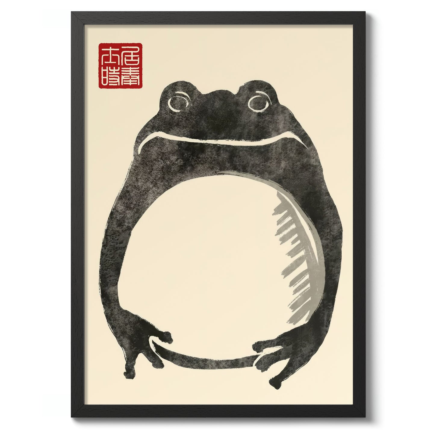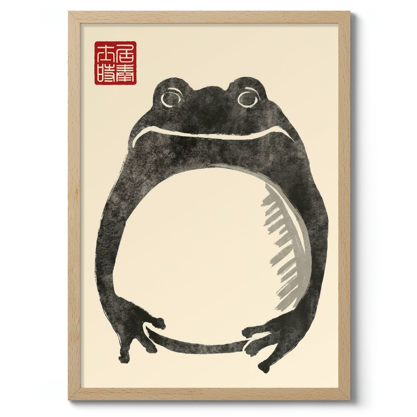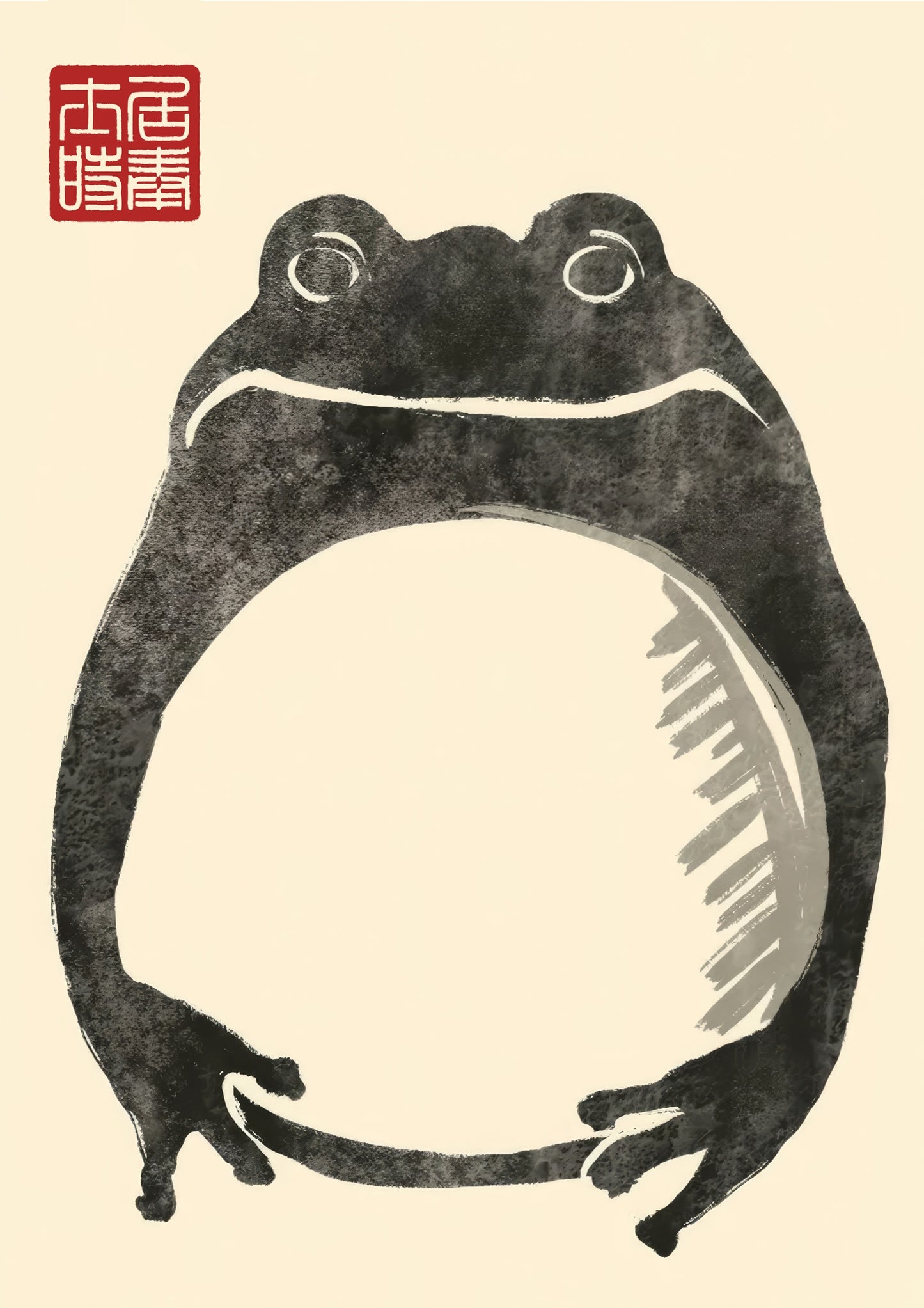 This Japanese Sumi-E style poster by Matsumoto Hoji features a minimalist "Fat Frog" design. The artwork captures the essence of traditional ink wash techniques, emphasizing simplicity with expressive brushstrokes against a beige backdrop. The frog's charming, plump form embodies a serene natural elegance, highlighted by the accompanying red Japanese seal. Perfect for art lovers seeking a nature-inspired Japanese poster.