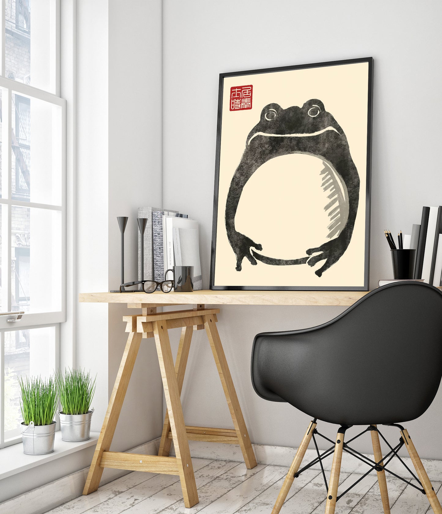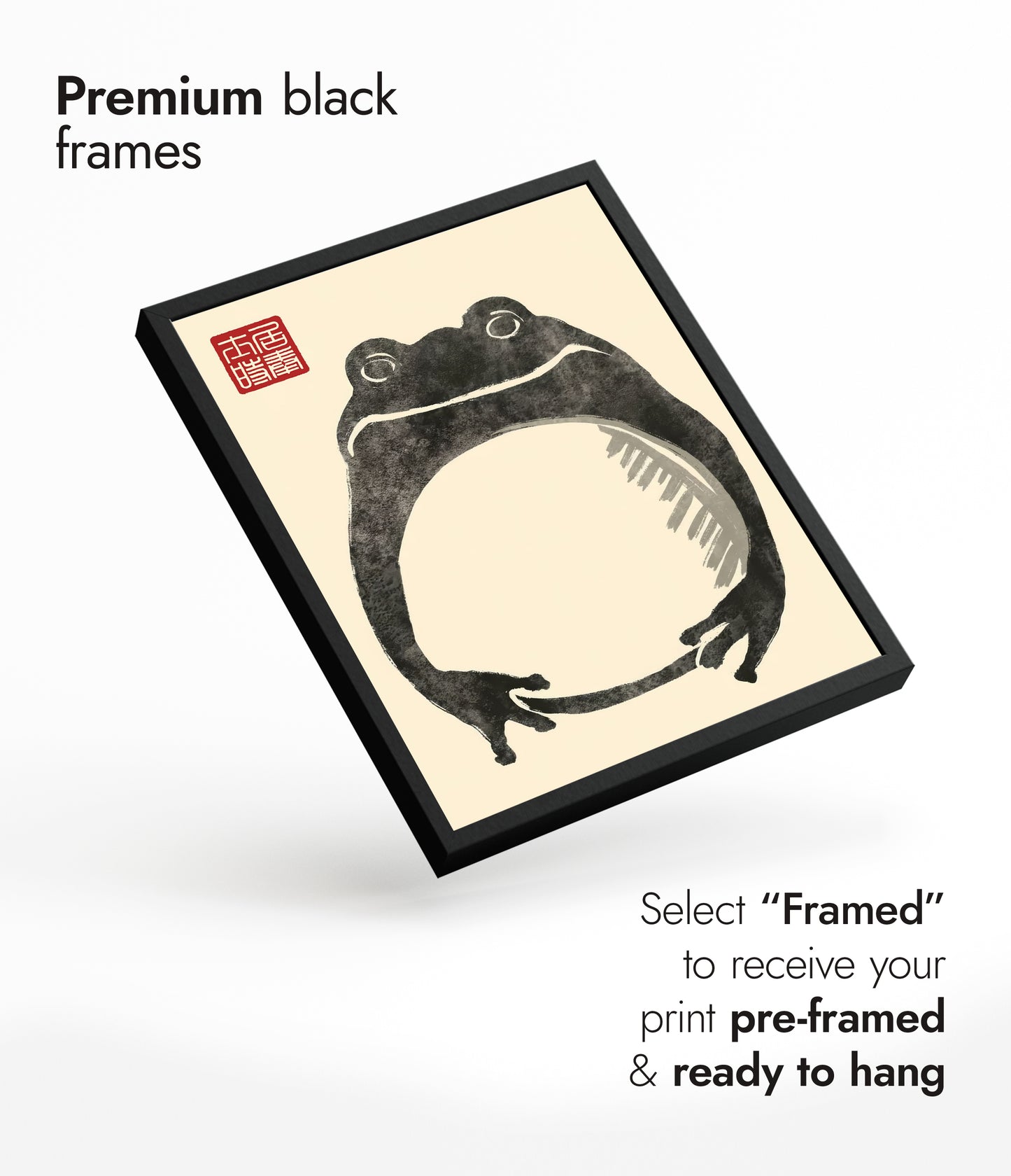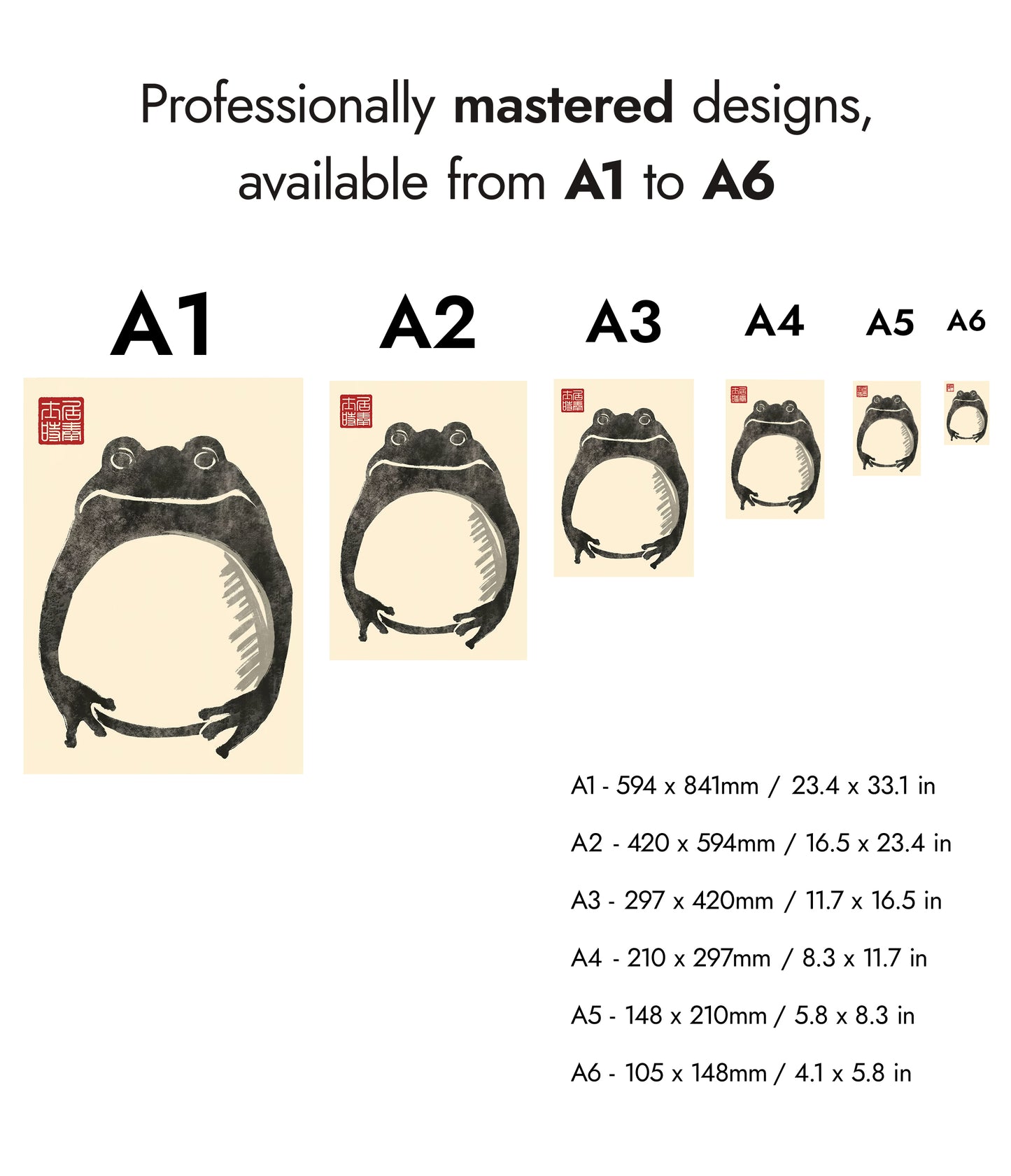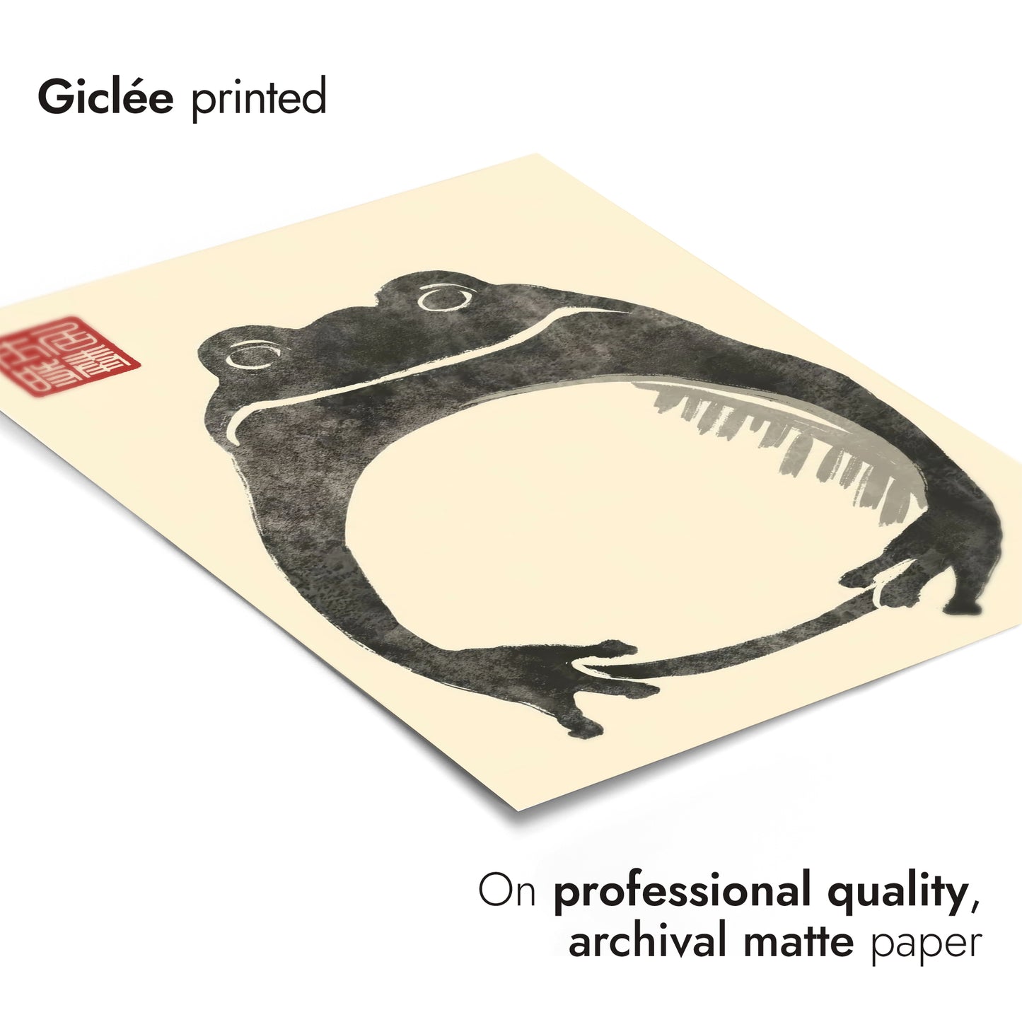 This Japanese Sumi-E style poster by Matsumoto Hoji features a minimalist "Fat Frog" design. The artwork captures the essence of traditional ink wash techniques, emphasizing simplicity with expressive brushstrokes against a beige backdrop. The frog's charming, plump form embodies a serene natural elegance, highlighted by the accompanying red Japanese seal. Perfect for art lovers seeking a nature-inspired Japanese poster.
