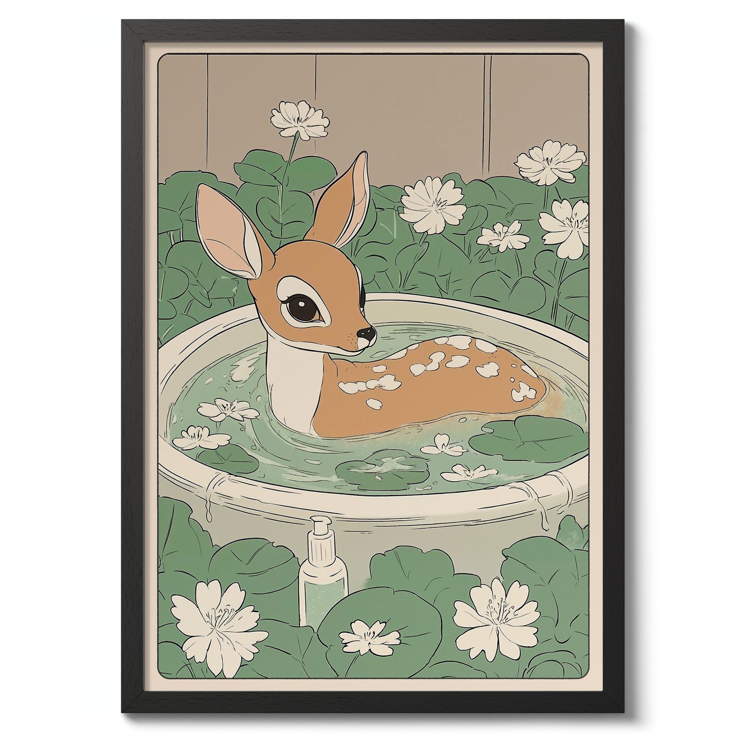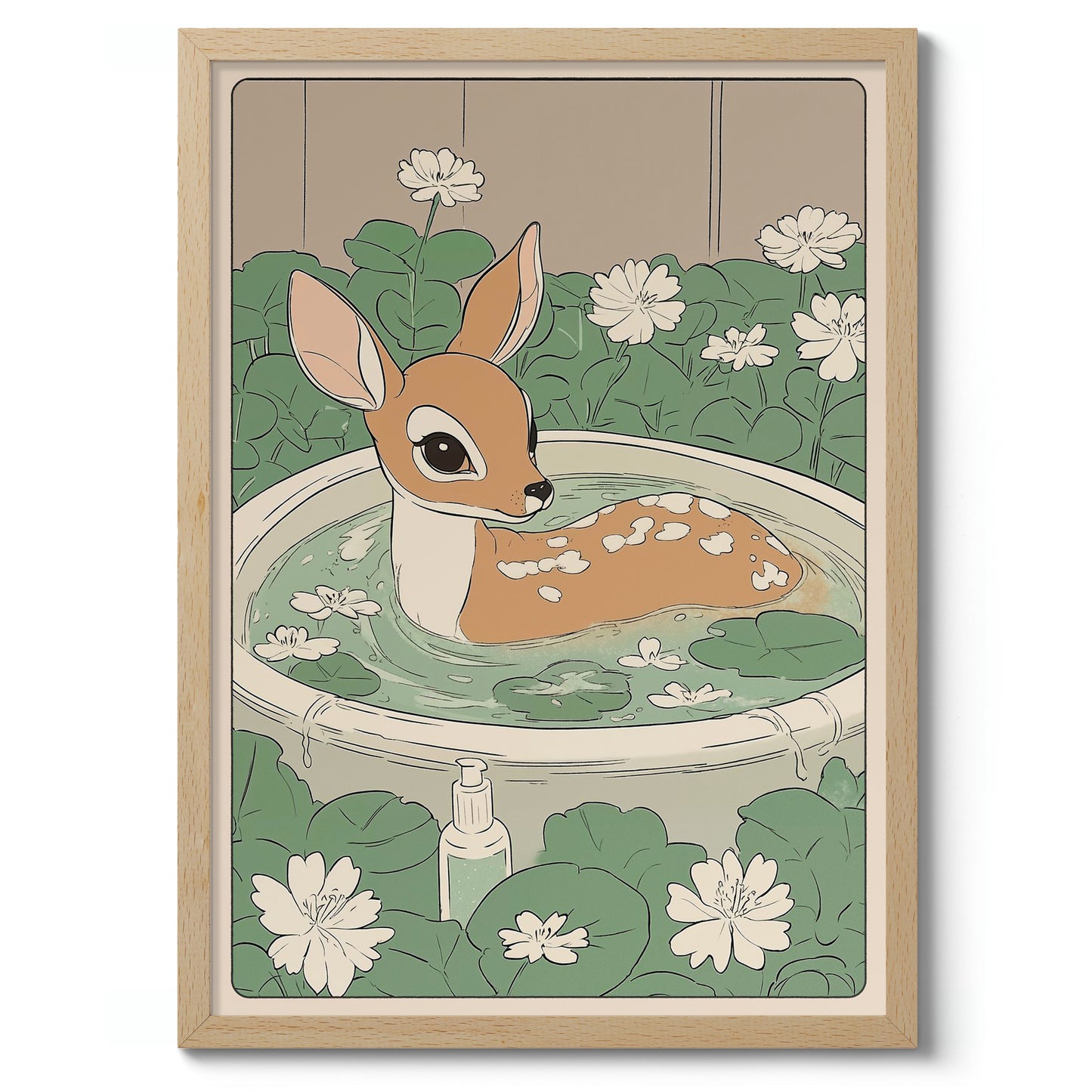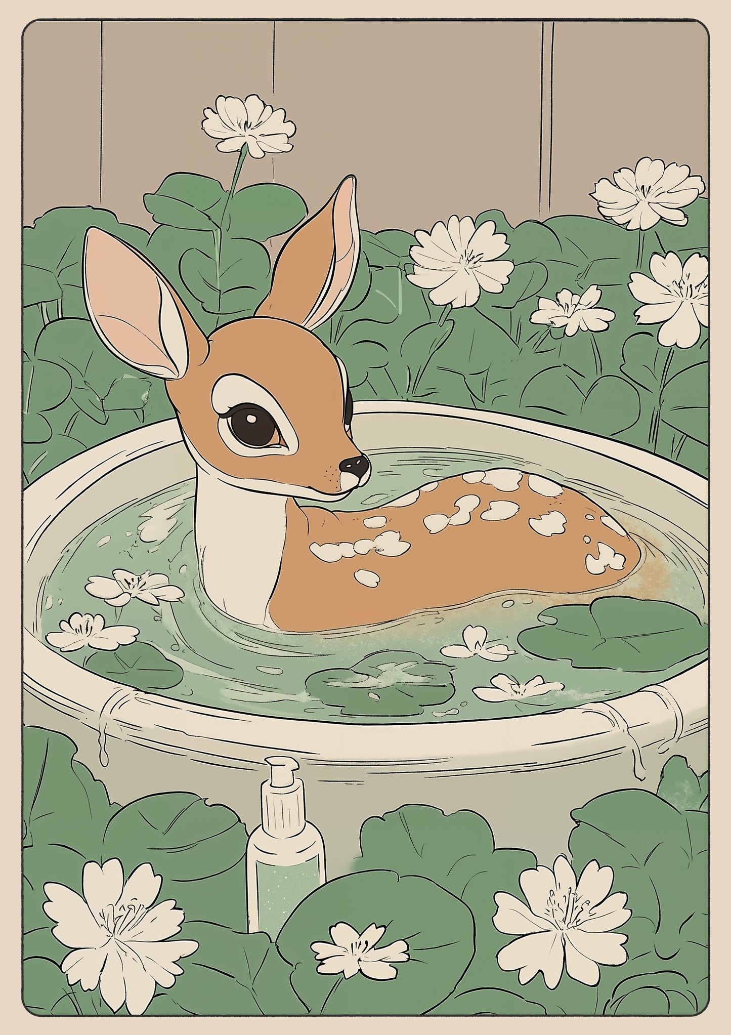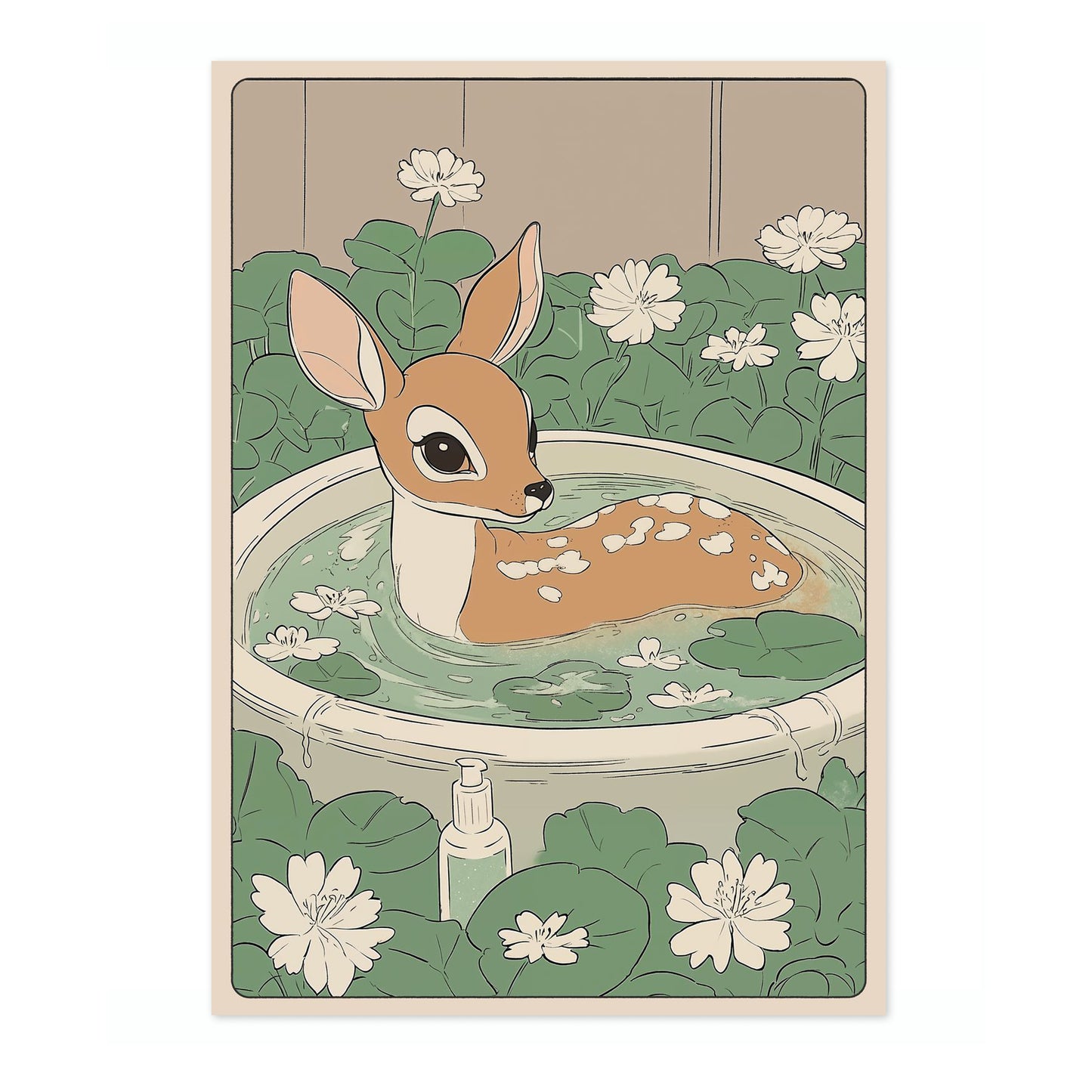 "Fawn Bathtime" poster features an adorable fawn luxuriating in a serene garden tub, surrounded by delicate white flowers and lush green leaves. Rendered in a Japanese woodblock-inspired style, this anime illustration captures tranquility and nature's innocence. The soft beige palette enhances the gentle, soothing atmosphere, making it an ideal addition for anime and nature enthusiasts.
