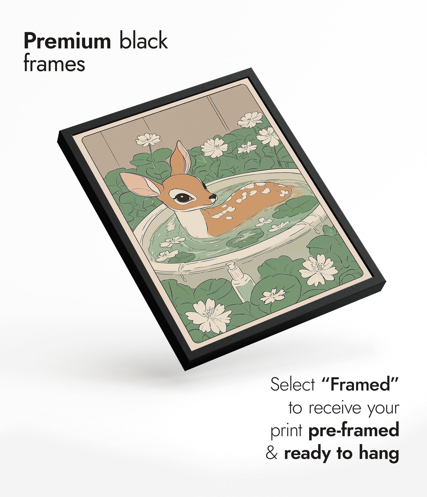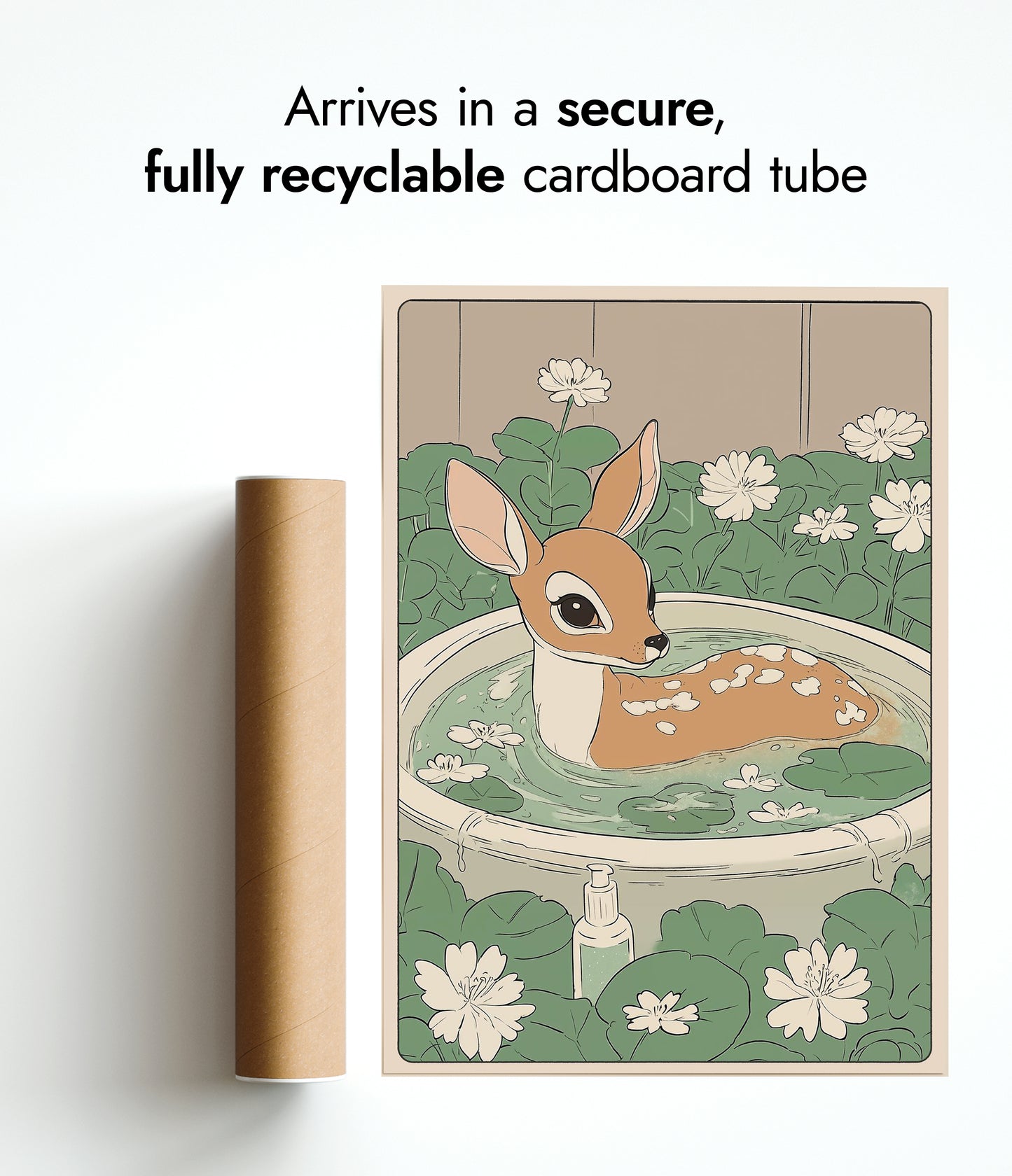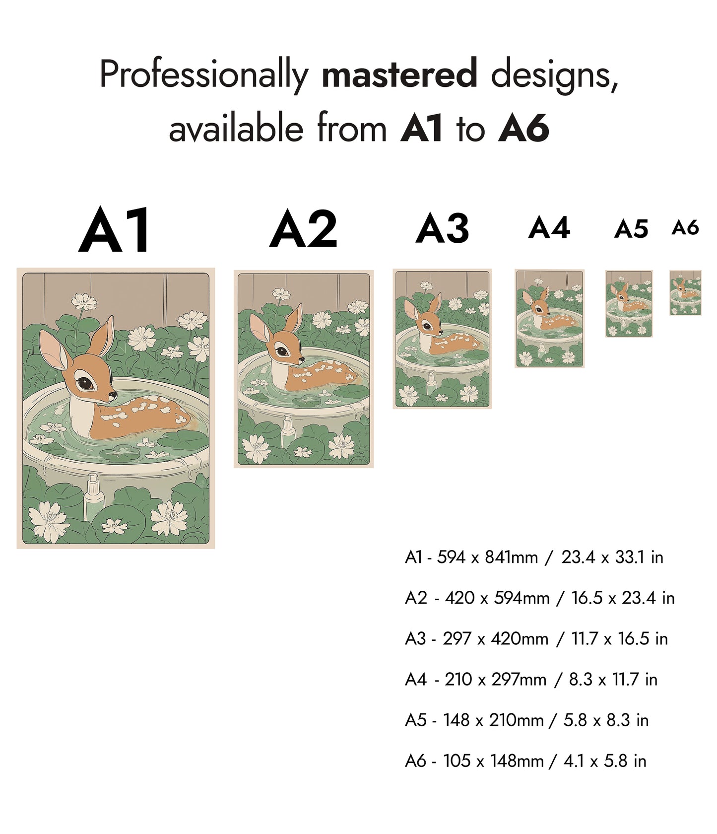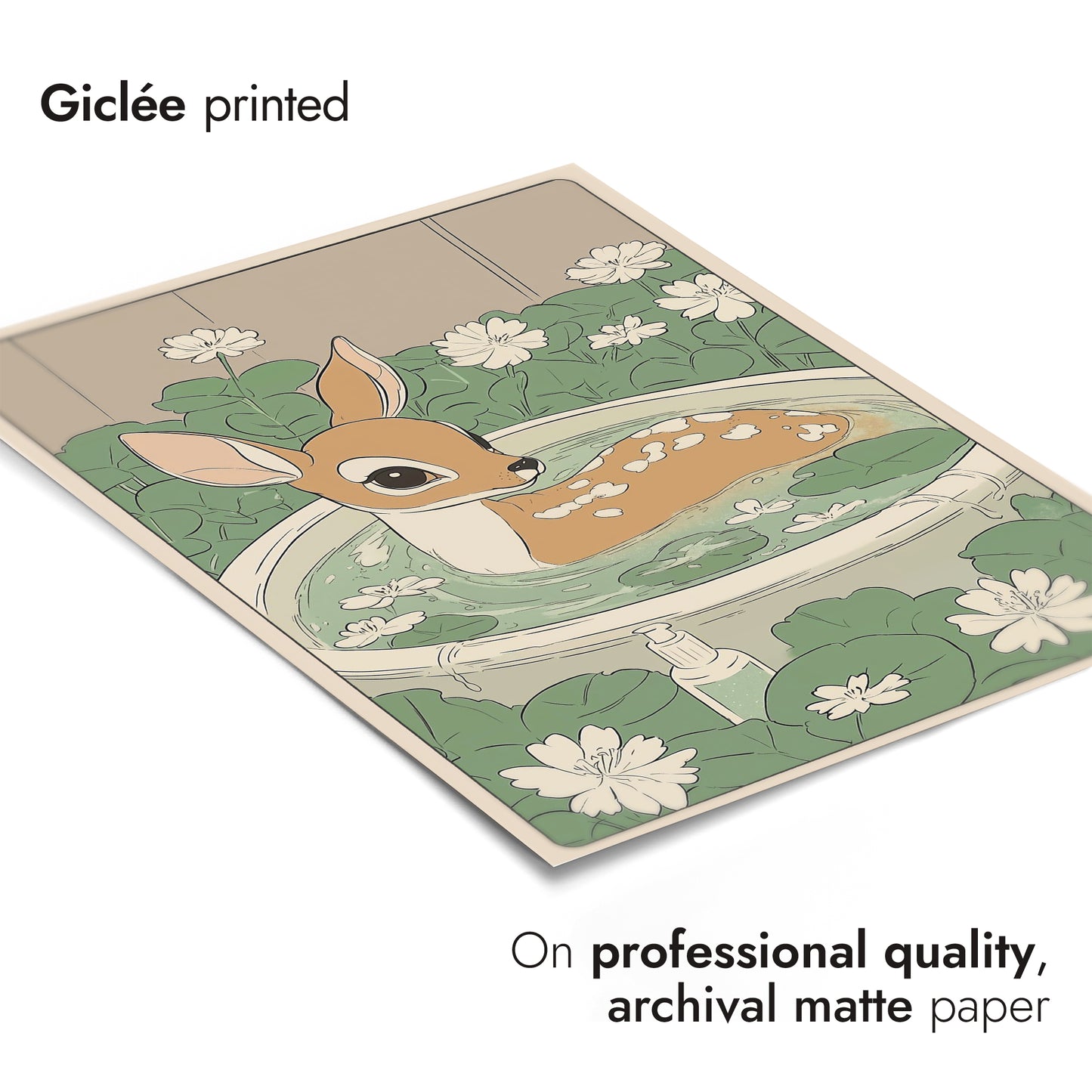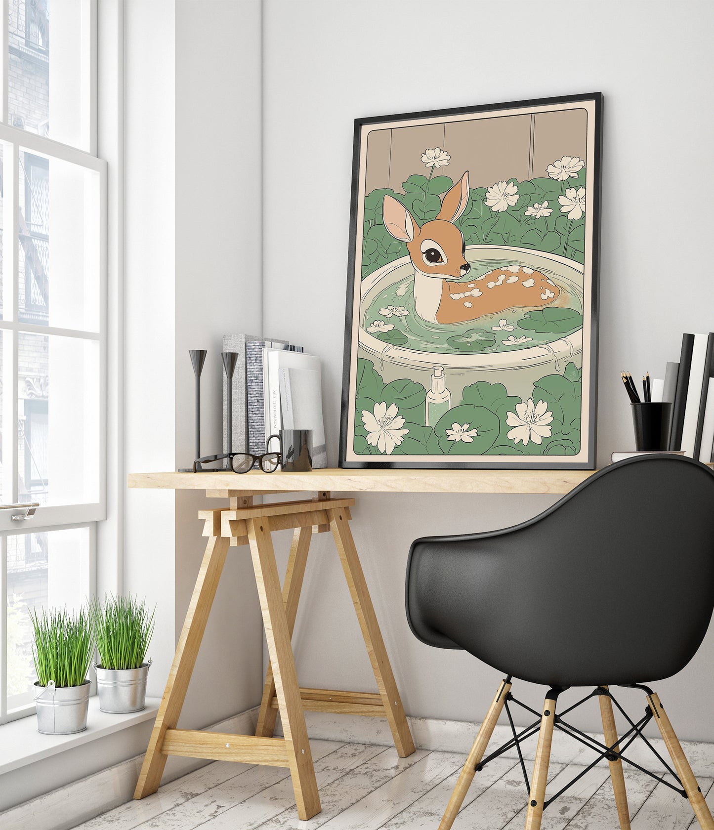 "Fawn Bathtime" poster features an adorable fawn luxuriating in a serene garden tub, surrounded by delicate white flowers and lush green leaves. Rendered in a Japanese woodblock-inspired style, this anime illustration captures tranquility and nature's innocence. The soft beige palette enhances the gentle, soothing atmosphere, making it an ideal addition for anime and nature enthusiasts.
