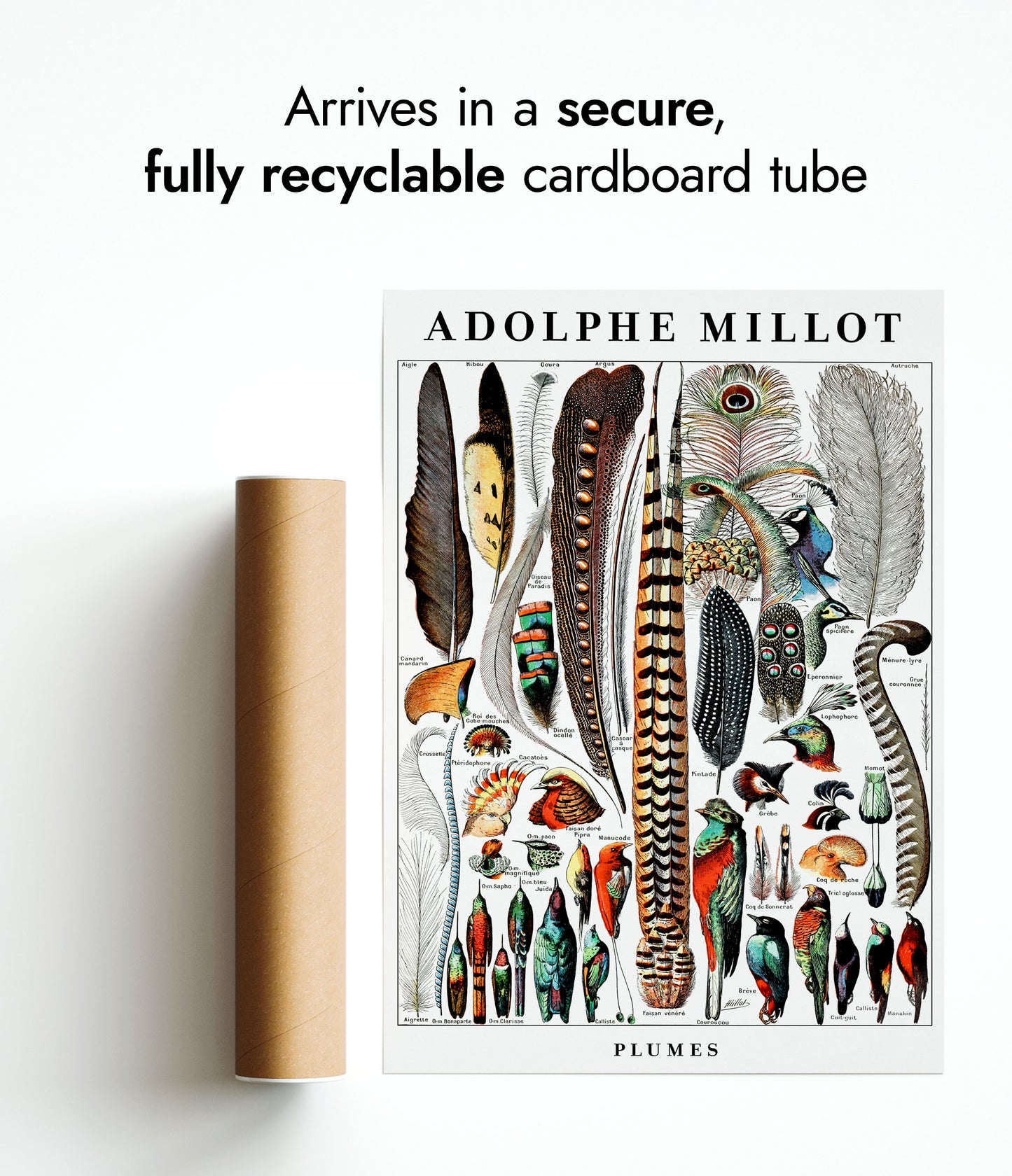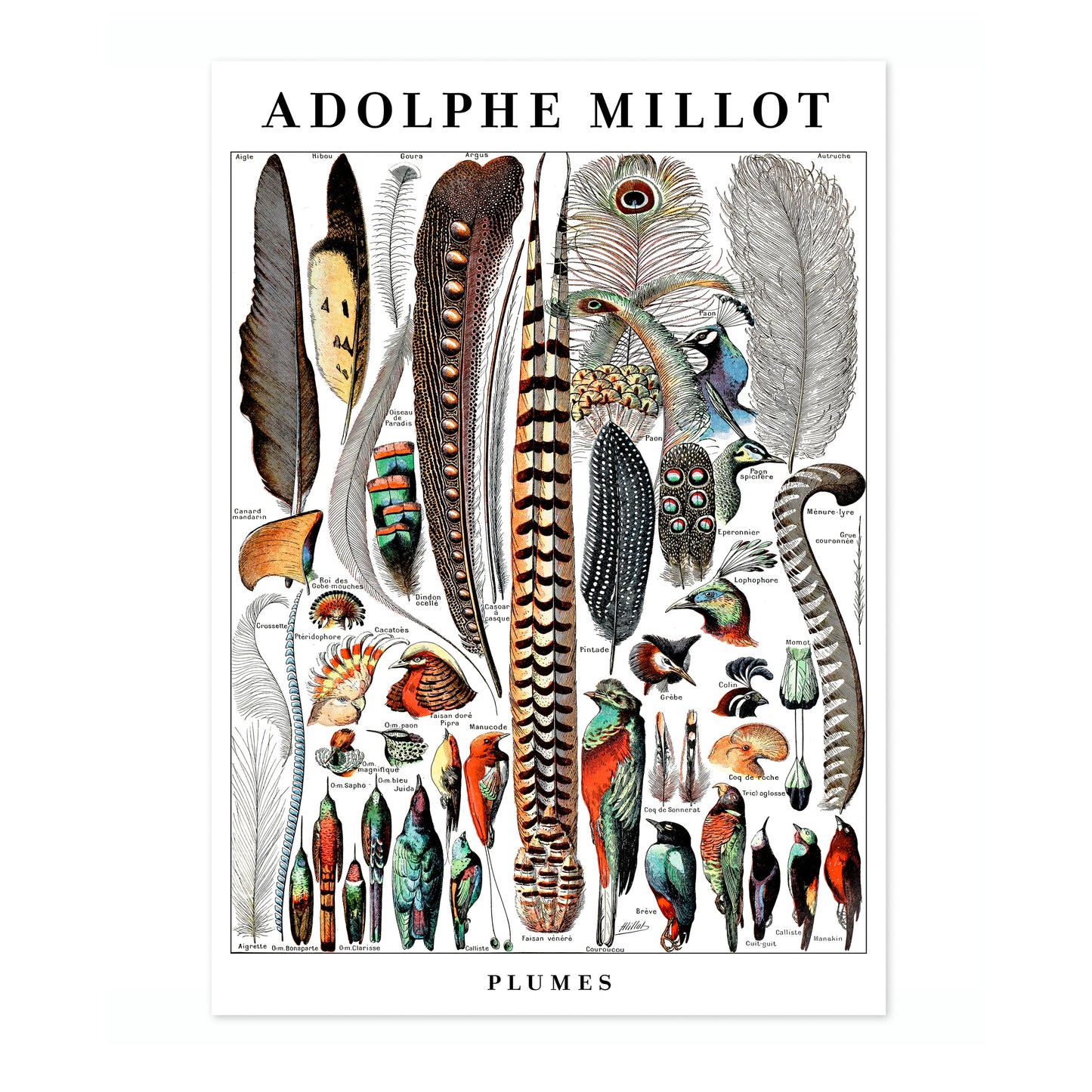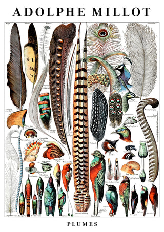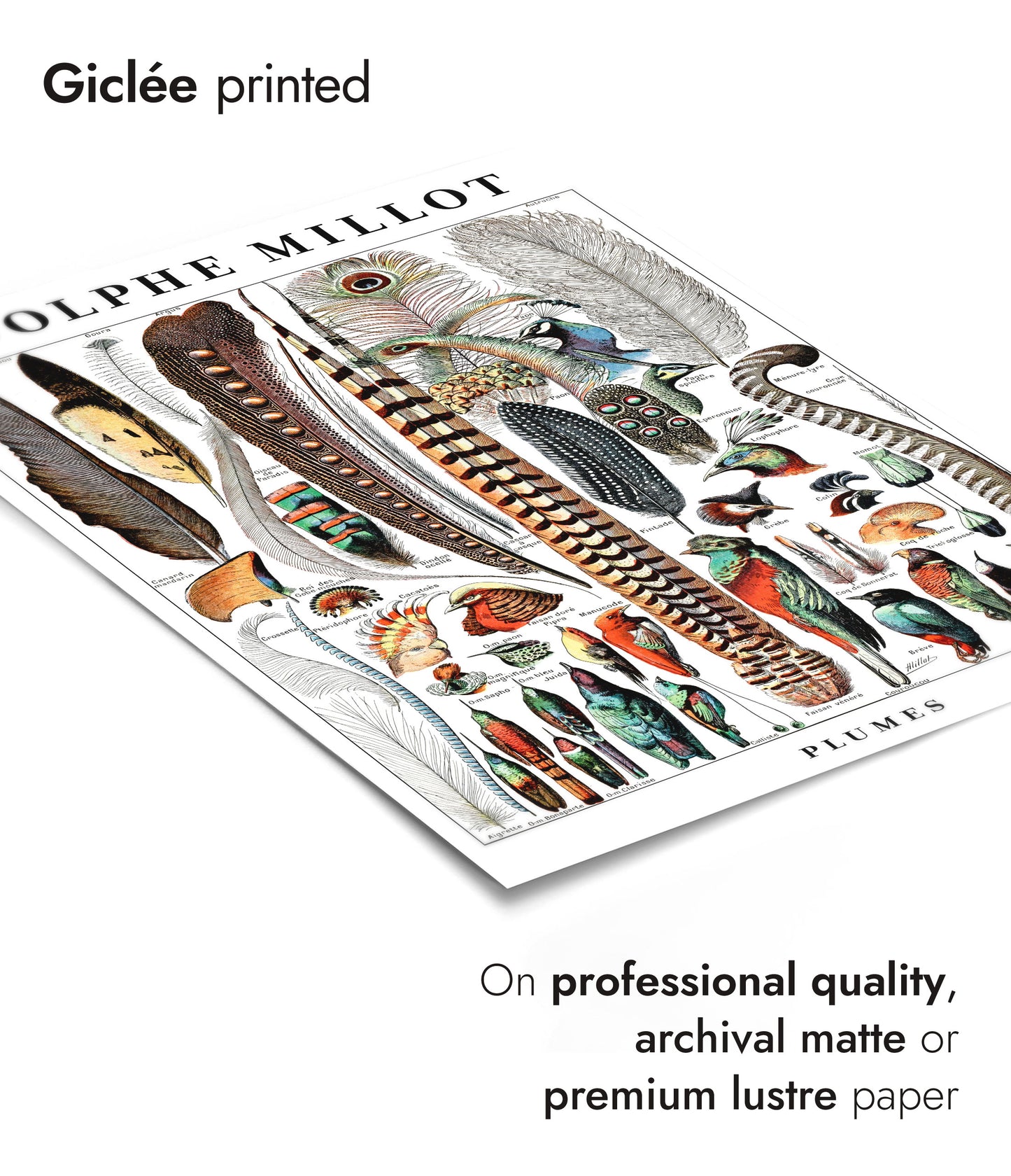 Discover the intricate beauty of avian life with Adolphe Millot's "Feathers" poster. This vintage illustration masterfully details a variety of bird feathers, showcasing their diverse textures and patterns. Ideal for nature and zoology enthusiasts, this artwork captures the essence of ornithological beauty. Perfect for adding a touch of sophistication to any space.