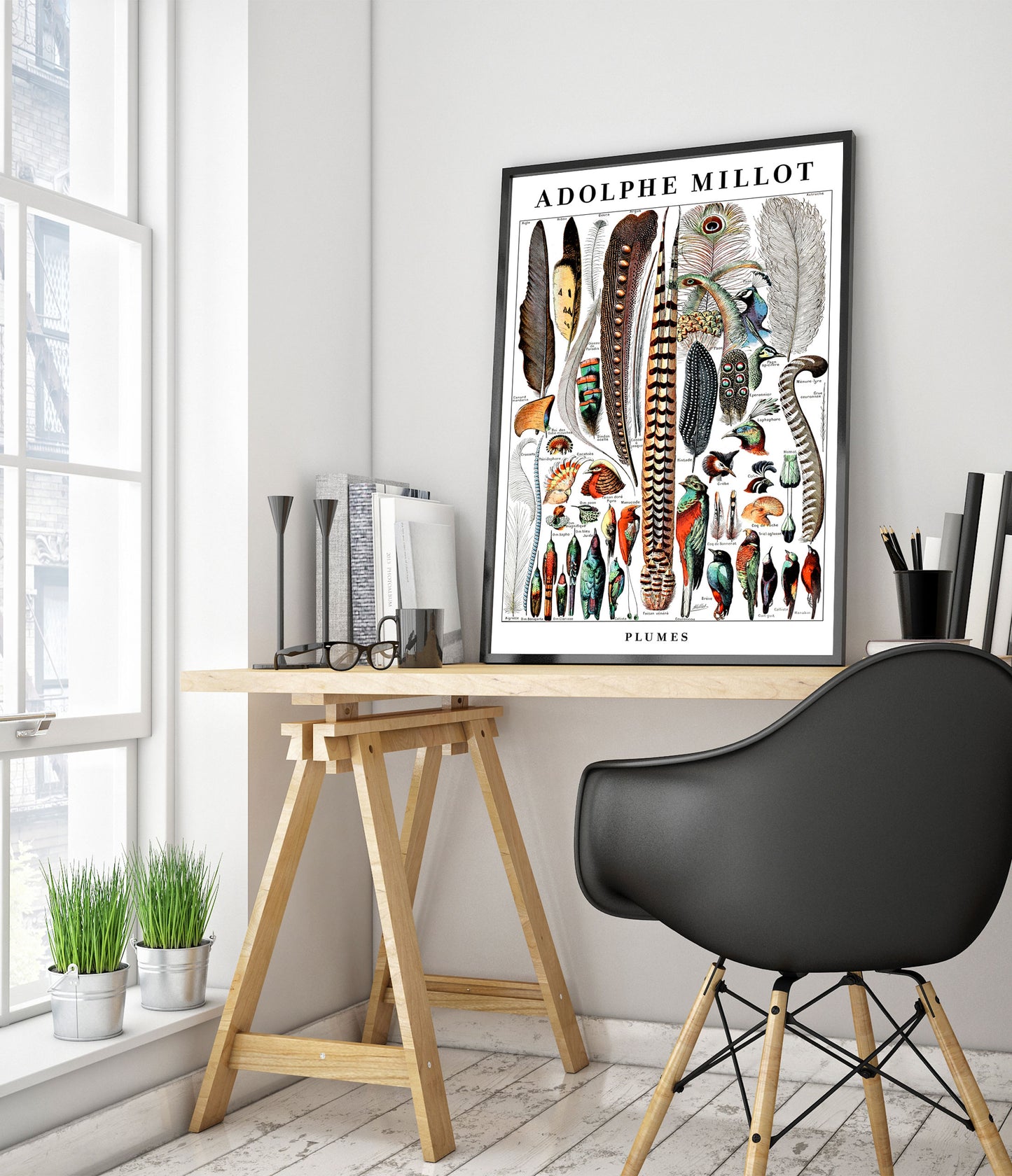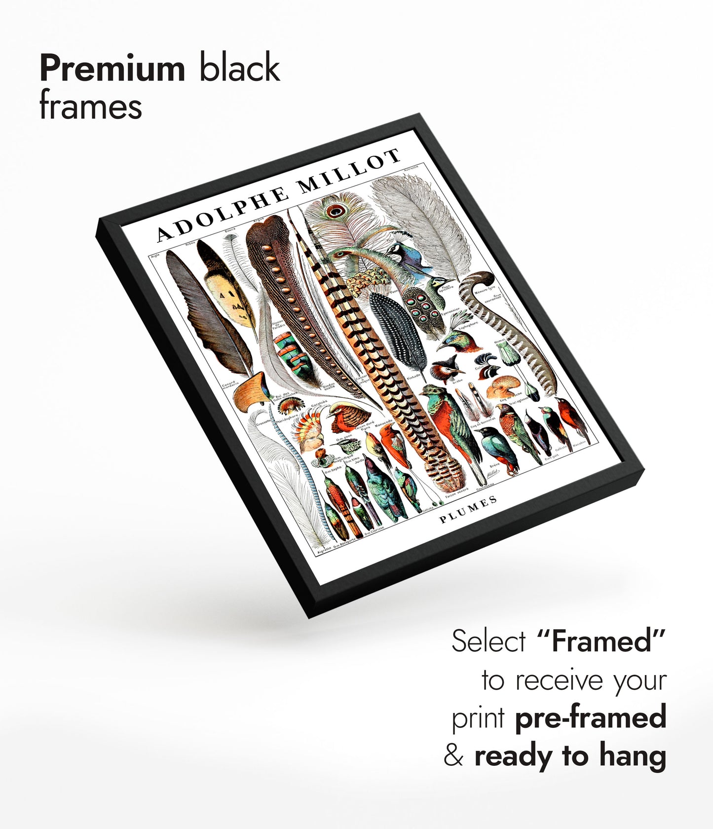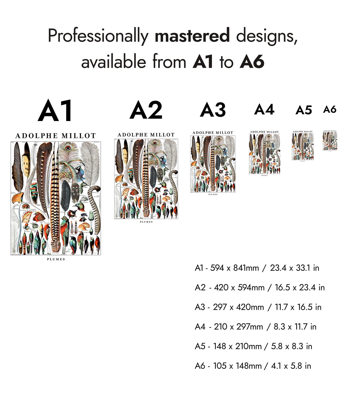 Discover the intricate beauty of avian life with Adolphe Millot's "Feathers" poster. This vintage illustration masterfully details a variety of bird feathers, showcasing their diverse textures and patterns. Ideal for nature and zoology enthusiasts, this artwork captures the essence of ornithological beauty. Perfect for adding a touch of sophistication to any space.