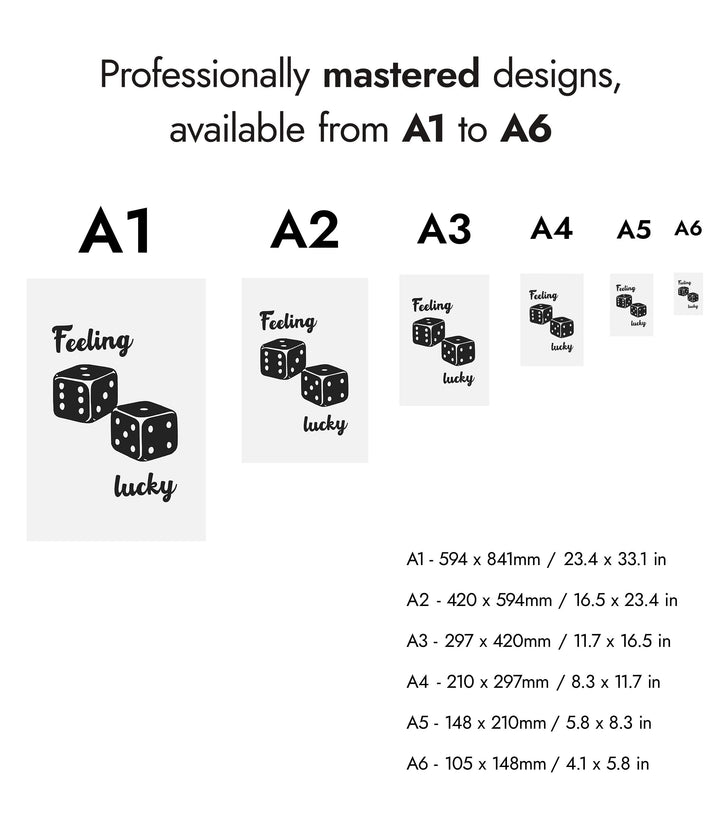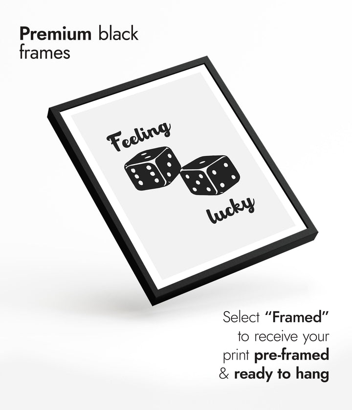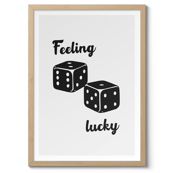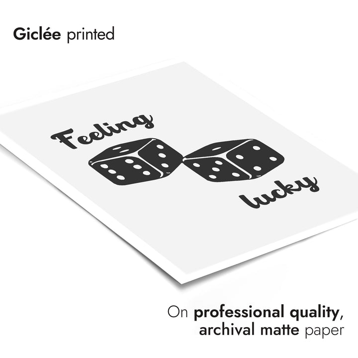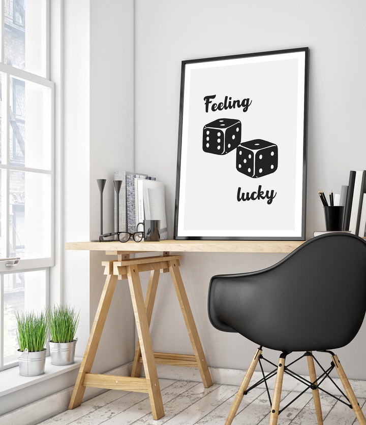 The "Feeling Lucky" poster features bold black dice against a white background, accompanied by playful, stylized typography that reads "Feeling lucky." This graphic-style portrait is perfect for game enthusiasts and those who enjoy casino-themed decor. The minimalist design emphasizes luck and chance, making it a standout piece for any modern space.