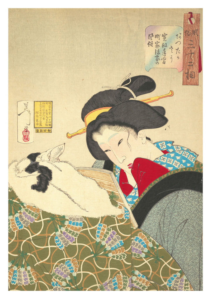 This elegant poster titled "Feeling Warm" by Tsukioka Yoshitoshi showcases a serene woman dressed in a traditional kimono reading a book, with a cat curling up on her lap. This traditional woodblock print beautifully captures the essence of Ukiyo-E art, reflecting tranquility and intimacy. The intricate patterns and calm colour palette enhance the timeless charm of this Japanese illustration.