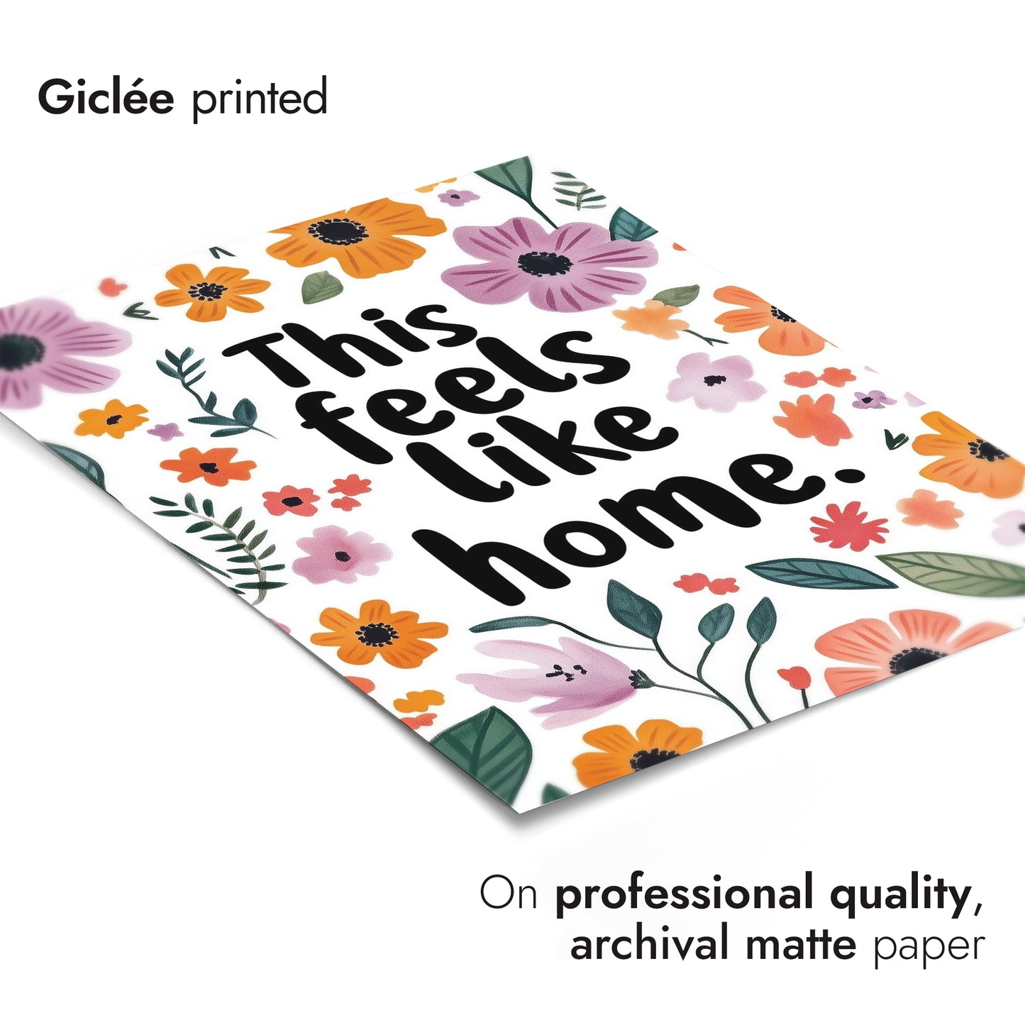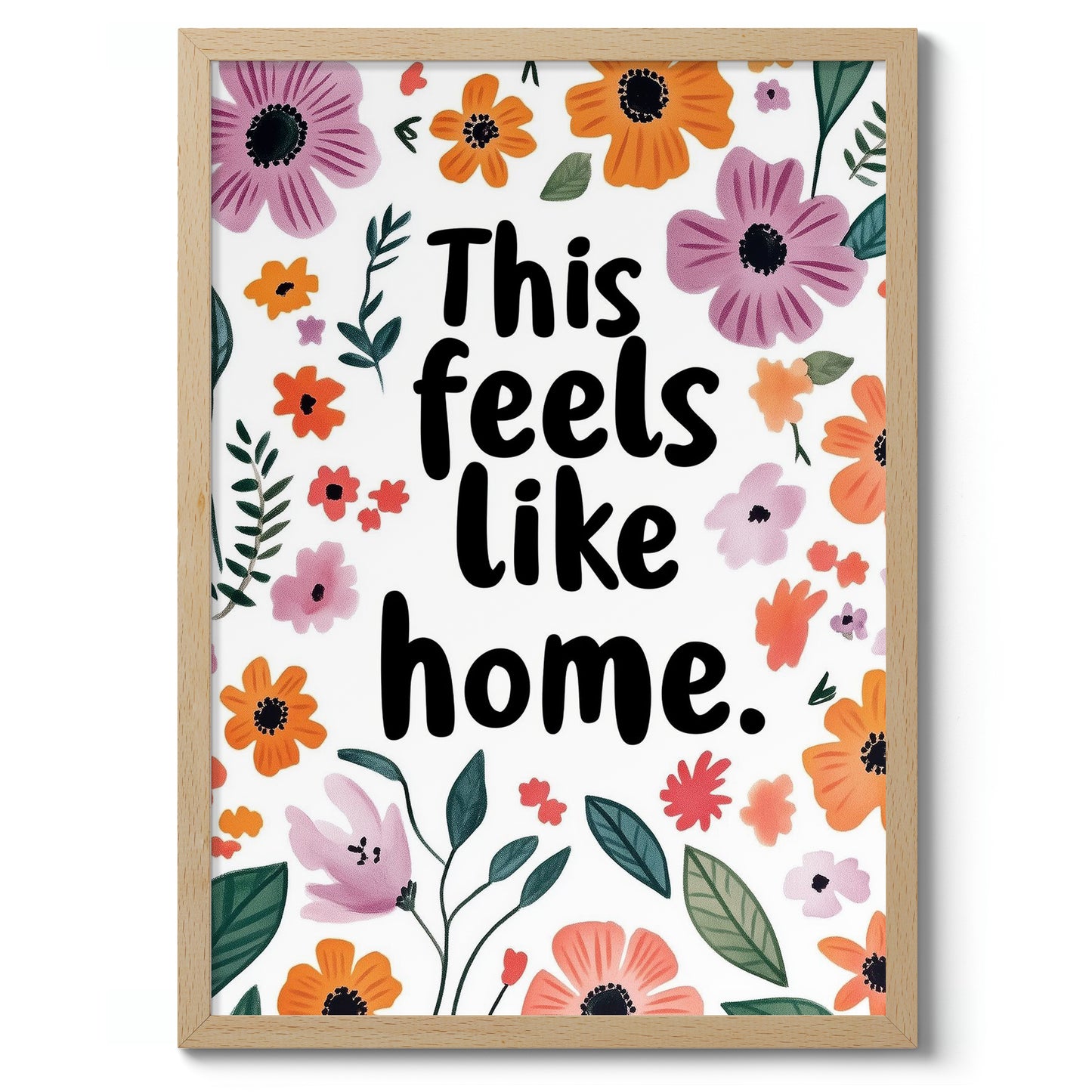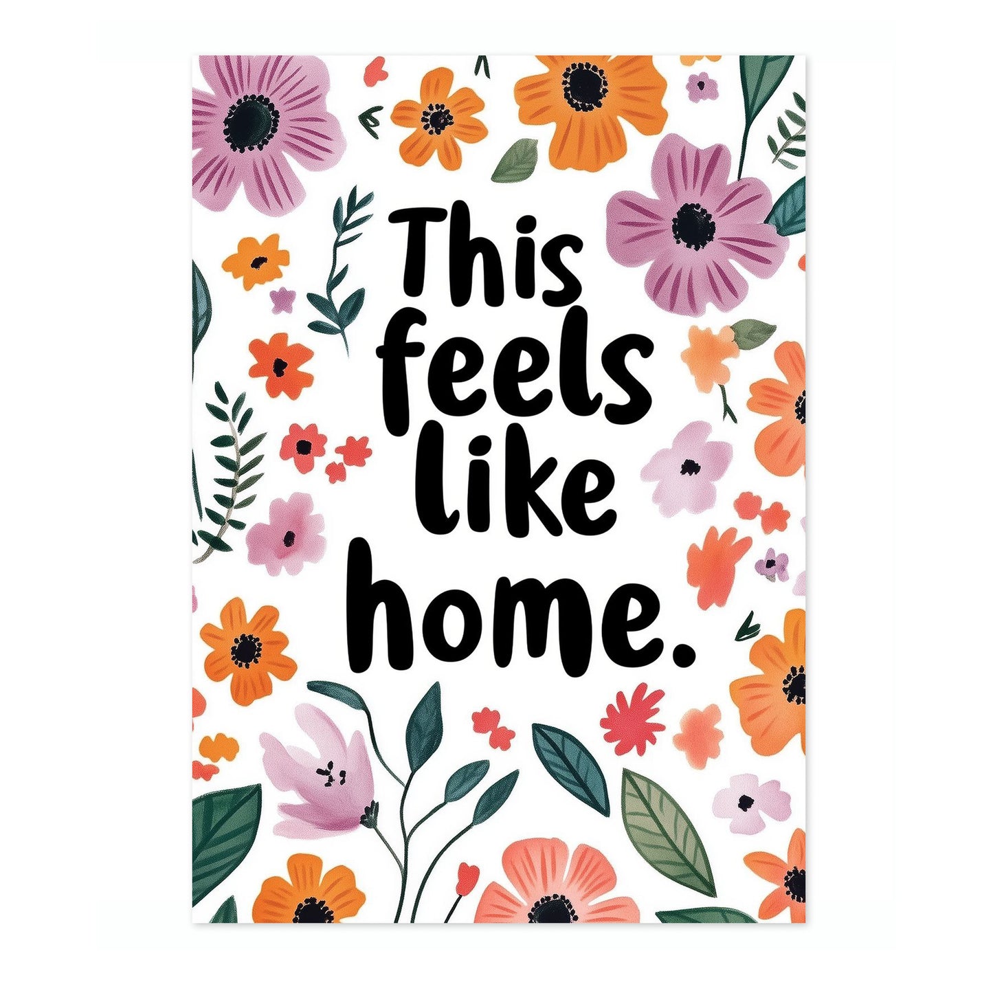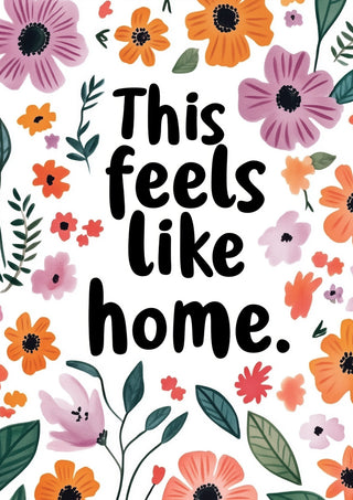 The "Feels Like Home" poster showcases a heartwarming typographic design surrounded by vibrant florals. Bright purple and orange flowers, along with lush green leaves, frame the comforting message. Ideal for adding a touch of warmth and personality to any space, this poster combines motivational typography with a charming floral aesthetic, perfect for creating a cozy atmosphere.