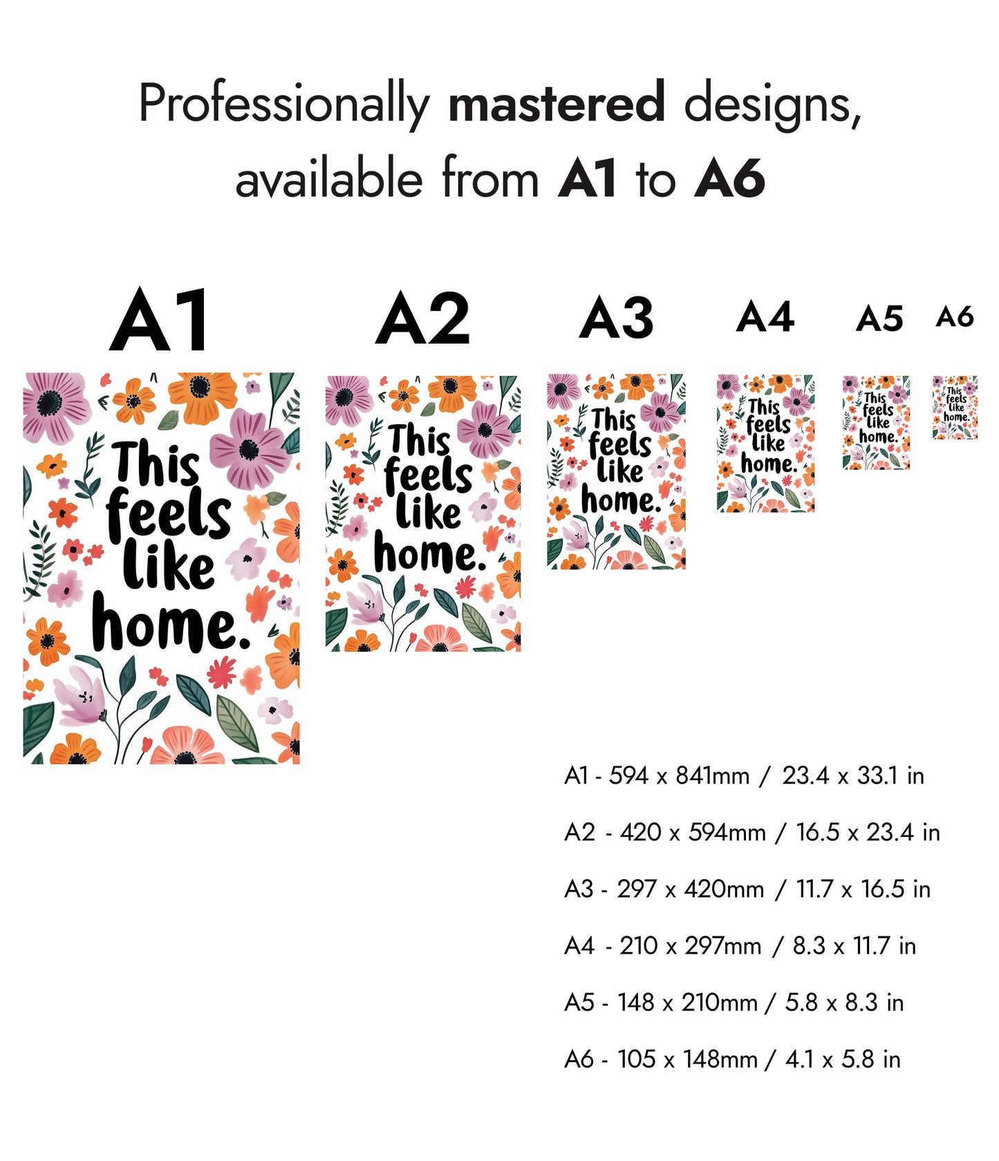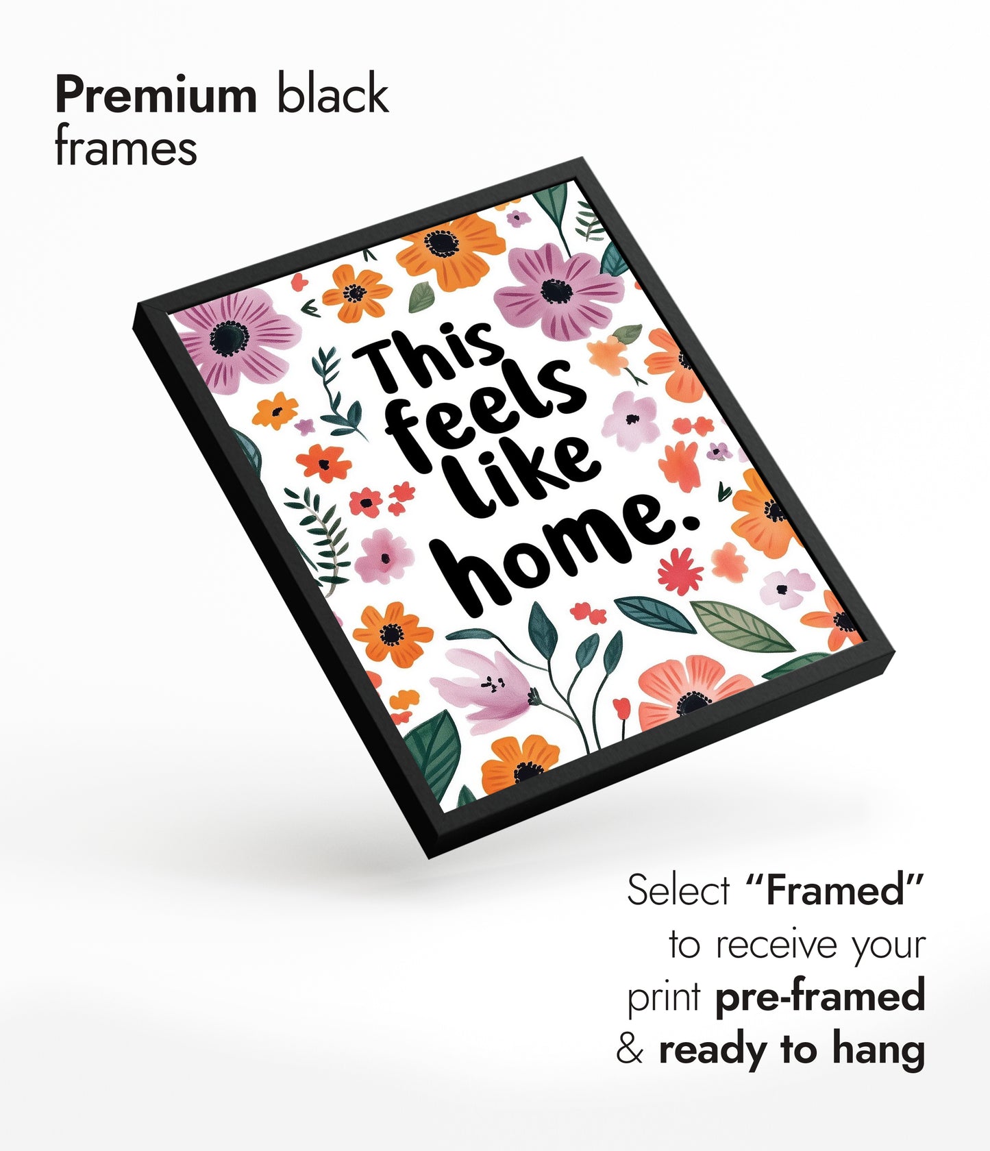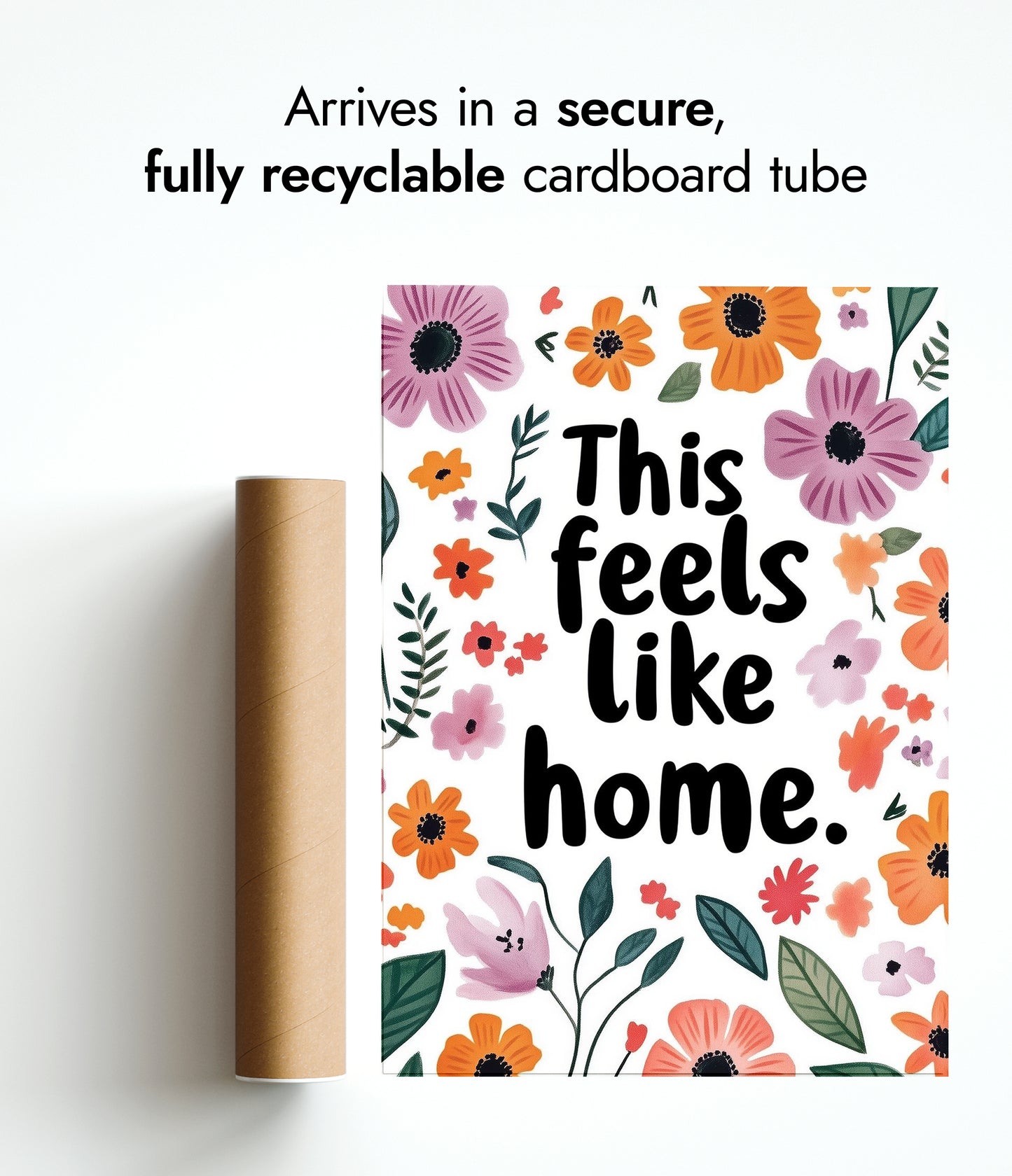 The "Feels Like Home" poster showcases a heartwarming typographic design surrounded by vibrant florals. Bright purple and orange flowers, along with lush green leaves, frame the comforting message. Ideal for adding a touch of warmth and personality to any space, this poster combines motivational typography with a charming floral aesthetic, perfect for creating a cozy atmosphere.