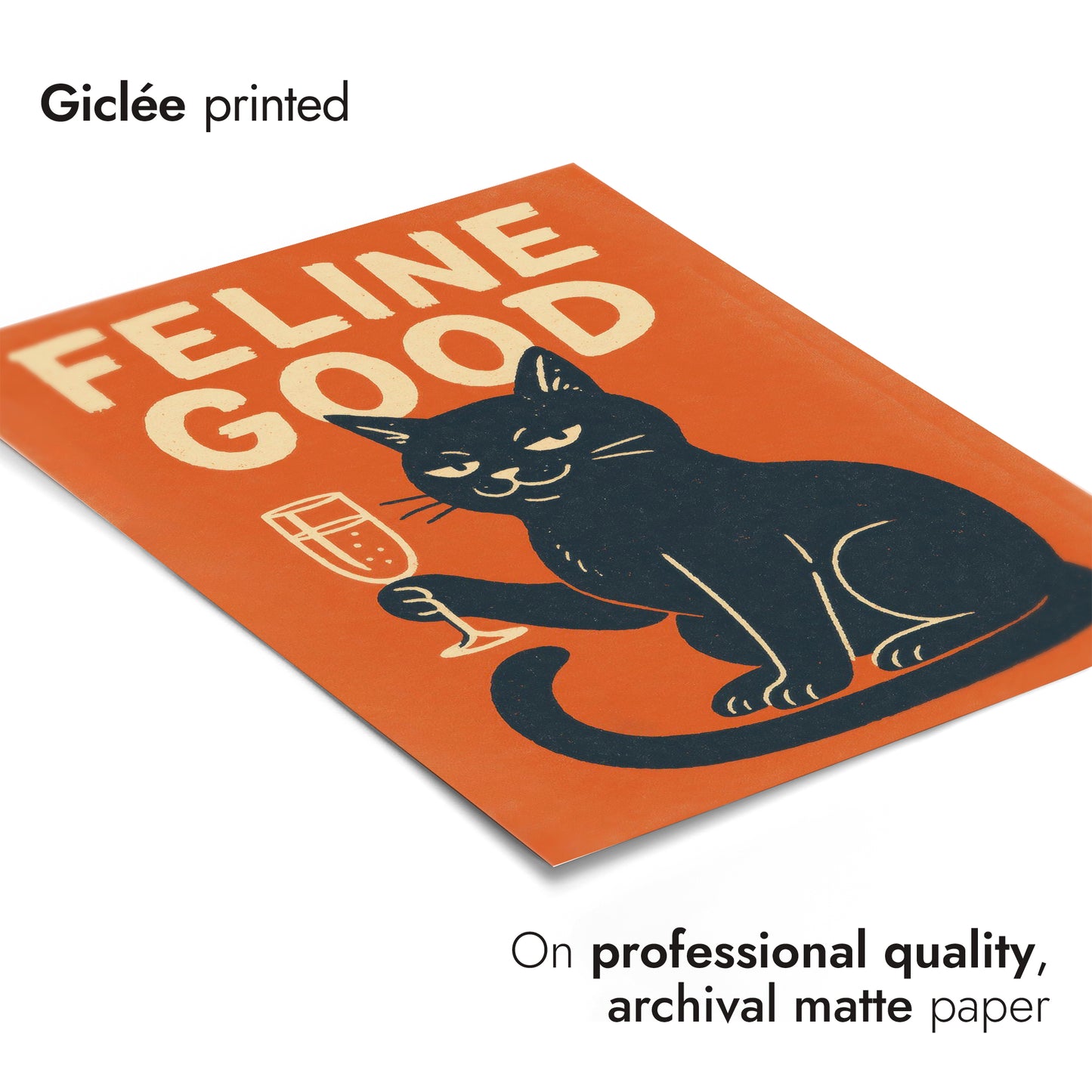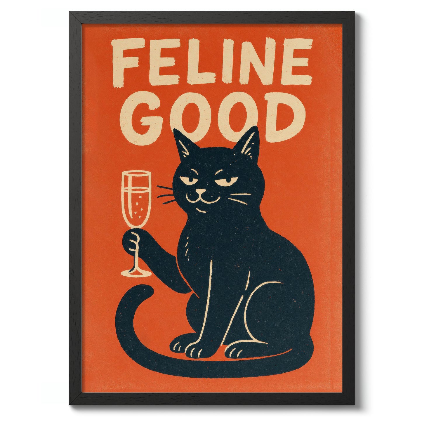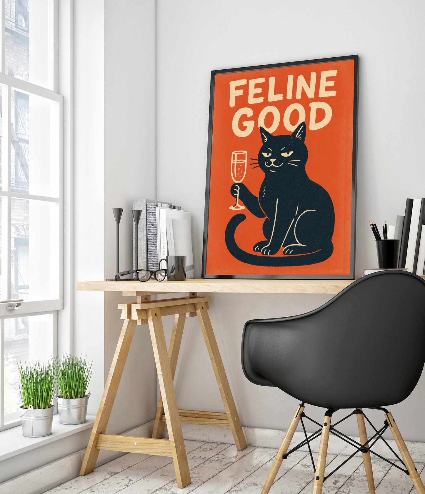 The "Feline Good" poster features a playful black cat holding a champagne glass against a vibrant orange backdrop. With bold typography, this graphic and typographic artwork captures a humorous yet stylish essence, combining themes of fun, cats, and celebratory moments. Ideal for cat lovers and those with a taste for humor in their decor.