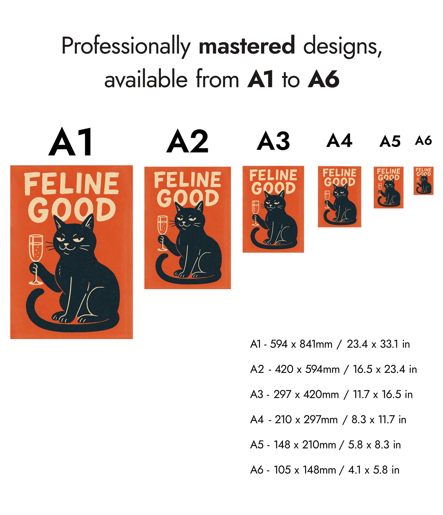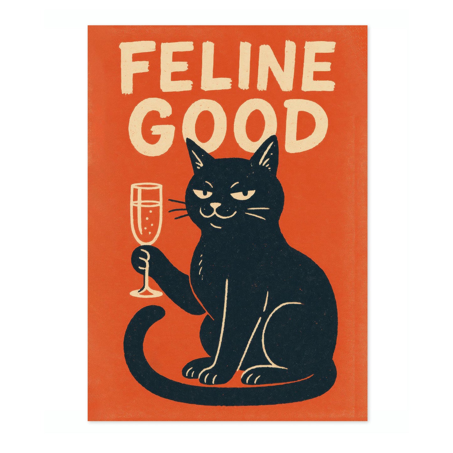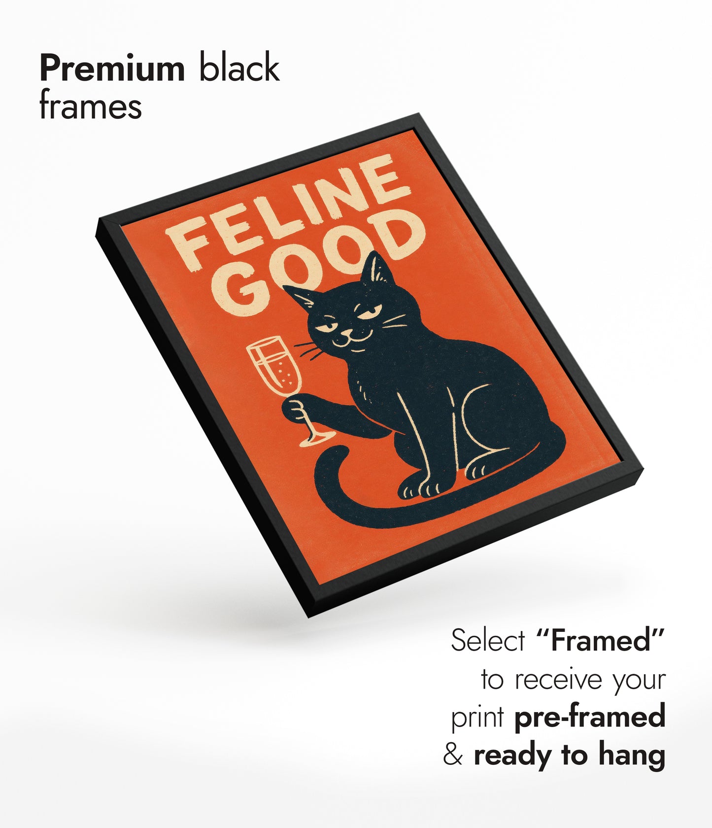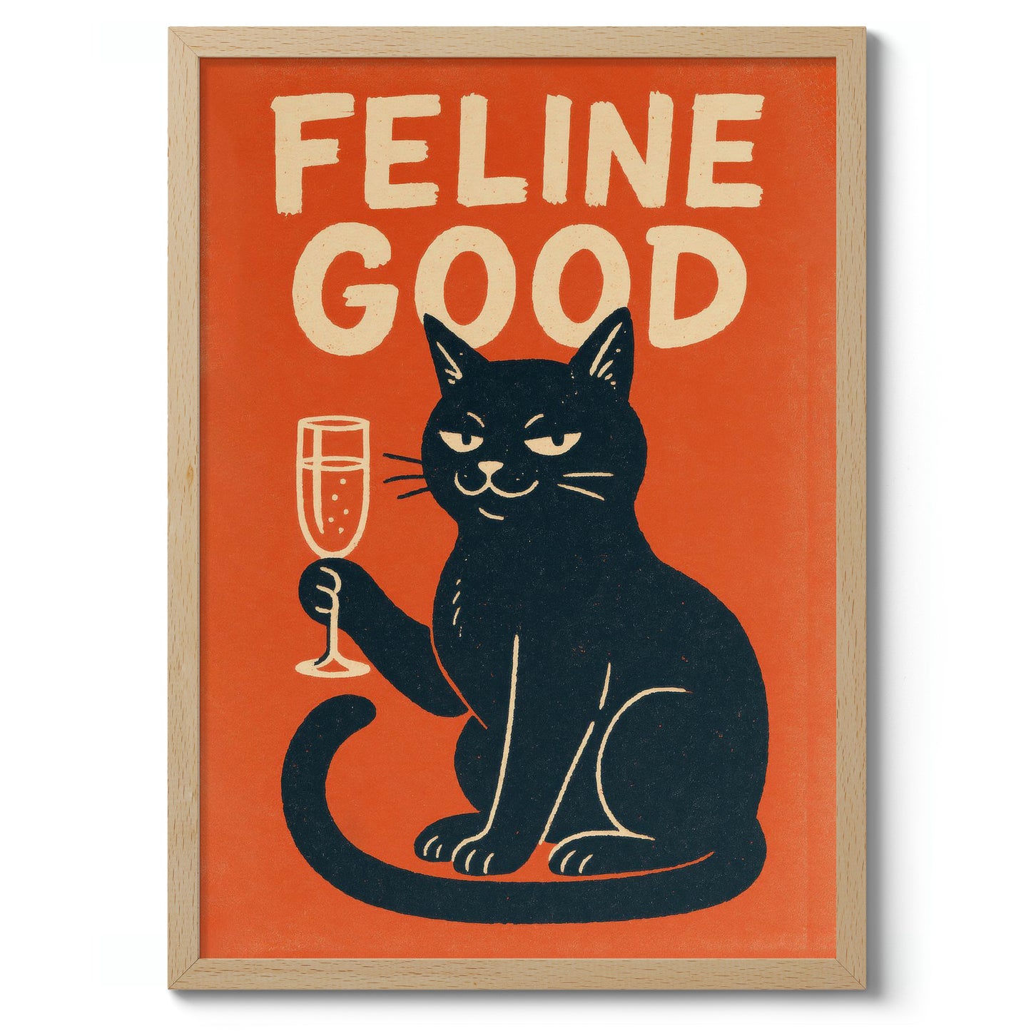 The "Feline Good" poster features a playful black cat holding a champagne glass against a vibrant orange backdrop. With bold typography, this graphic and typographic artwork captures a humorous yet stylish essence, combining themes of fun, cats, and celebratory moments. Ideal for cat lovers and those with a taste for humor in their decor.