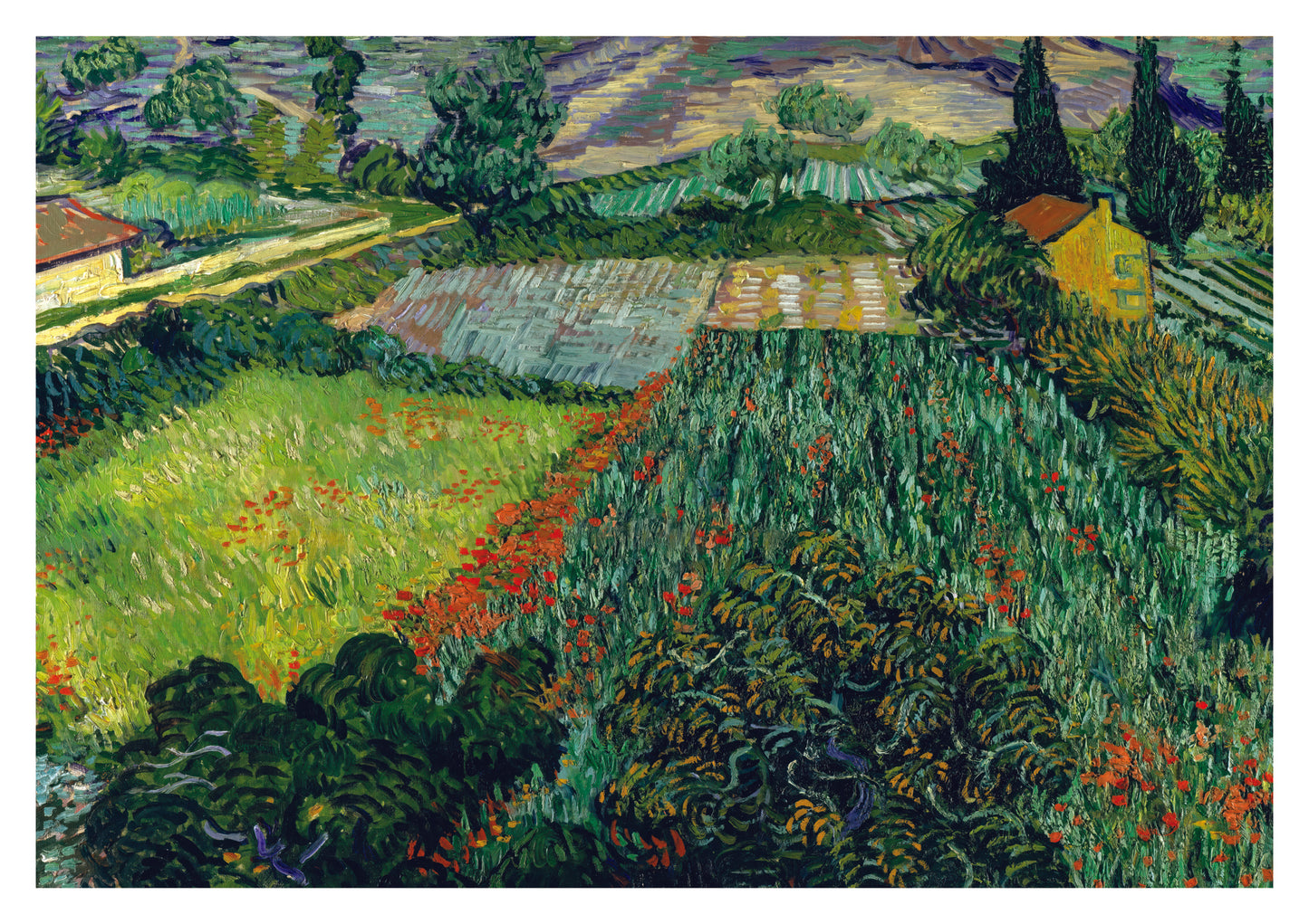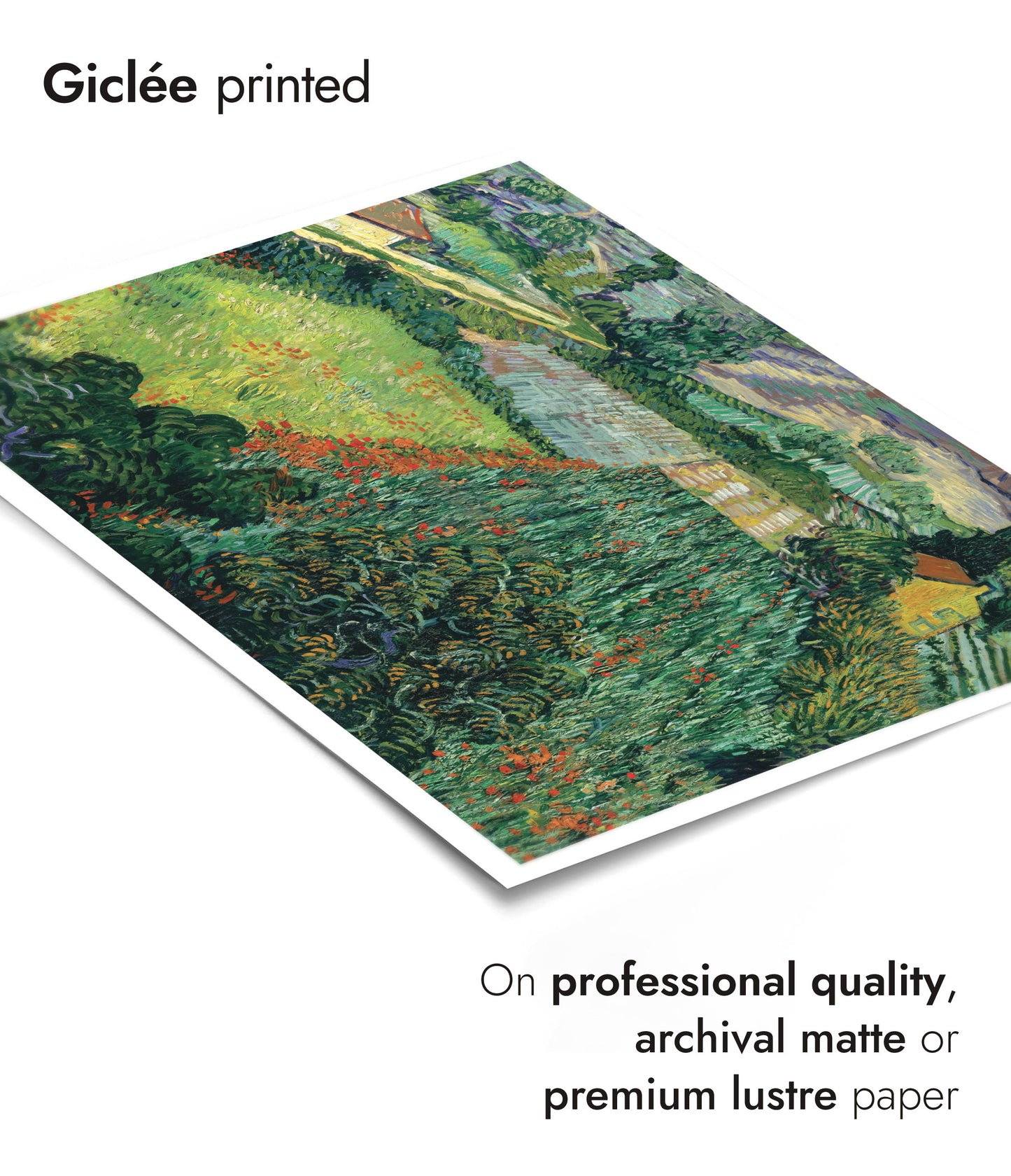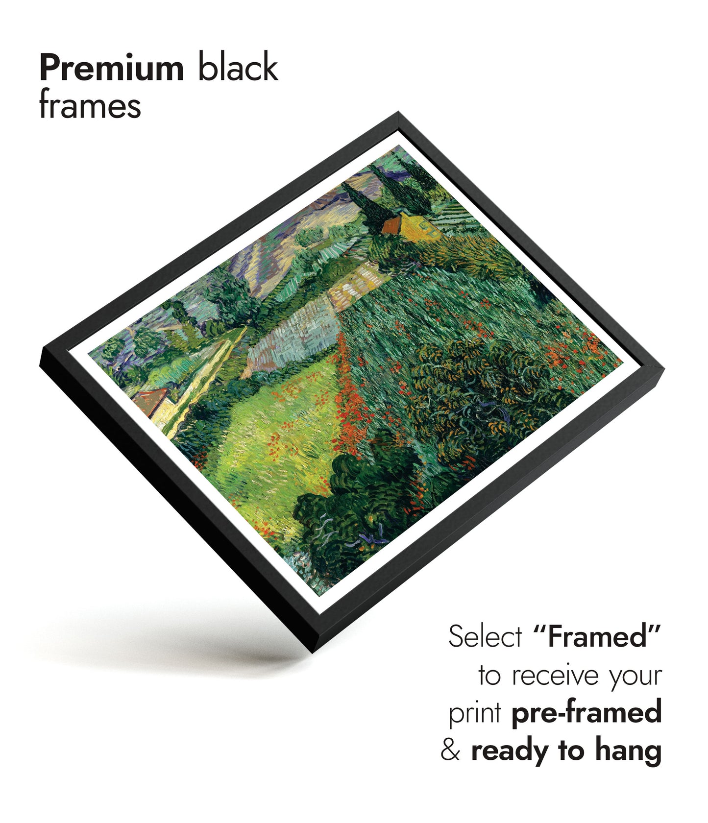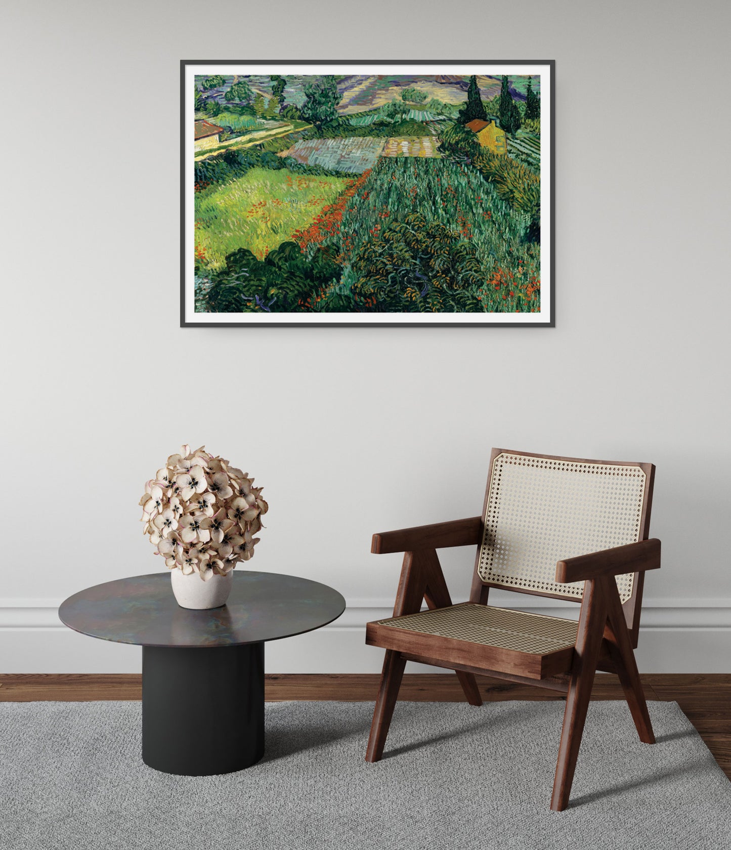 "Field with Poppies" by Vincent Van Gogh is a striking landscape poster featuring vibrant red poppies amidst green fields. Capturing rural tranquility, the Post-Impressionist painting showcases textured brushwork and dynamic colours. Ideal for fans of classic art, this farm meadow scene brings the essence of a serene countryside to your space. Perfect for enhancing home or office decor.