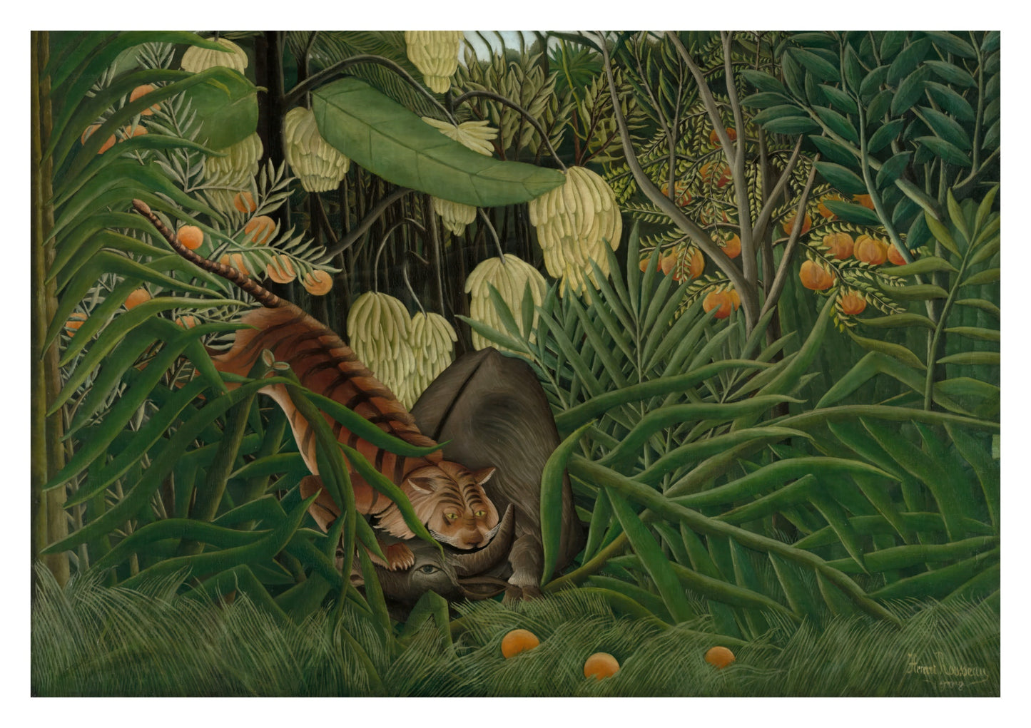 Capture the raw, untamed essence of the jungle with Henri Rousseau's "Fight Between a Tiger & a Buffalo" poster. This vivid landscape painting in Primitivism and Naive style depicts a tense struggle amid dense jungle foliage, vibrant flowers, and lush greenery. Ideal for art enthusiasts and nature lovers seeking a striking animal-themed wall decor.