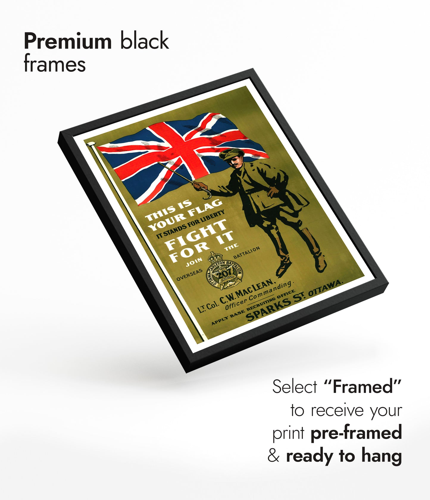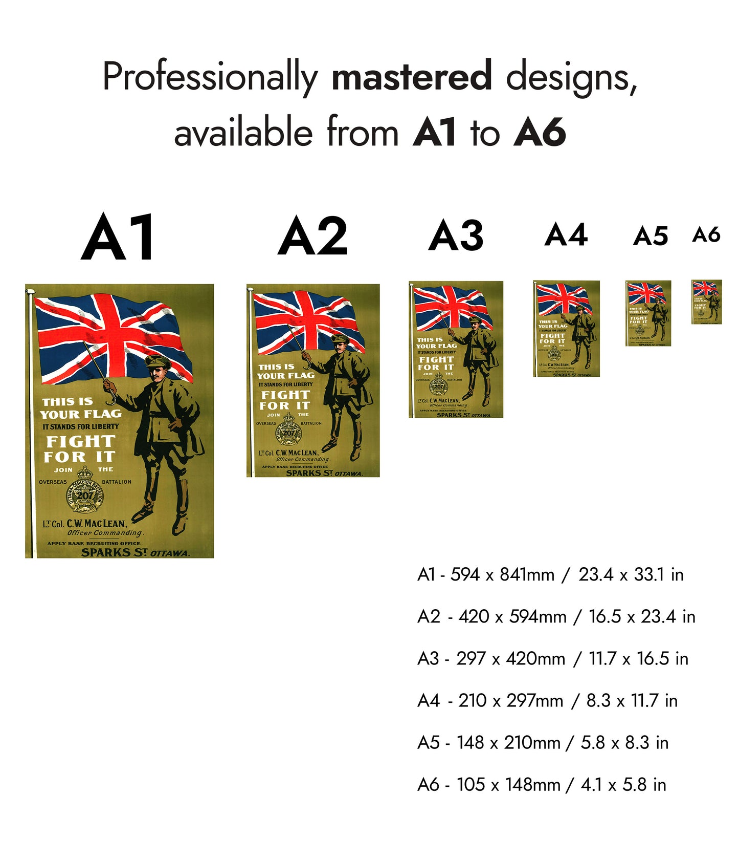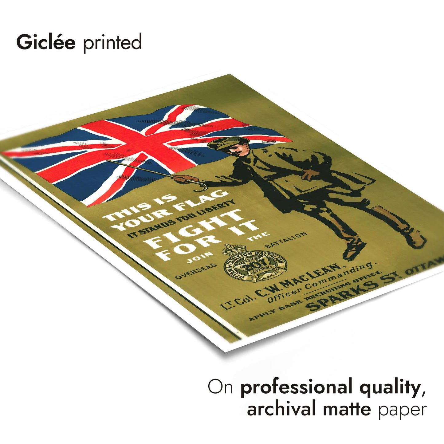 The "Fight for the Flag" poster is a vintage propaganda piece featuring a soldier waving the Union Jack. Highlighting a call to action with the slogan "This is your flag, fight for it," this wartime graphic emphasizes patriotism and duty. Ideal for history enthusiasts, this portrait-style illustration evokes the spirit of wartime recruitment. Suitable for spaces seeking a touch of historical significance.