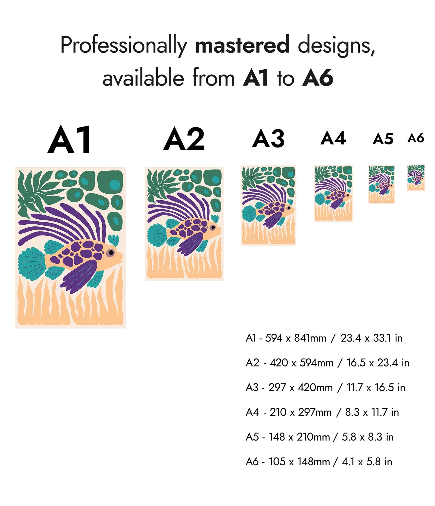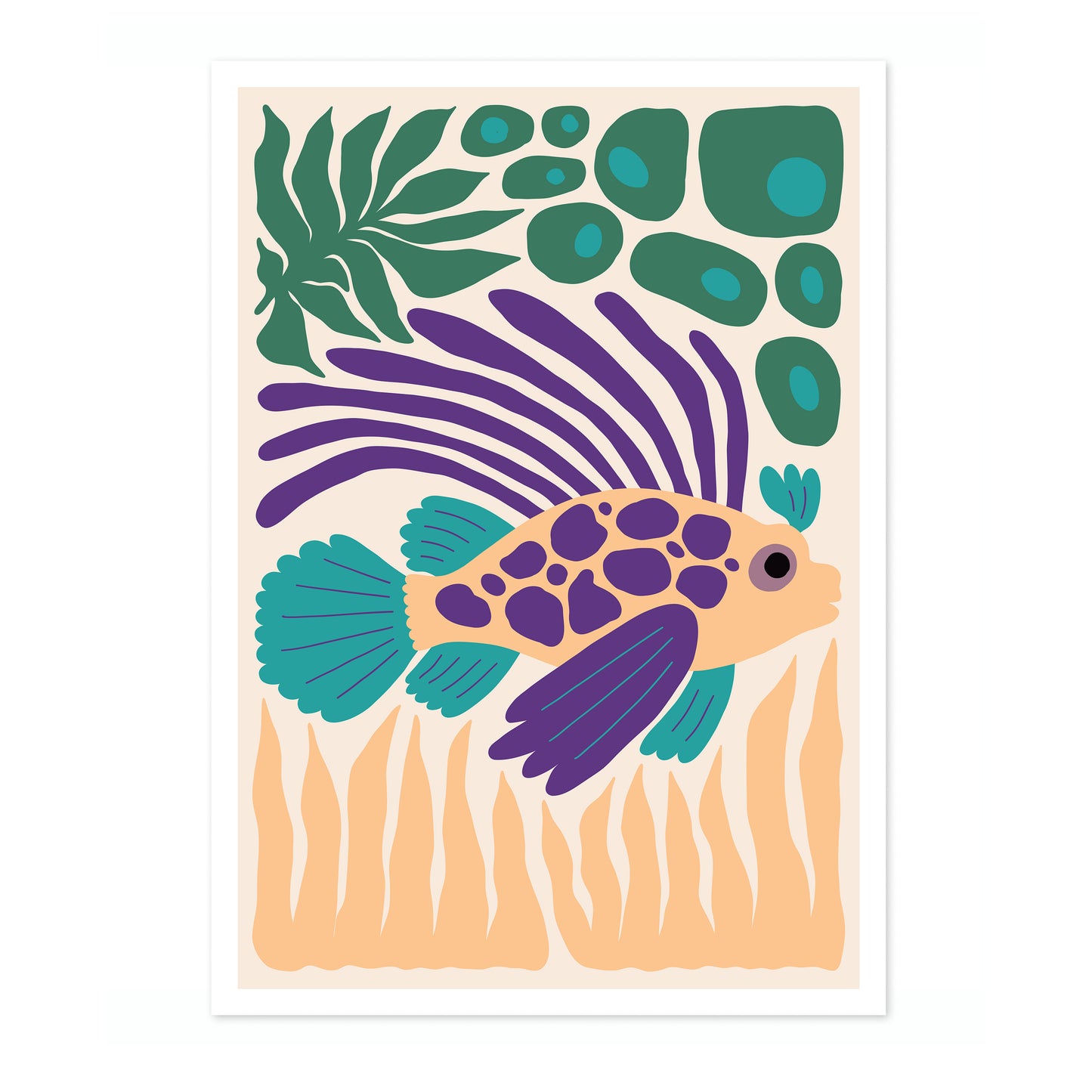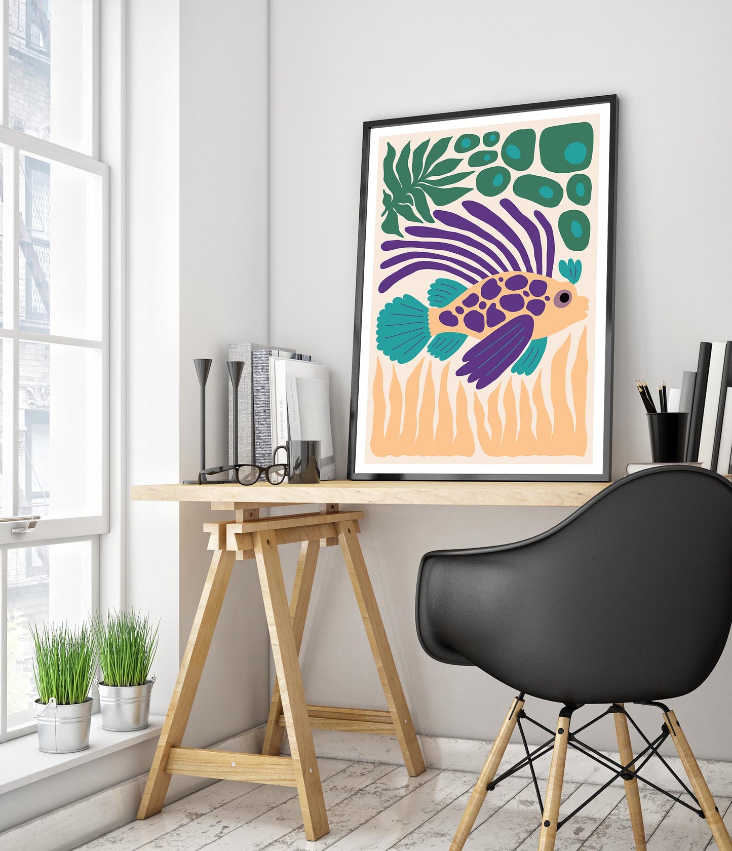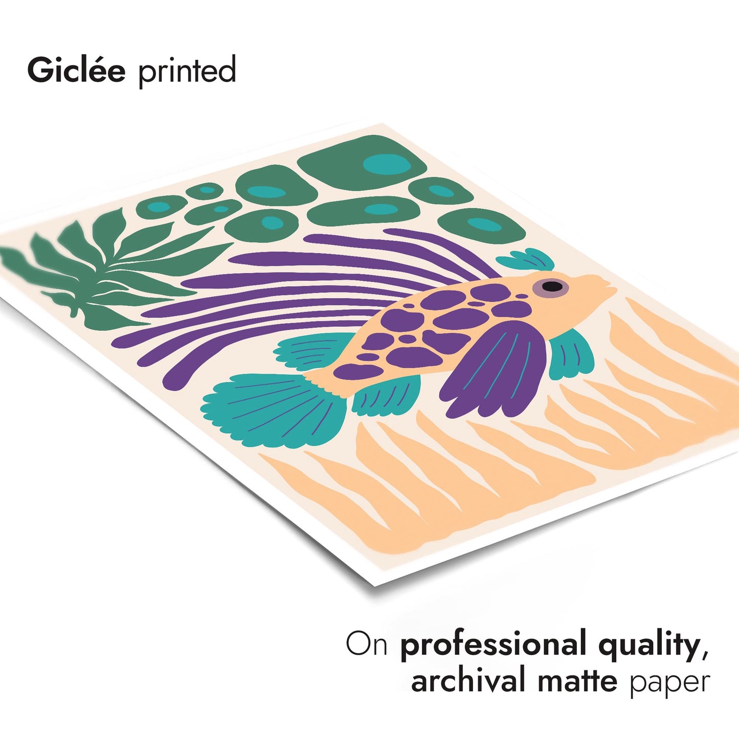 The "Fighting Fish" poster showcases a vibrant underwater scene featuring a colourful fish with purple, teal, and orange hues. Stylized seaweed and geometric leaf patterns complete the graphic design. Ideal for nursery decor, this artwork brings a playful and lively oceanic theme to any space. Perfect for adding a touch of aquatic charm to your walls.