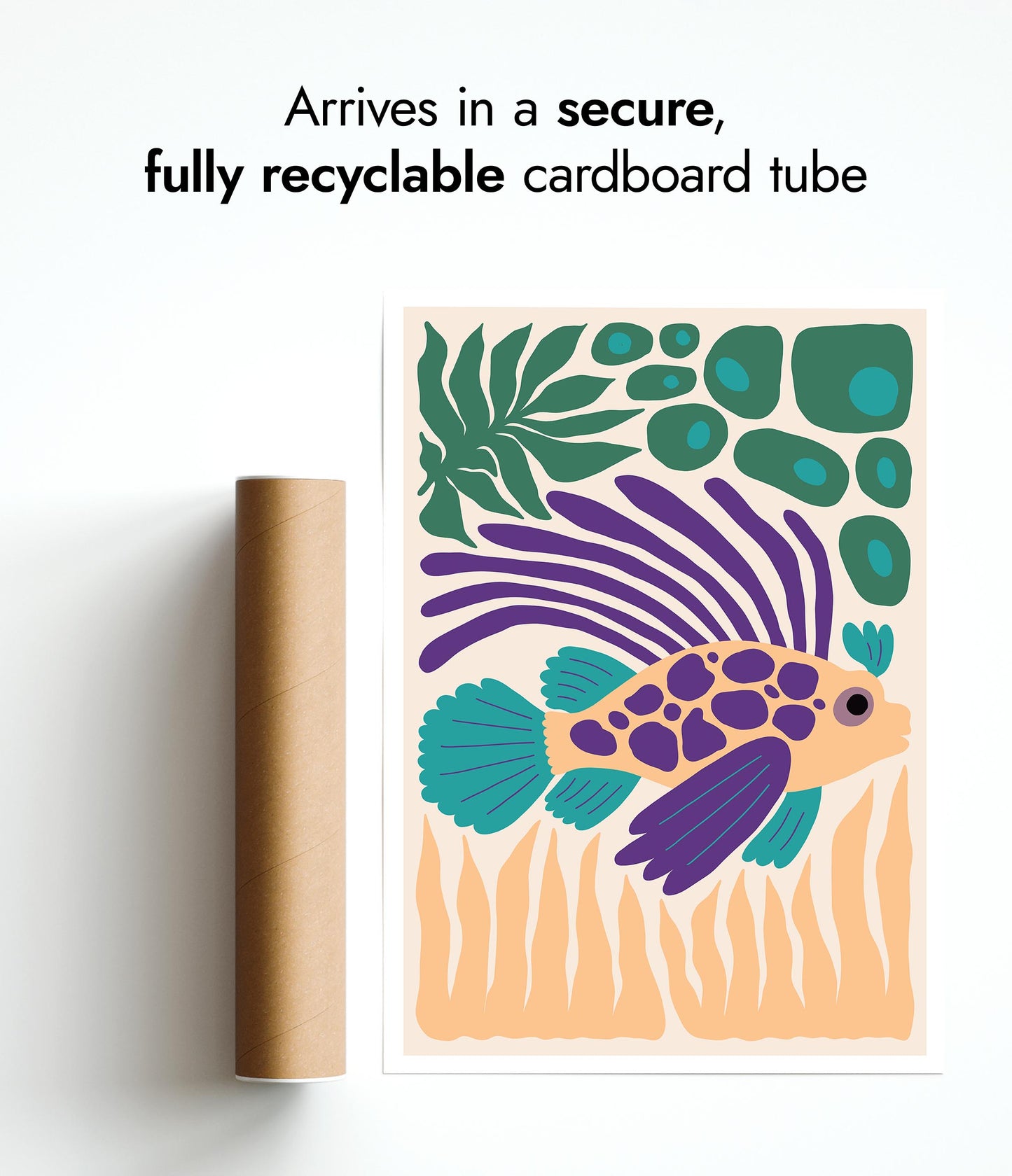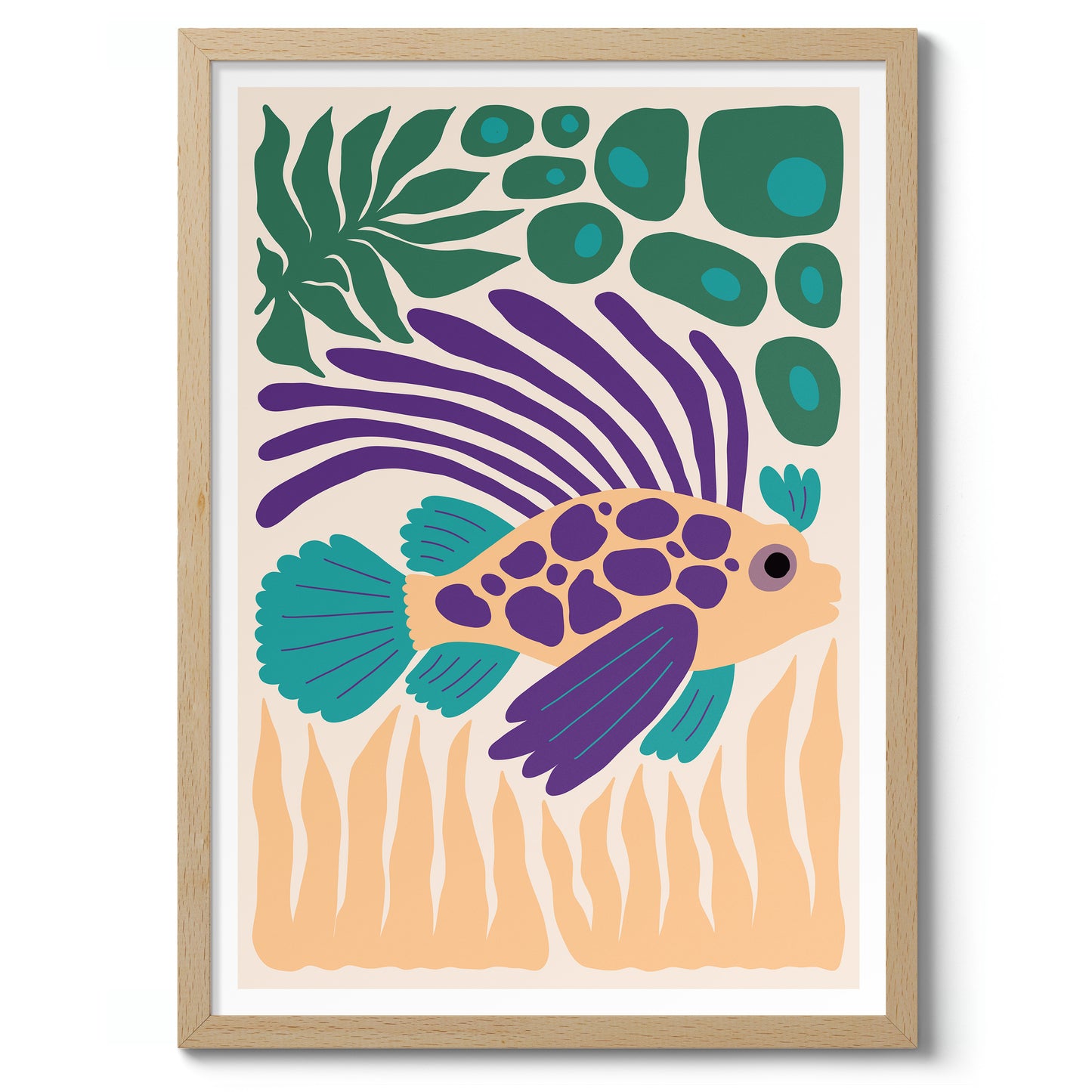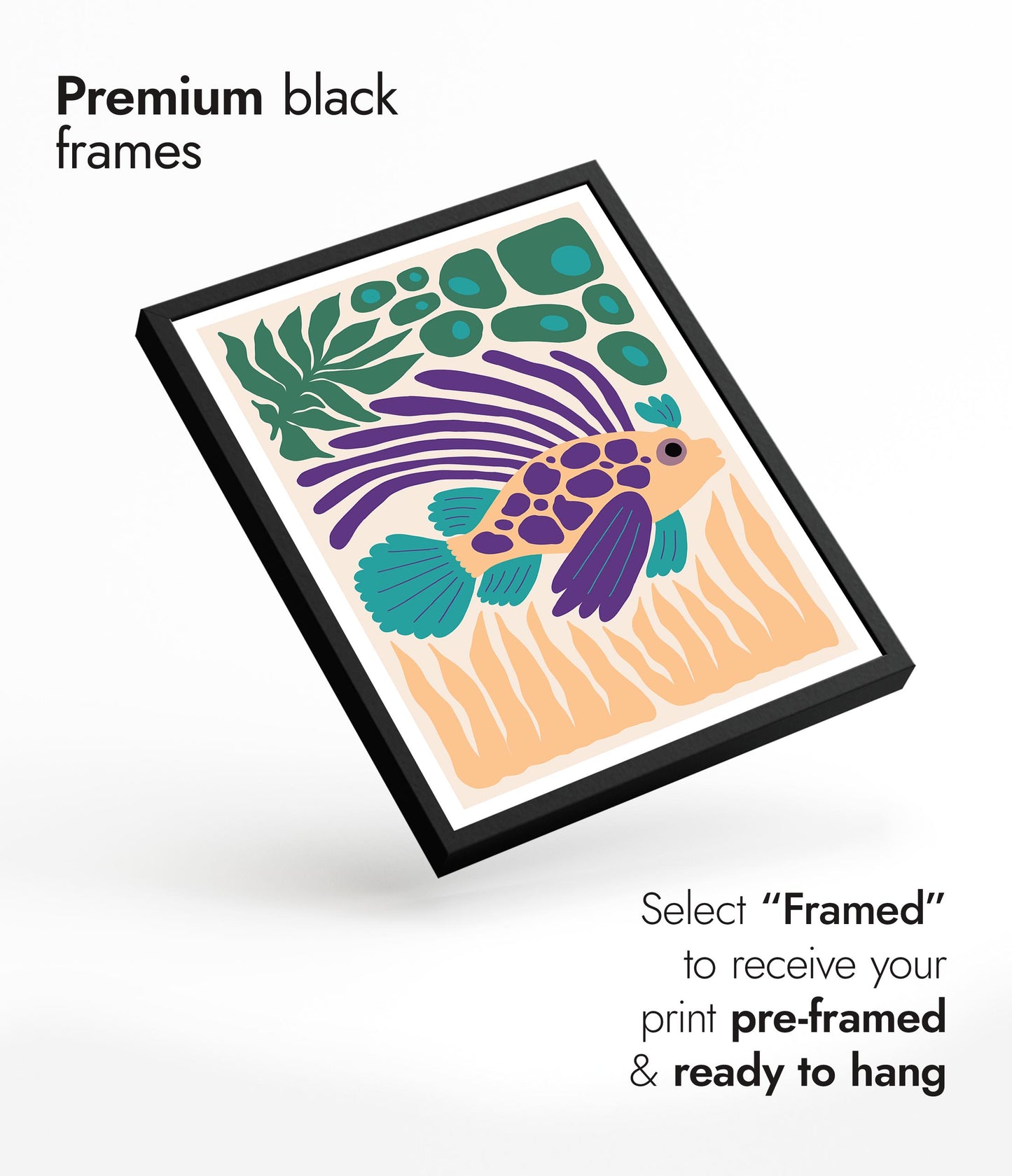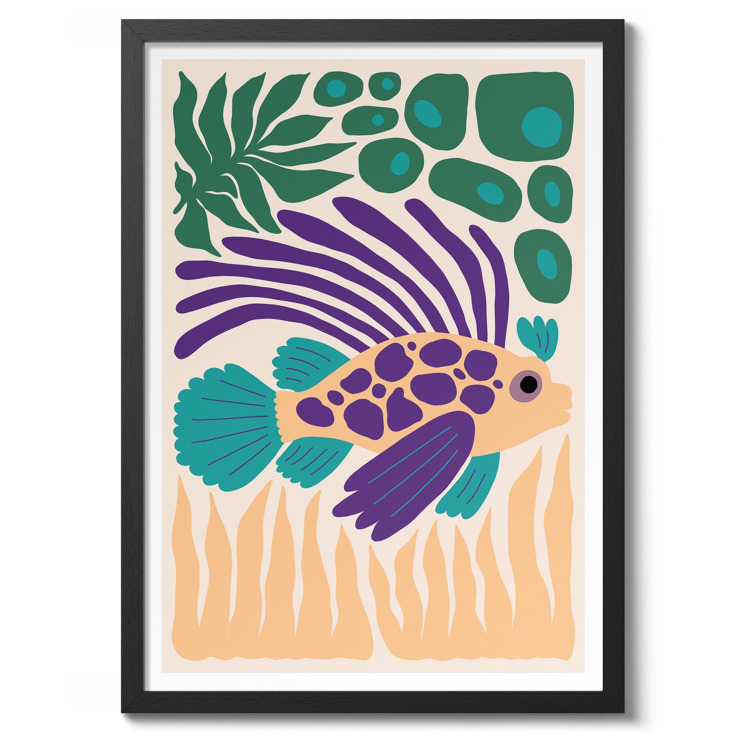 The "Fighting Fish" poster showcases a vibrant underwater scene featuring a colourful fish with purple, teal, and orange hues. Stylized seaweed and geometric leaf patterns complete the graphic design. Ideal for nursery decor, this artwork brings a playful and lively oceanic theme to any space. Perfect for adding a touch of aquatic charm to your walls.