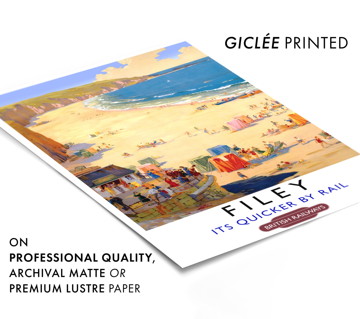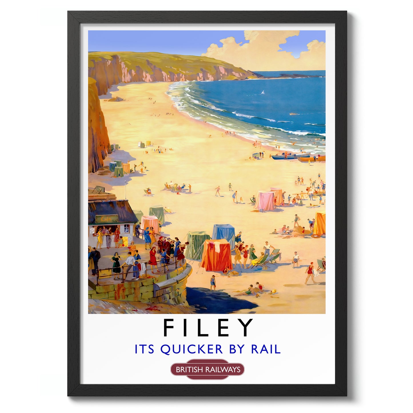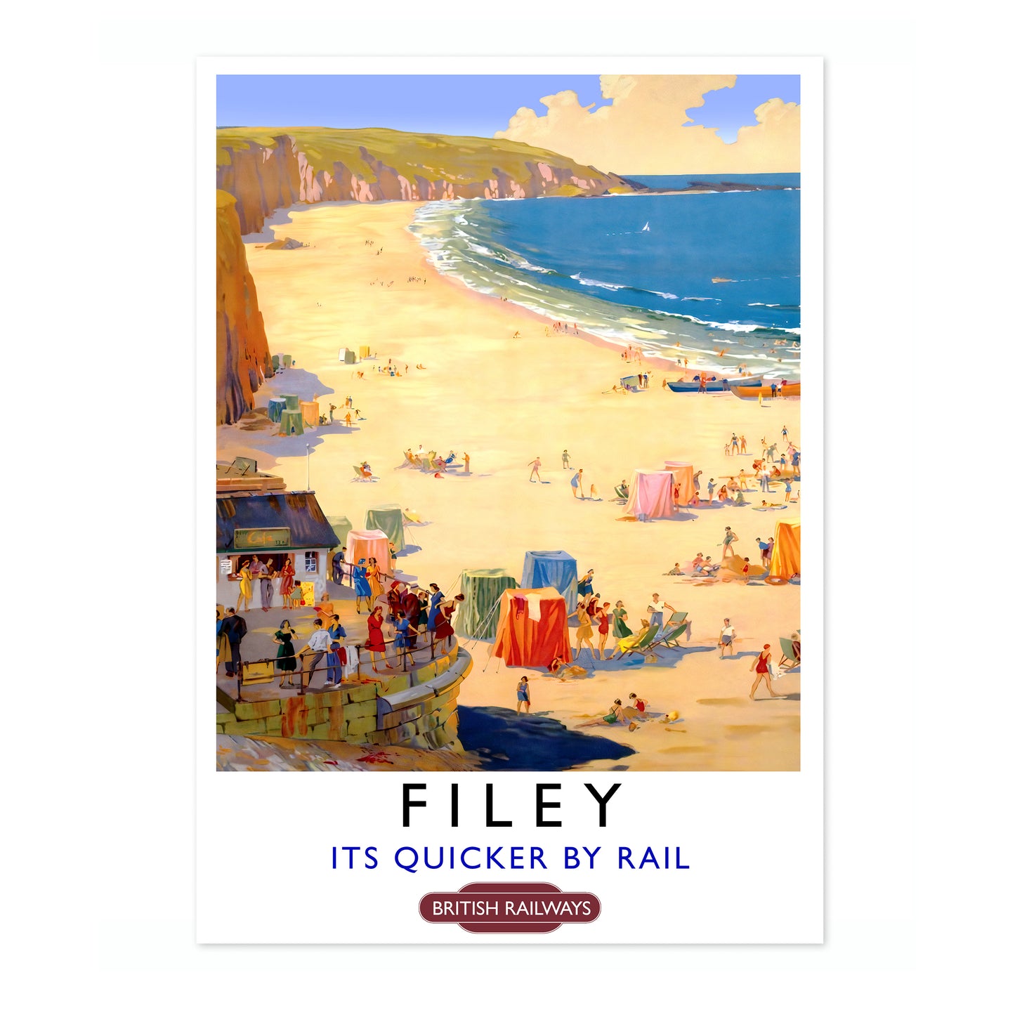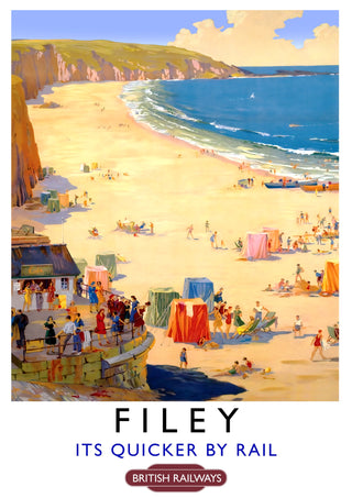 This vibrant vintage poster showcases Filey's picturesque beach, with soft golden sands gently meeting the blue sea. Beachgoers, colourful cabanas, and towering cliffs define the scene, capturing a quintessential summer day in Yorkshire, England. Below, the phrase "Its quicker by rail" emphasizes British Railways' convenient travel options. Ideal for adding a nostalgic touch to any space.