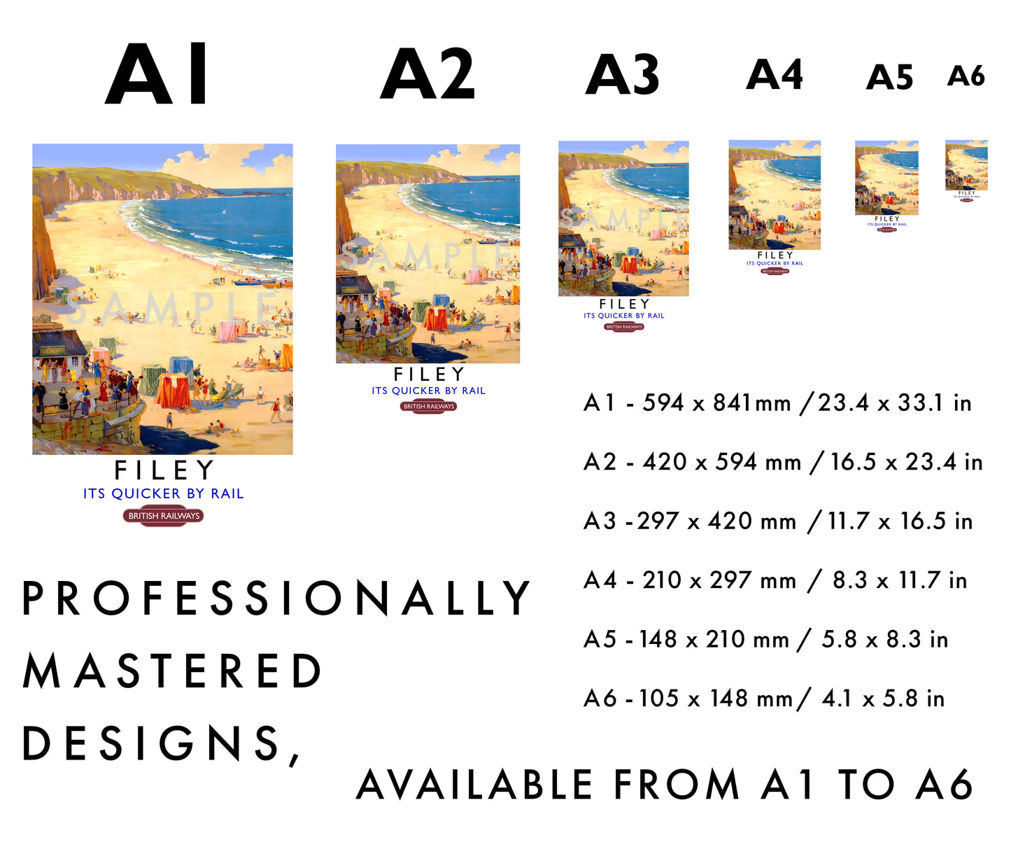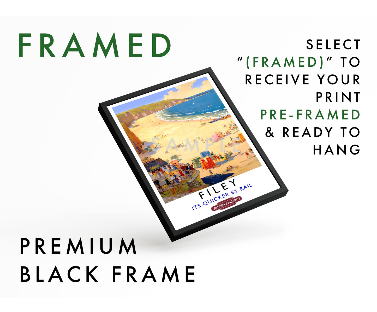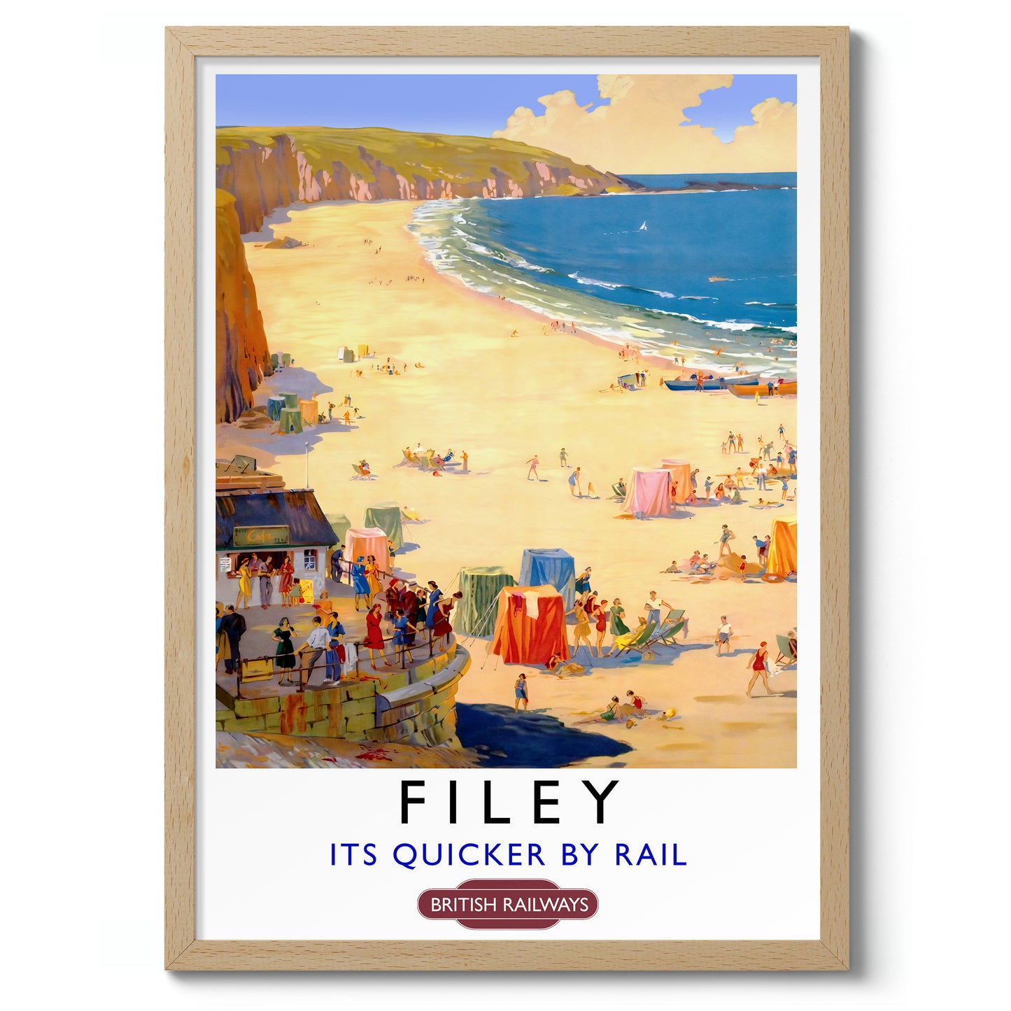 This vibrant vintage poster showcases Filey's picturesque beach, with soft golden sands gently meeting the blue sea. Beachgoers, colourful cabanas, and towering cliffs define the scene, capturing a quintessential summer day in Yorkshire, England. Below, the phrase "Its quicker by rail" emphasizes British Railways' convenient travel options. Ideal for adding a nostalgic touch to any space.