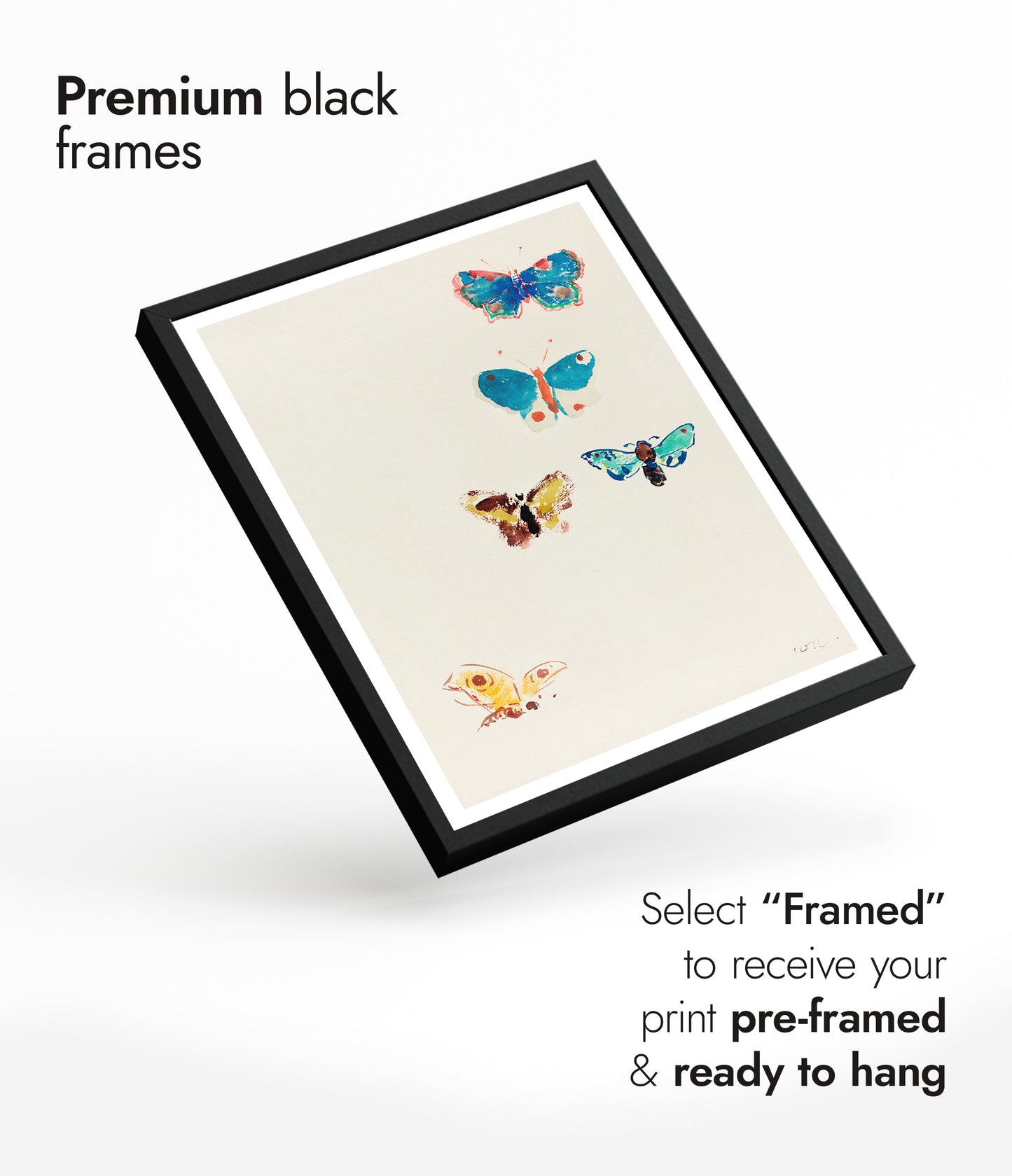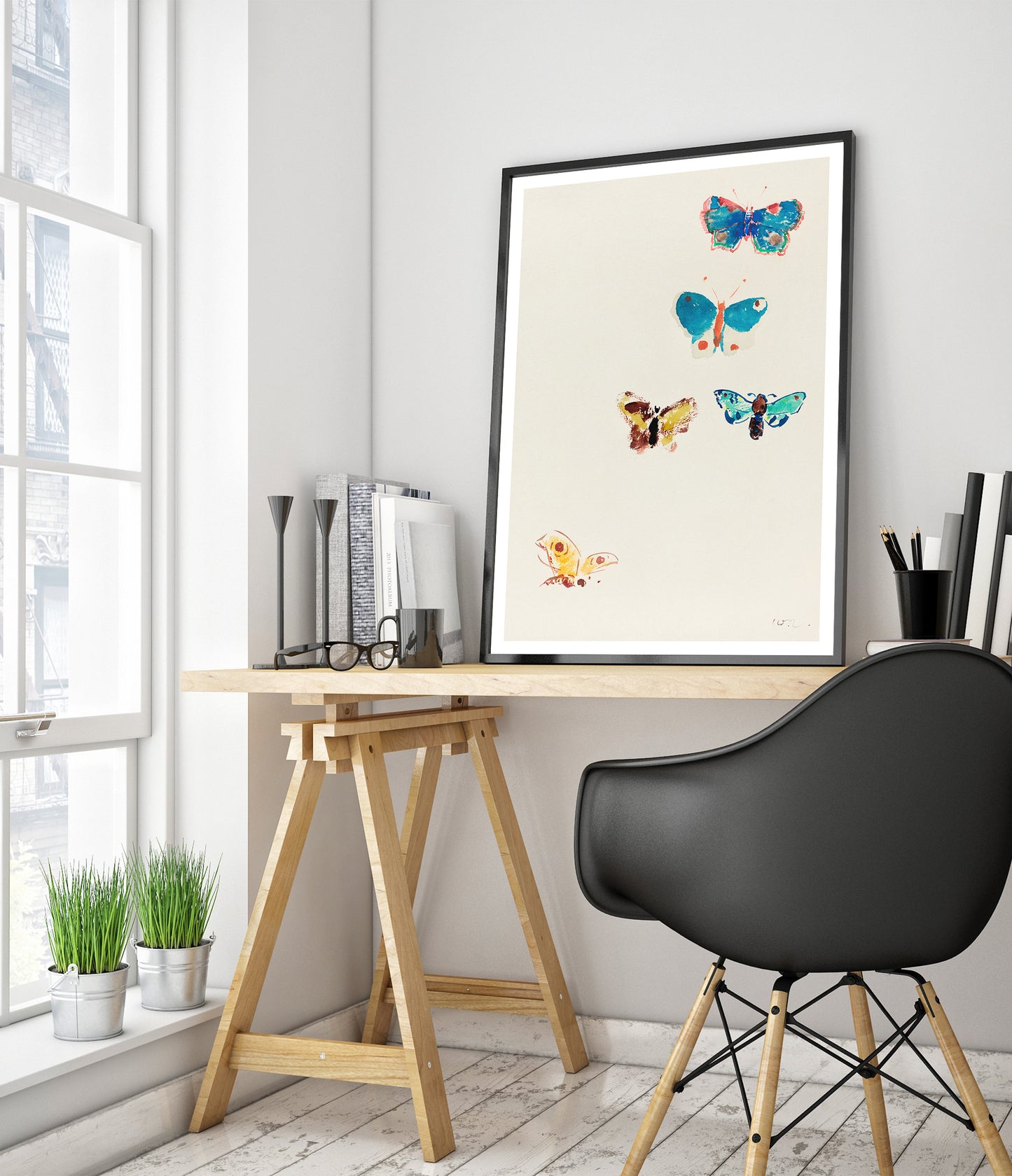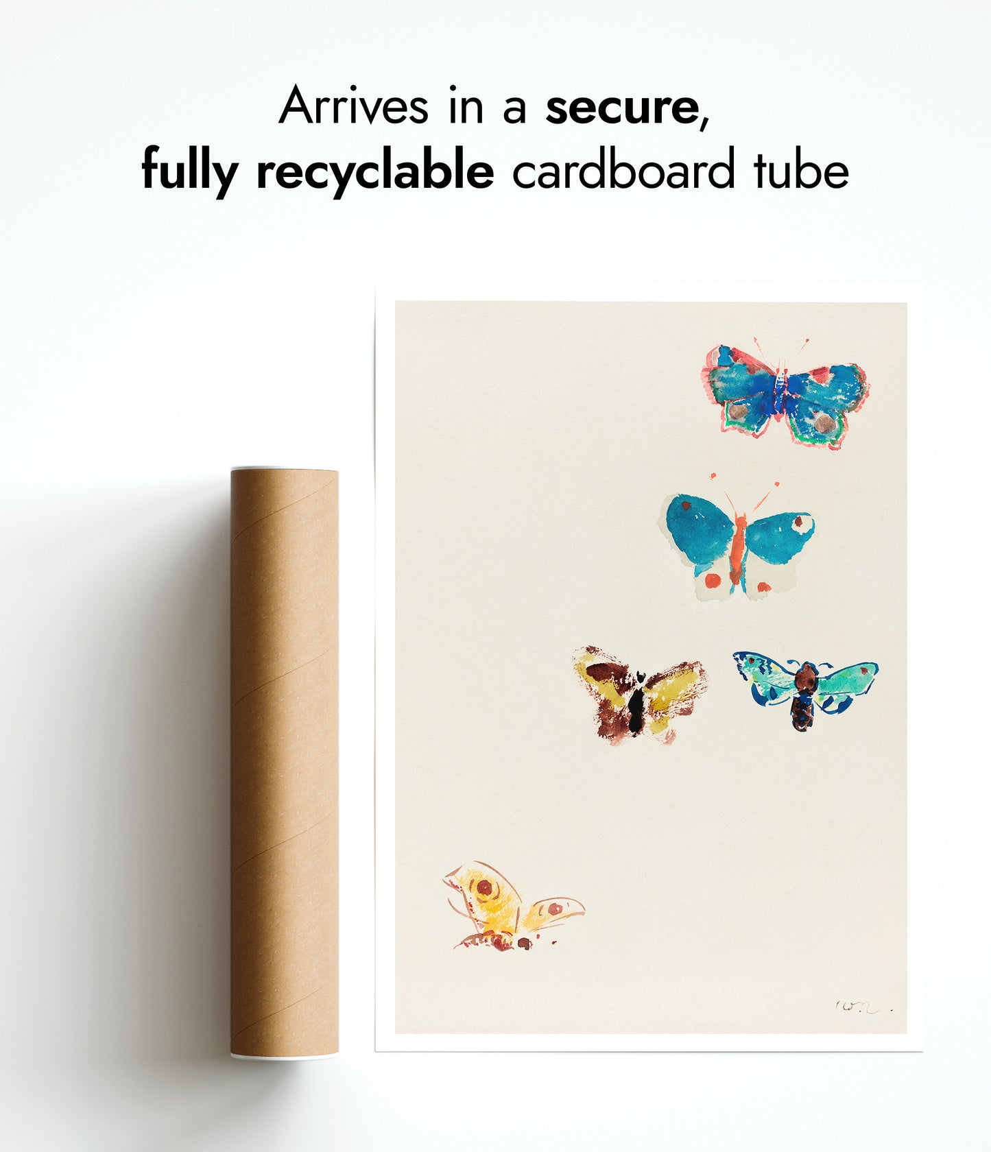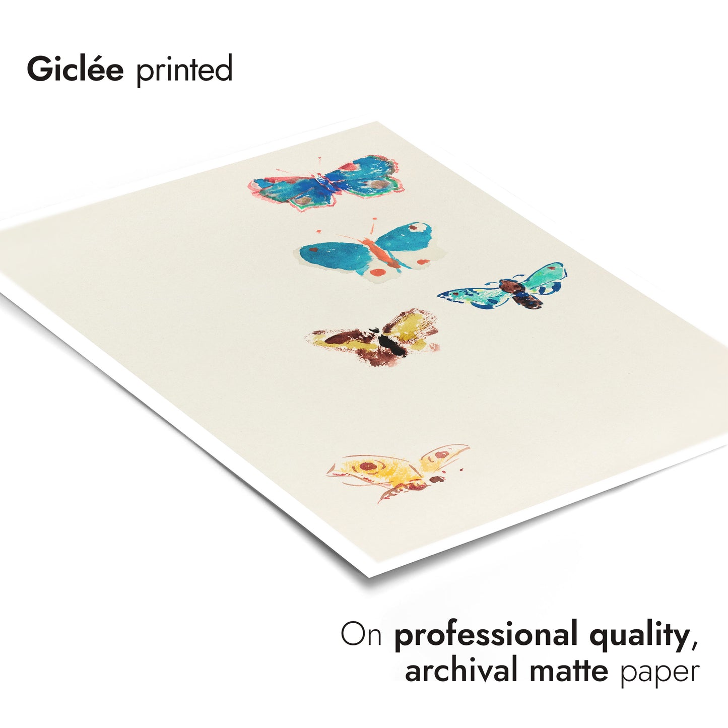 This "Five Butterflies" poster by Odilon Redon showcases a delicate Post-Impressionist painting featuring five vividly coloured butterflies. Each butterfly exudes a unique blend of colours and intricate details, set against a minimalist background. This portrait-style insect art print brings a touch of nature's elegance into any decor. Ideal for nature and art enthusiasts.