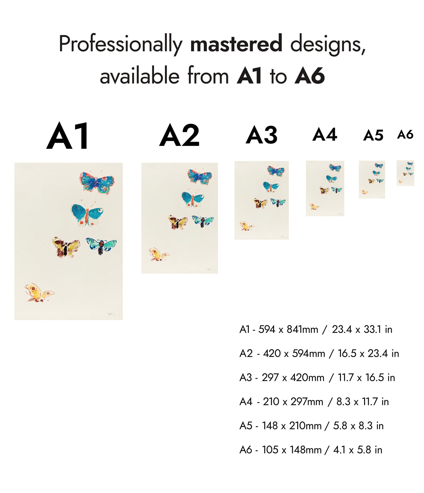 8 colour giclée print process on high-quality 230gsm archival matte paper. All our paper is FSC Certified and prints come with a lifetime fade-resistance guarantee.