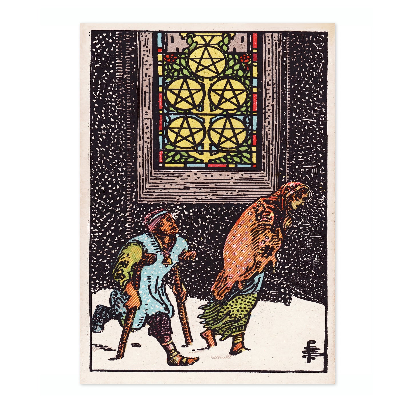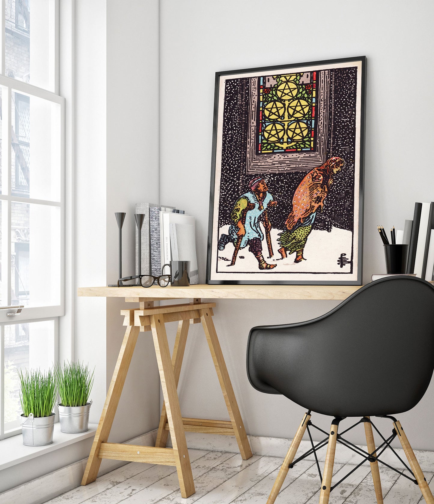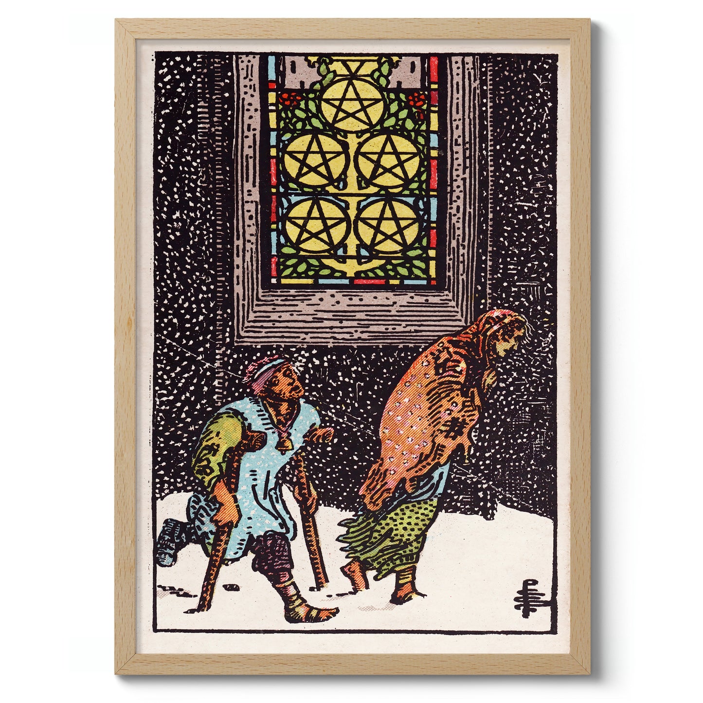 The "Five of Pentacles" poster features a vintage-style tarot card illustration. It depicts two figures in a wintry scene, symbolizing hardship and struggle, under a stained glass window adorned with five pentacles. The intricate details and rich colours evoke a sense of spirituality and mysticism, making it a captivating addition to your vintage or fantasy-themed decor.