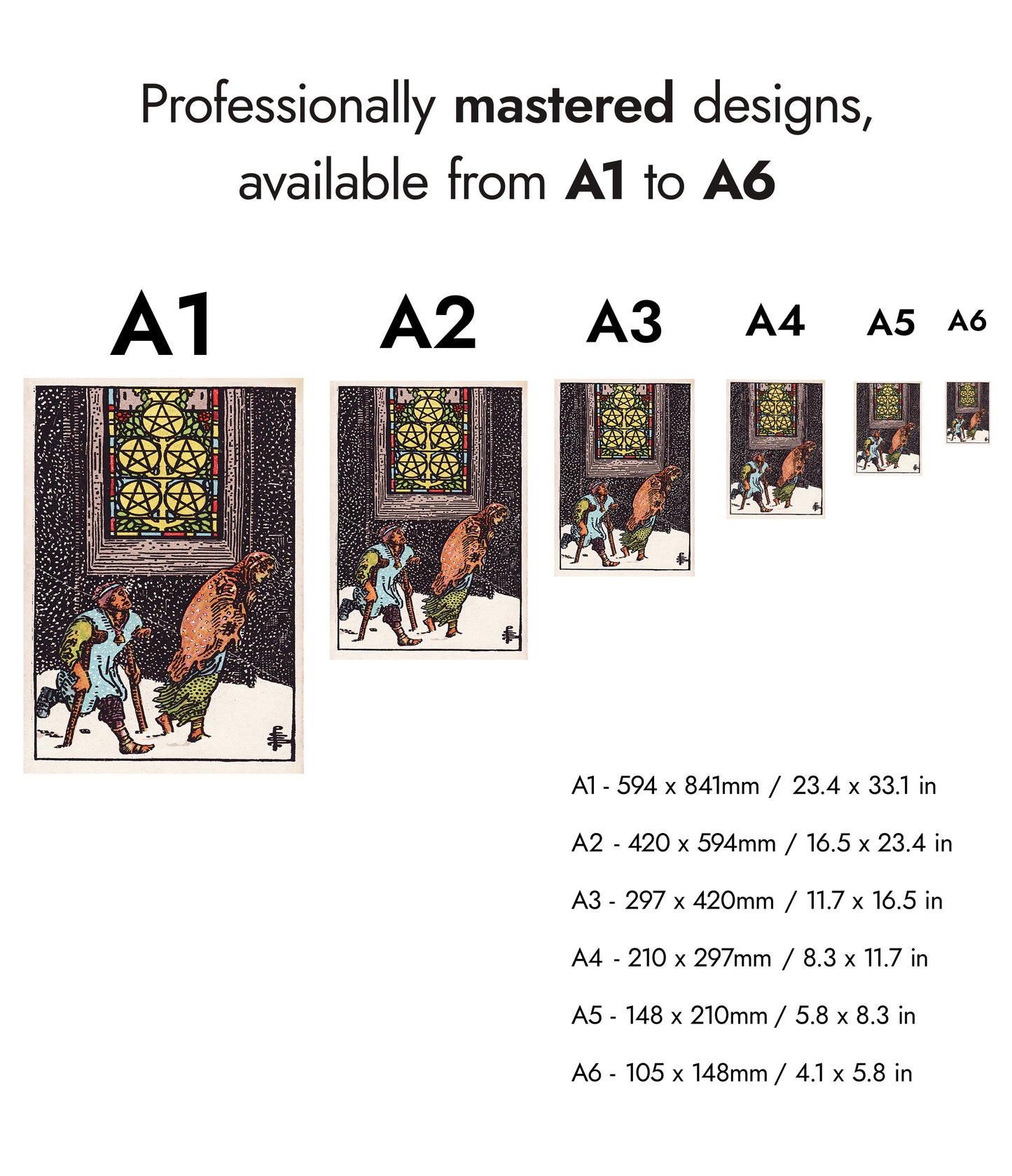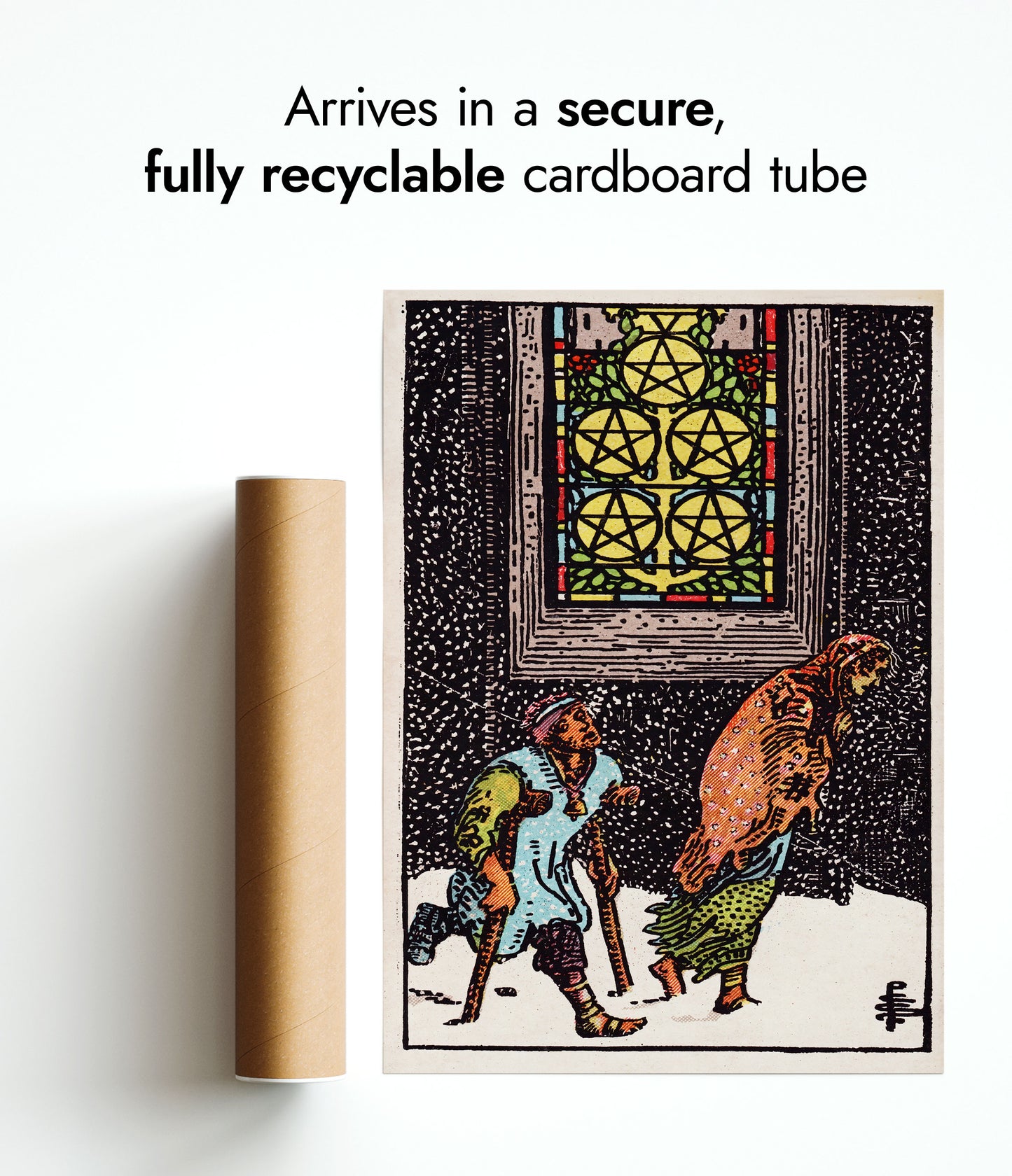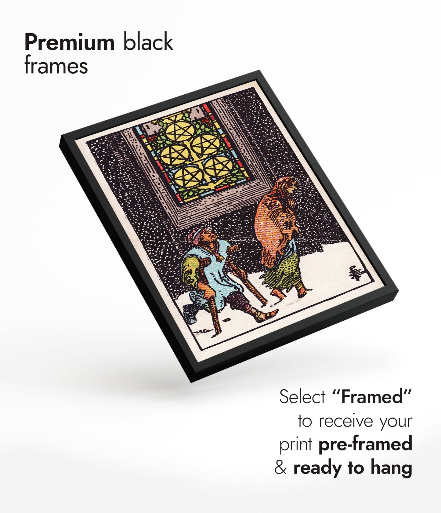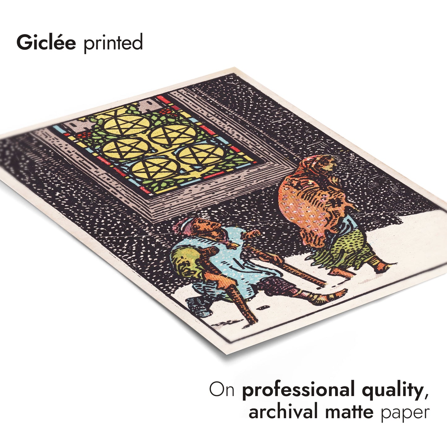 The "Five of Pentacles" poster features a vintage-style tarot card illustration. It depicts two figures in a wintry scene, symbolizing hardship and struggle, under a stained glass window adorned with five pentacles. The intricate details and rich colours evoke a sense of spirituality and mysticism, making it a captivating addition to your vintage or fantasy-themed decor.