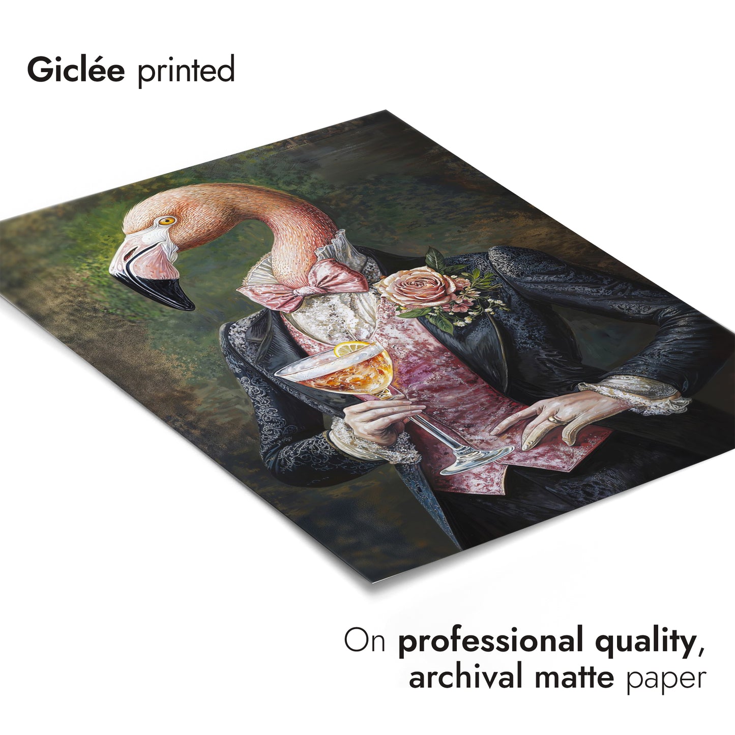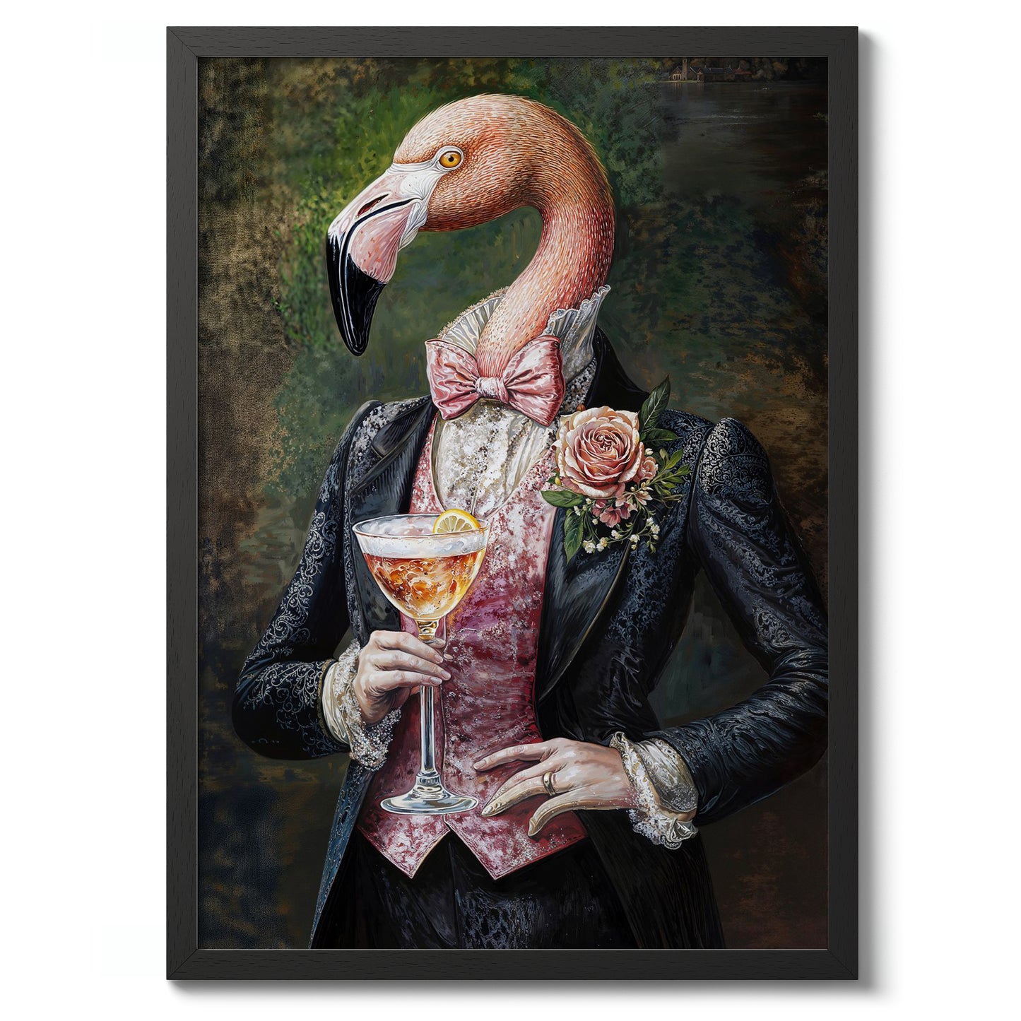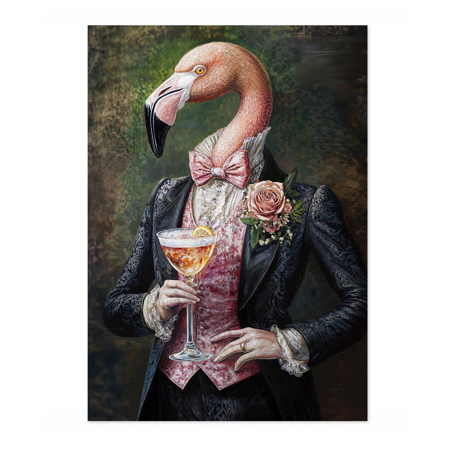 This whimsical flamingo poster presents an intriguing blend of nature and history, featuring a flamingo in Tudor-style attire. The richly detailed illustration portrays the flamingo with a pink bow tie and floral boutonniere, elegantly holding a cocktail. This vintage-inspired artwork combines humor with sophistication, making it a unique addition to any animal or historical art collection.