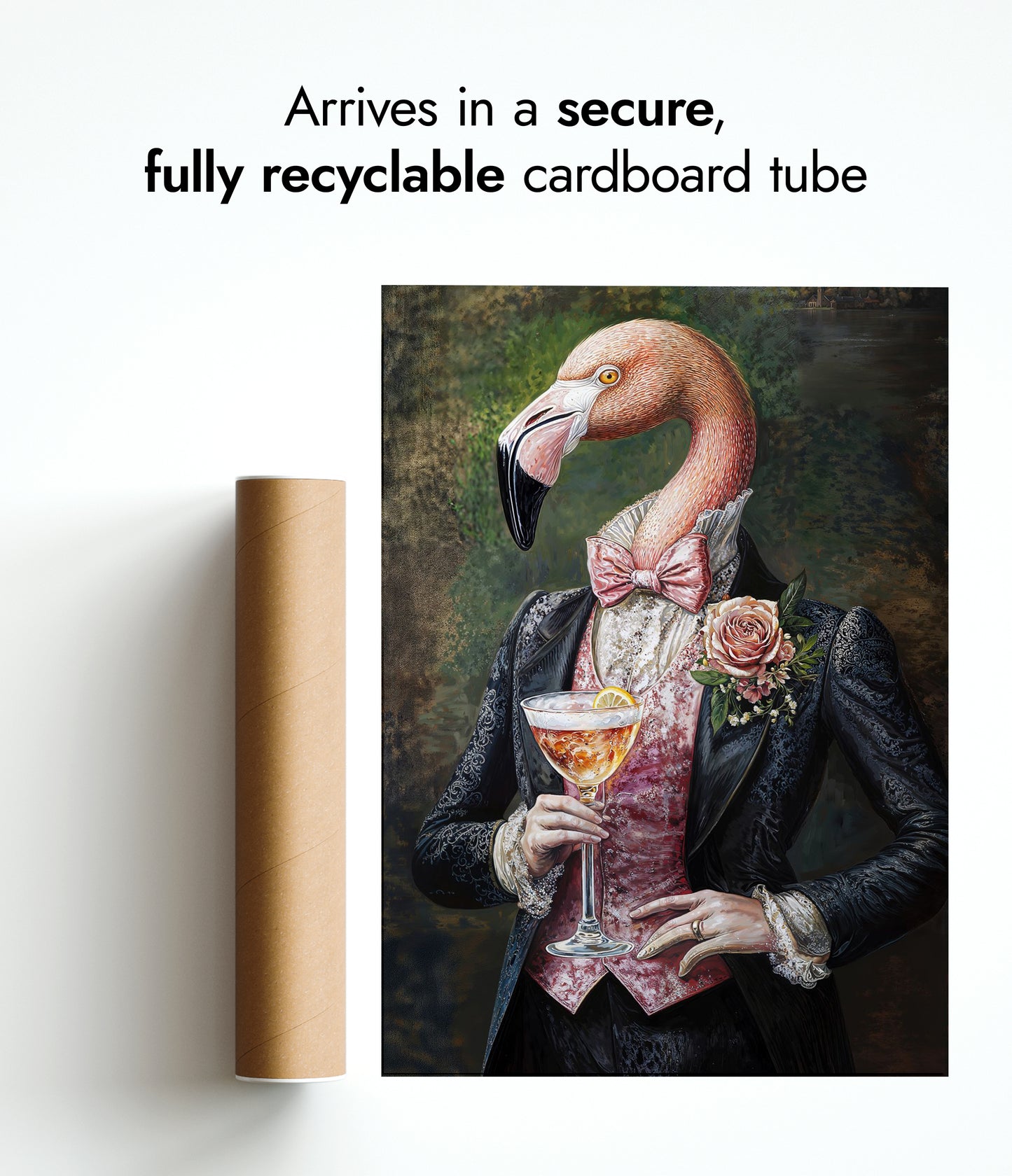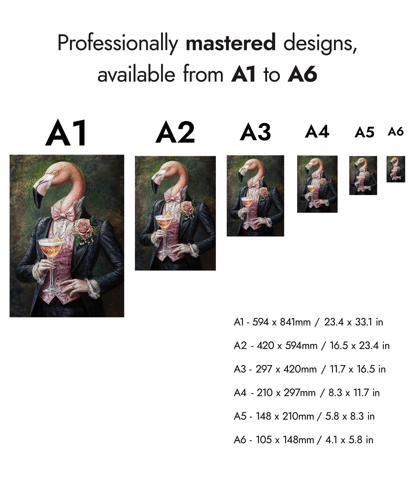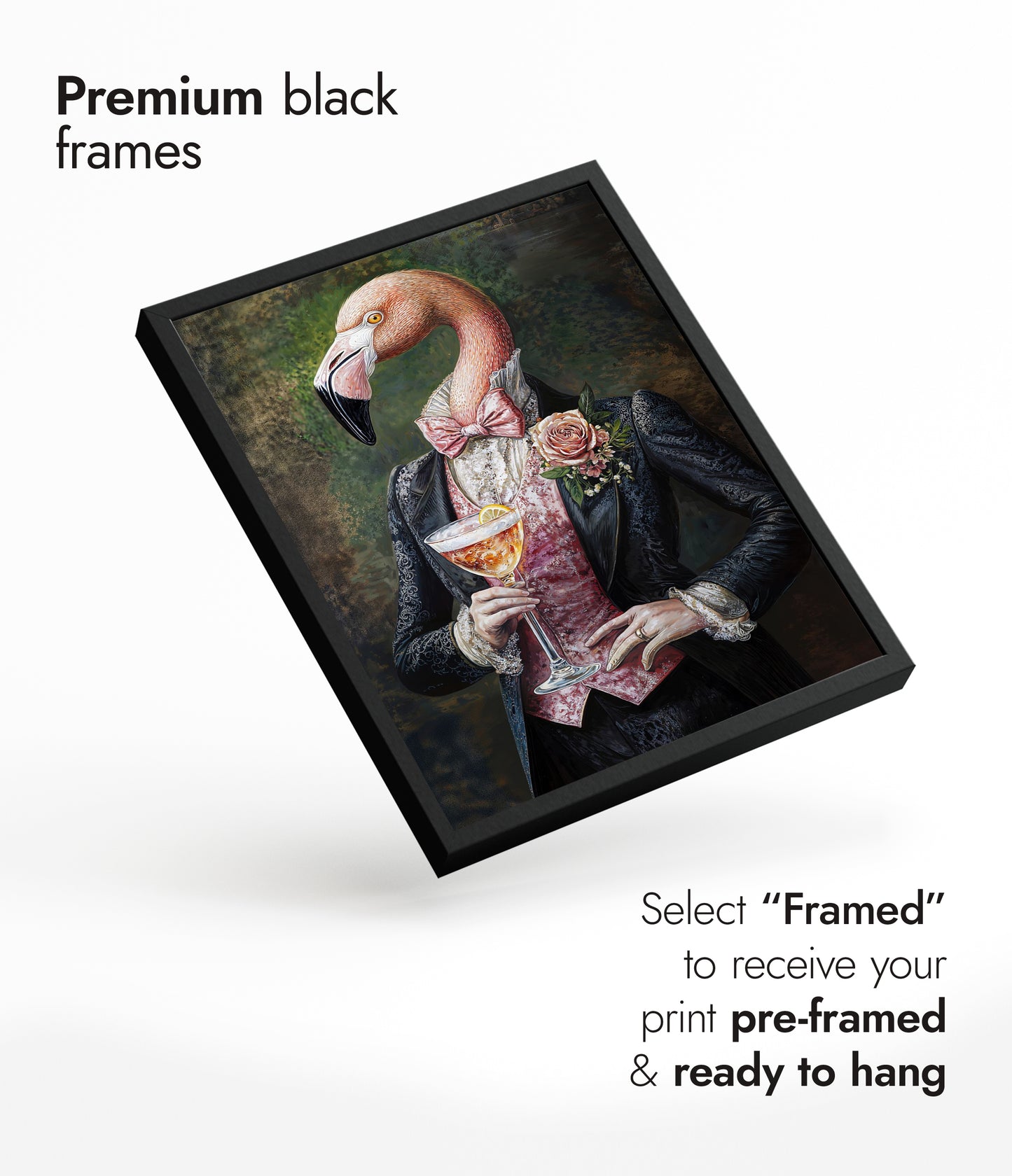 This whimsical flamingo poster presents an intriguing blend of nature and history, featuring a flamingo in Tudor-style attire. The richly detailed illustration portrays the flamingo with a pink bow tie and floral boutonniere, elegantly holding a cocktail. This vintage-inspired artwork combines humor with sophistication, making it a unique addition to any animal or historical art collection.