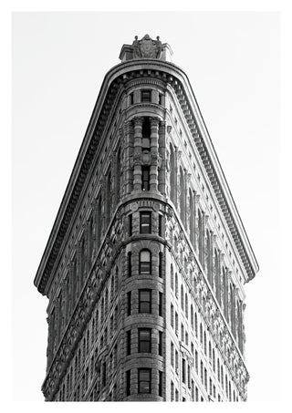 This striking poster captures the iconic Flatiron Building in New York in a crisp black and white portrait. Emphasizing the architectural elegance and historical significance of this landmark, this photographic print highlights the building's intricate details and unique triangular shape, making it a perfect addition to any collection of urban architecture and cityscape art.