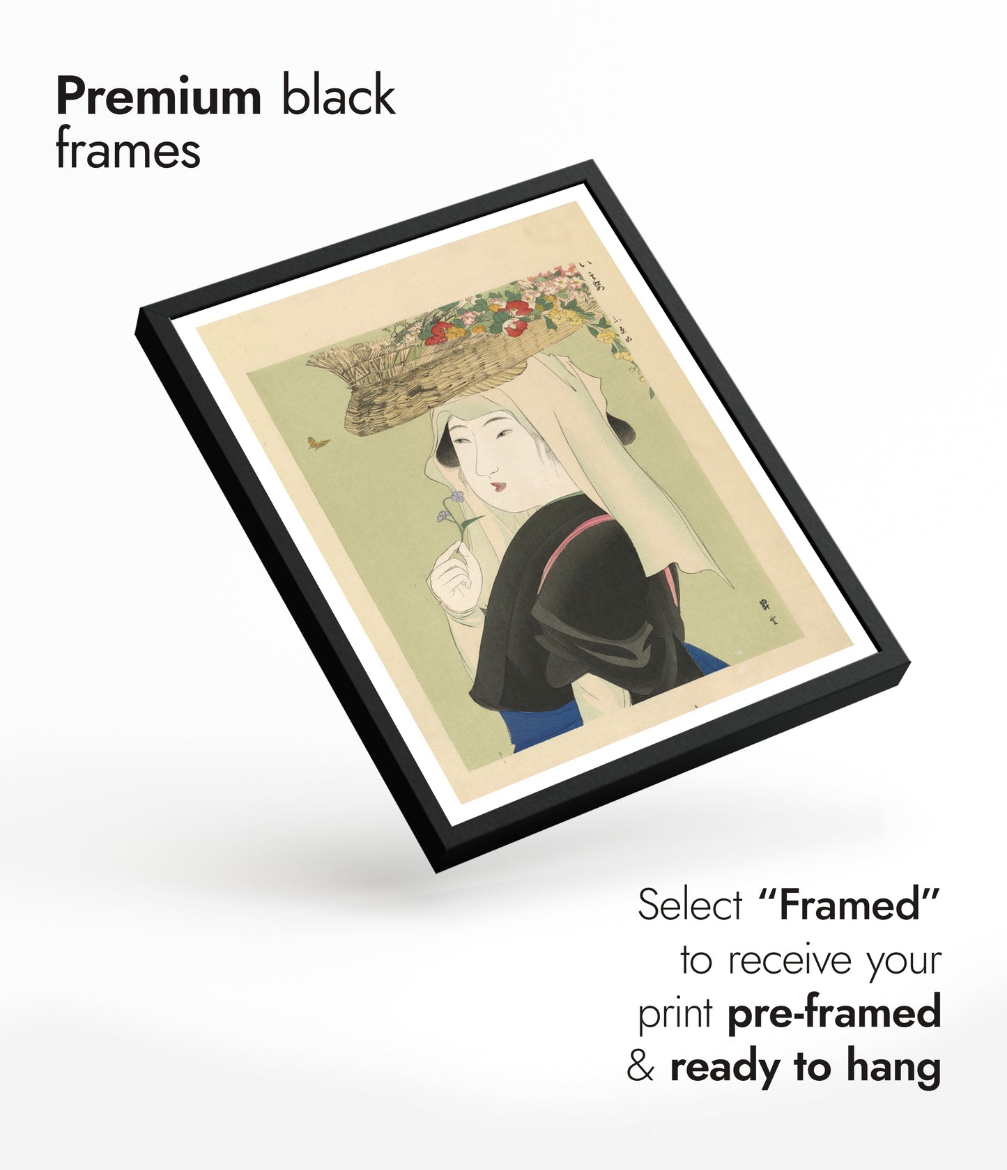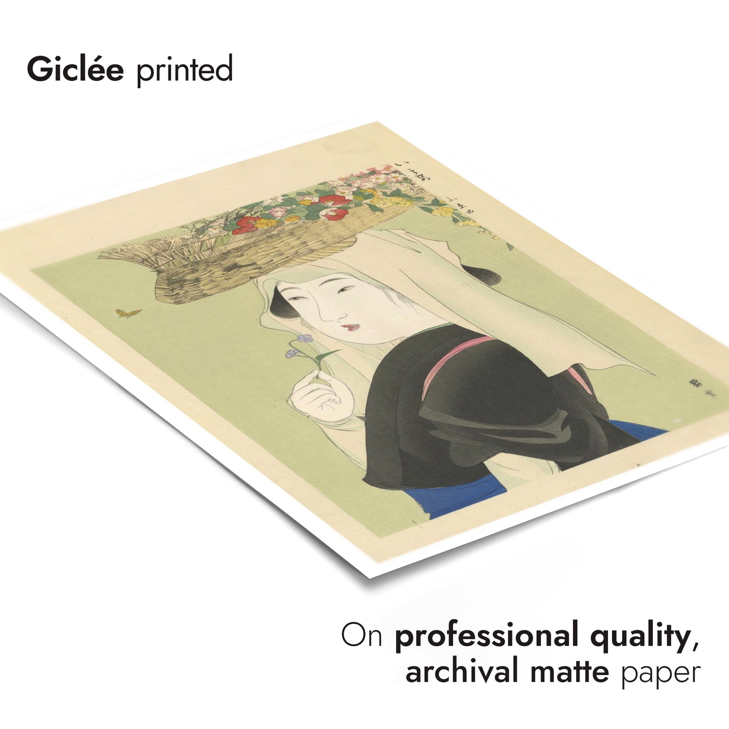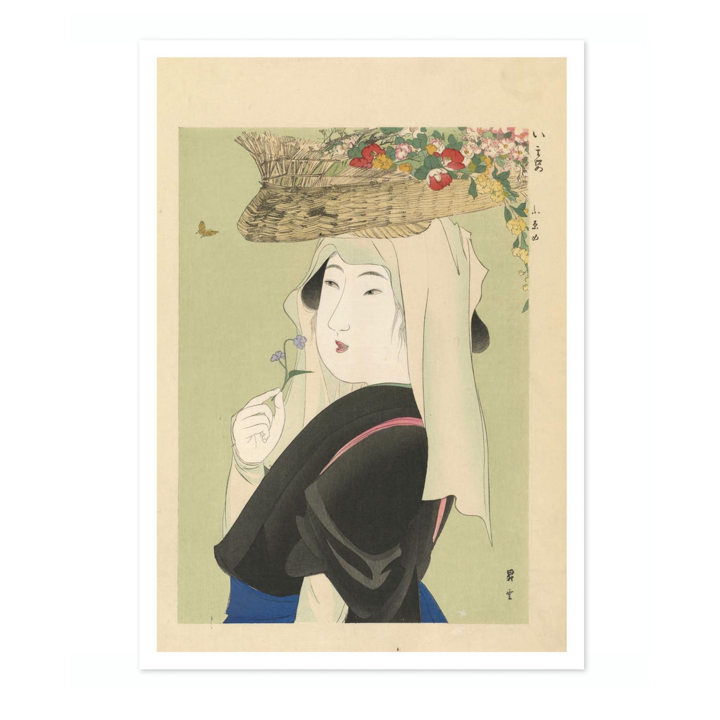 The "Flower Peddler From Ohara" poster by Yamamoto Shoun, created in 1906, features a serene depiction of a woman adorned in traditional attire, exuding elegance. The Shin-Hanga woodblock print captures her delicacy with soft beige and green hues. Her intricate basket of flowers and captivating gaze embody the essence of classic Japanese artistry, making it a compelling piece of Ukiyo-E tradition.