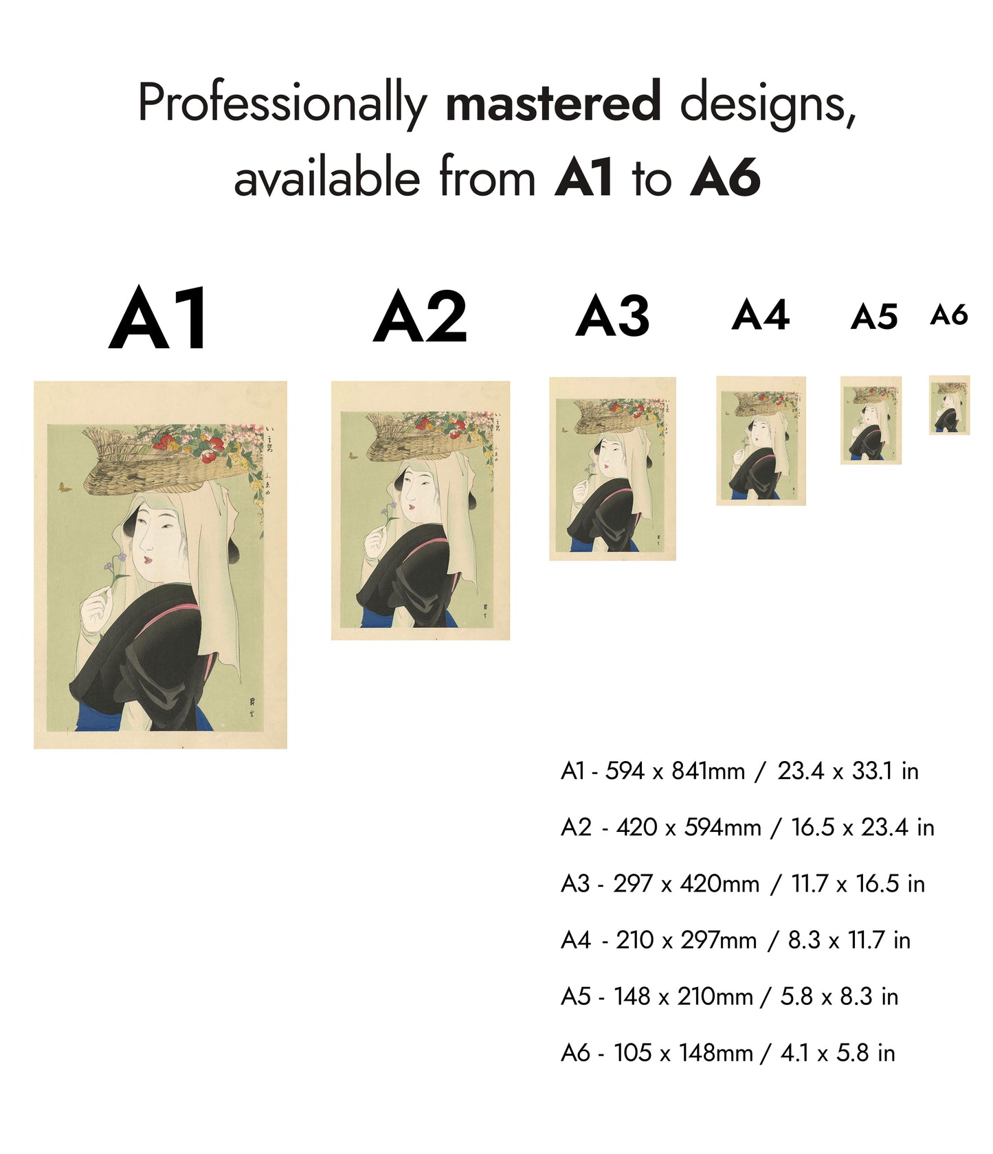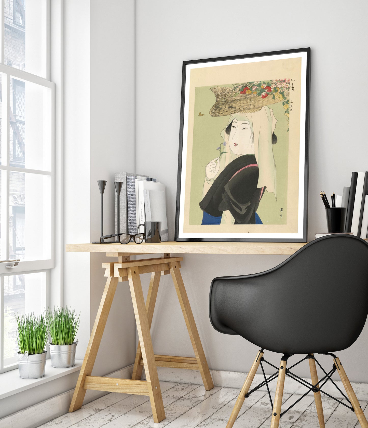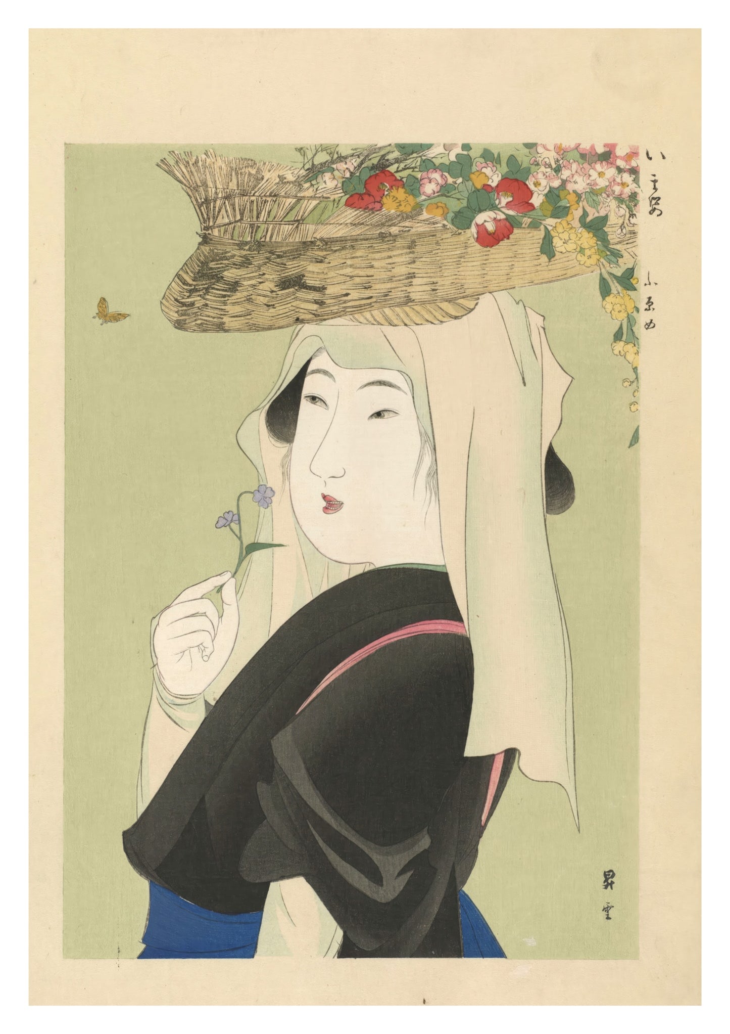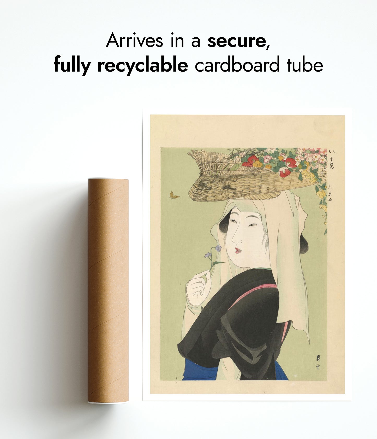 The "Flower Peddler From Ohara" poster by Yamamoto Shoun, created in 1906, features a serene depiction of a woman adorned in traditional attire, exuding elegance. The Shin-Hanga woodblock print captures her delicacy with soft beige and green hues. Her intricate basket of flowers and captivating gaze embody the essence of classic Japanese artistry, making it a compelling piece of Ukiyo-E tradition.