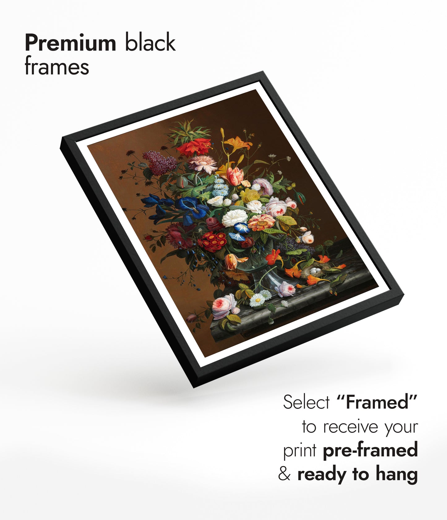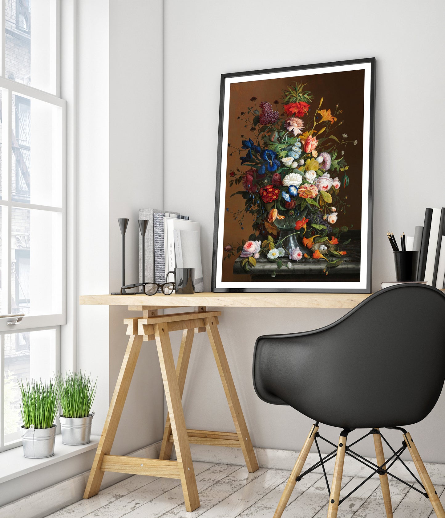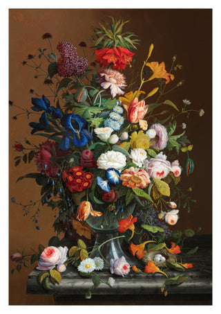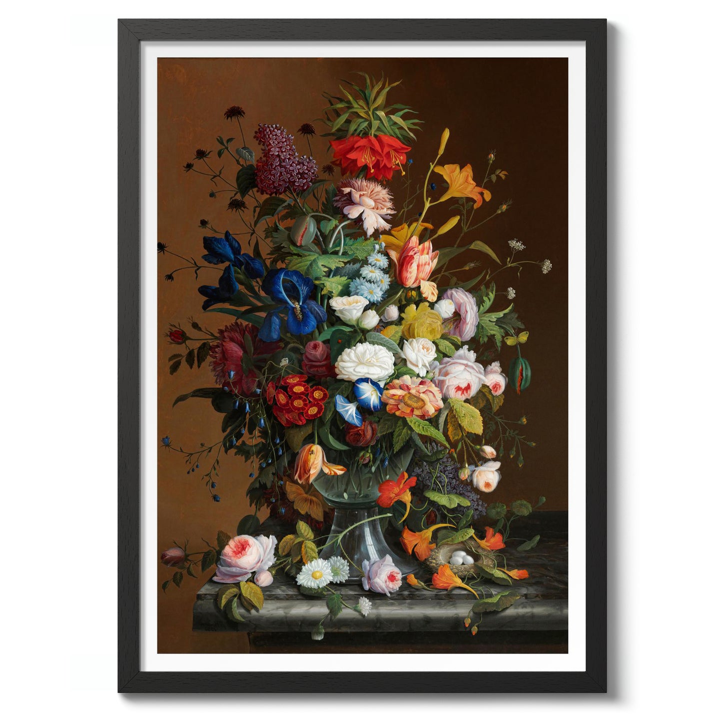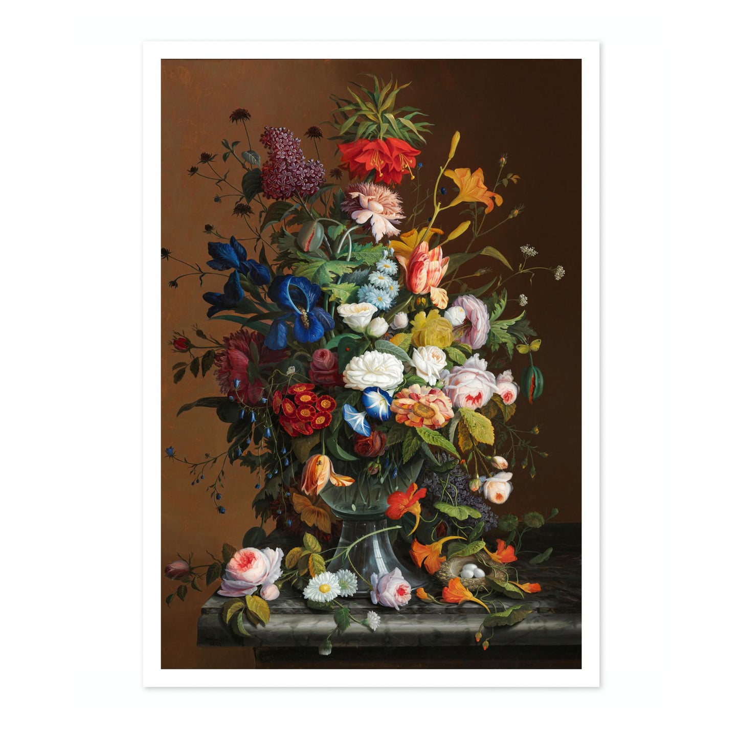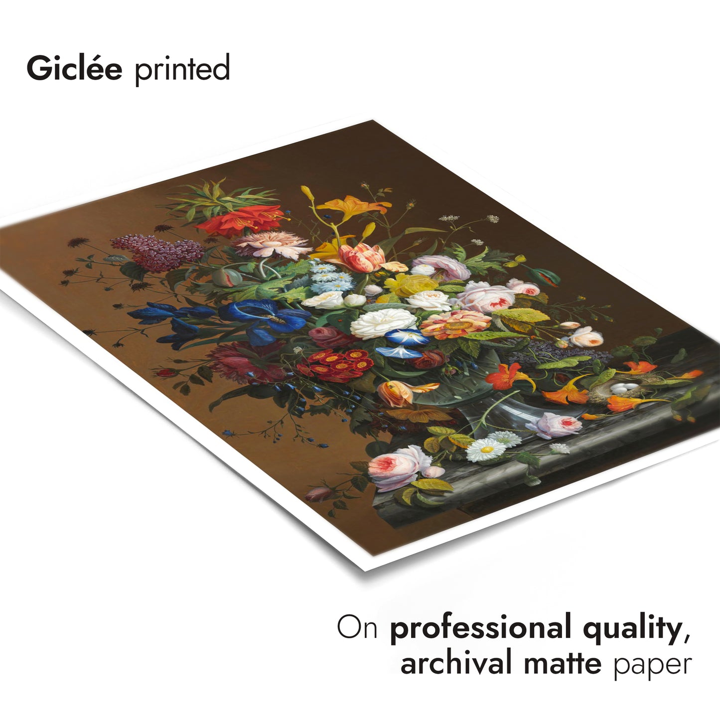 This floral poster, "Flower Still Life with Bird's Nest" by Severin Roesen, masterfully showcases an array of multicoloured blooms in a realistically rendered arrangement. Set in a vase, the lush bouquet includes roses, lilies, and irises, accompanied by delicate foliage and a bird's nest. This botanical illustration captures the intricate beauty and vibrancy of nature in exquisite detail.