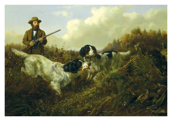 This "Flushing Grouse, Long Lake - Hamilton County, New York" poster by Arthur Fitzwilliam Tait portrays a dynamic hunting scene with two Spaniels and a hunter amidst a lush countryside. The realistic depiction captures the essence of rural life and hunting, emphasizing the bond between the dogs and the hunter. Ideal for those appreciating countryside and hunting-themed art prints.