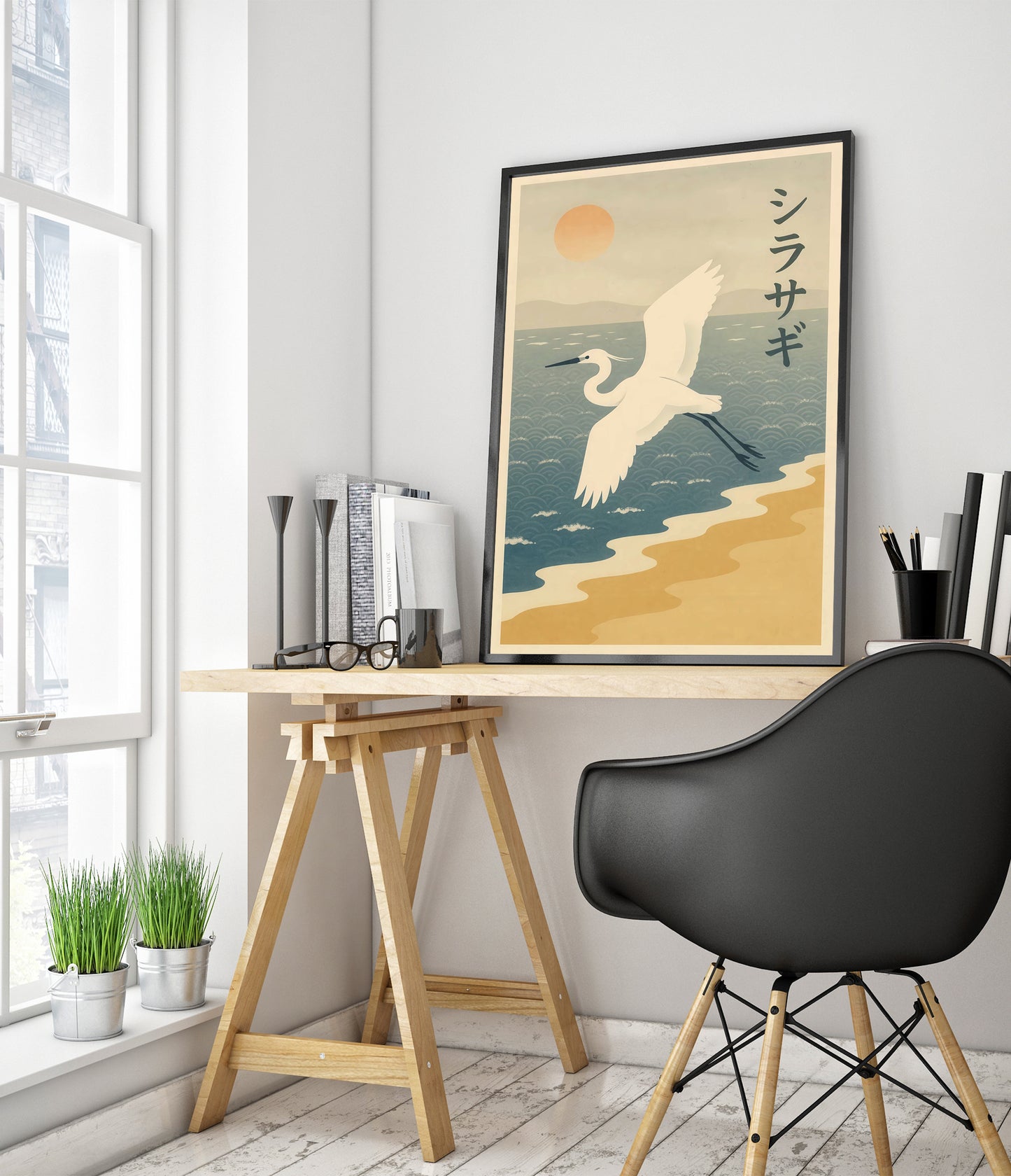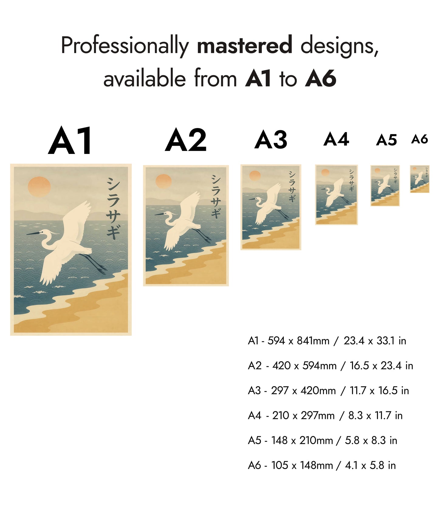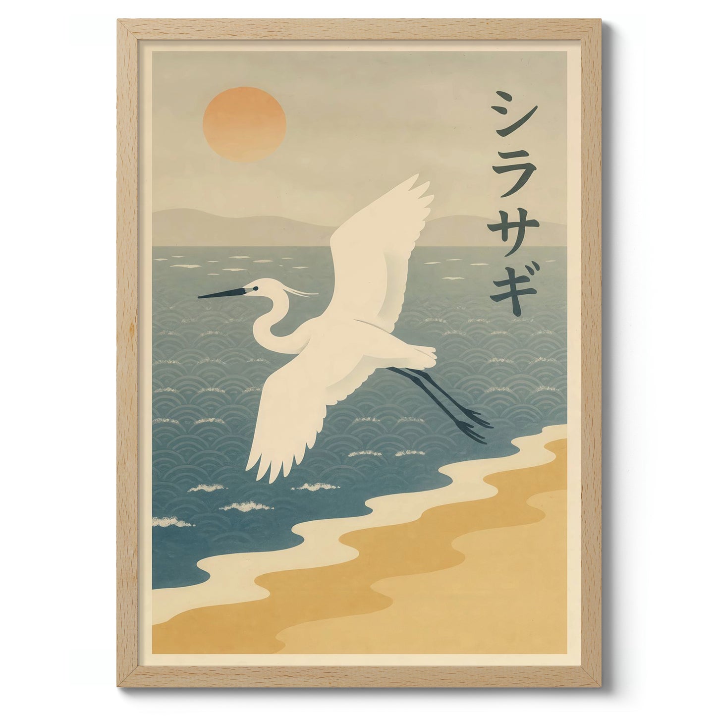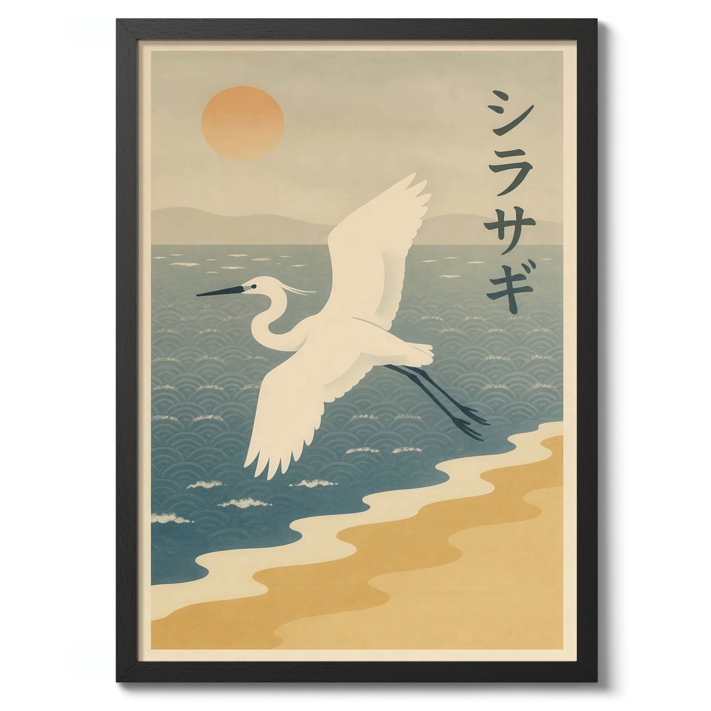 This anime-inspired poster features a graceful crane soaring above an intricate ocean pattern. Set against a serene backdrop of mountains and a setting sun, the artwork captures the essence of tranquility. Japanese characters add cultural authenticity, while the soft pastel tones evoke a peaceful evening by the bay. Perfect for lovers of Japanese art and nature-themed wall decor.