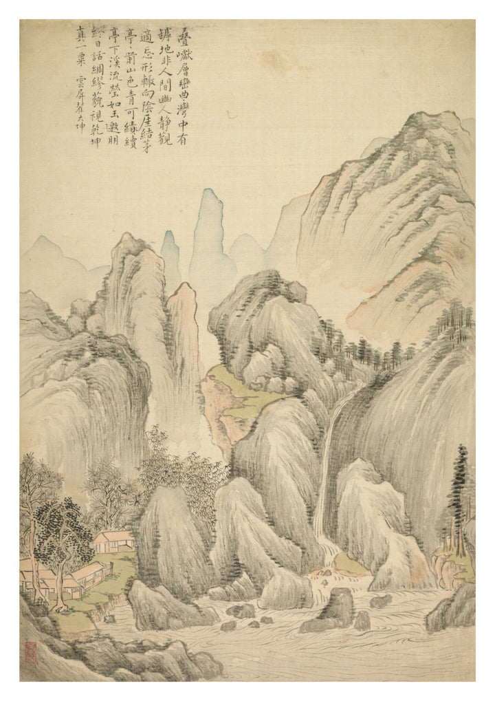 "Folded Hills & Layered Peaks" by Tsubaki Chinzan is a traditional Japanese woodblock poster portraying serene mountain landscapes. This exquisite illustration captures rugged cliffs, cascading waterfalls, and a tranquil river flowing through a tucked-away village. Ideal for adding a touch of timeless nature-inspired beauty to any space.