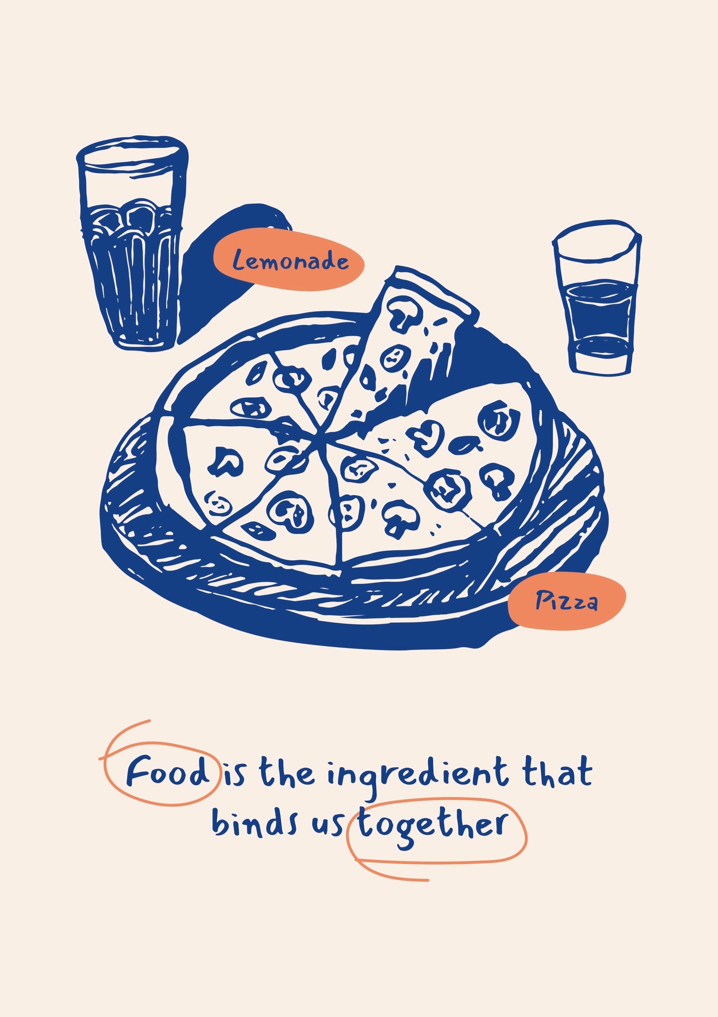 This modern, graphic poster titled "Food Binds Us Together" features a playful illustration of a pizza and lemonade. Highlighting the message, "Food is the ingredient that binds us together," this design captures the joy and connection of shared meals. Ideal for kitchen or dining decor, this illustration combines simplicity with a heartwarming theme.