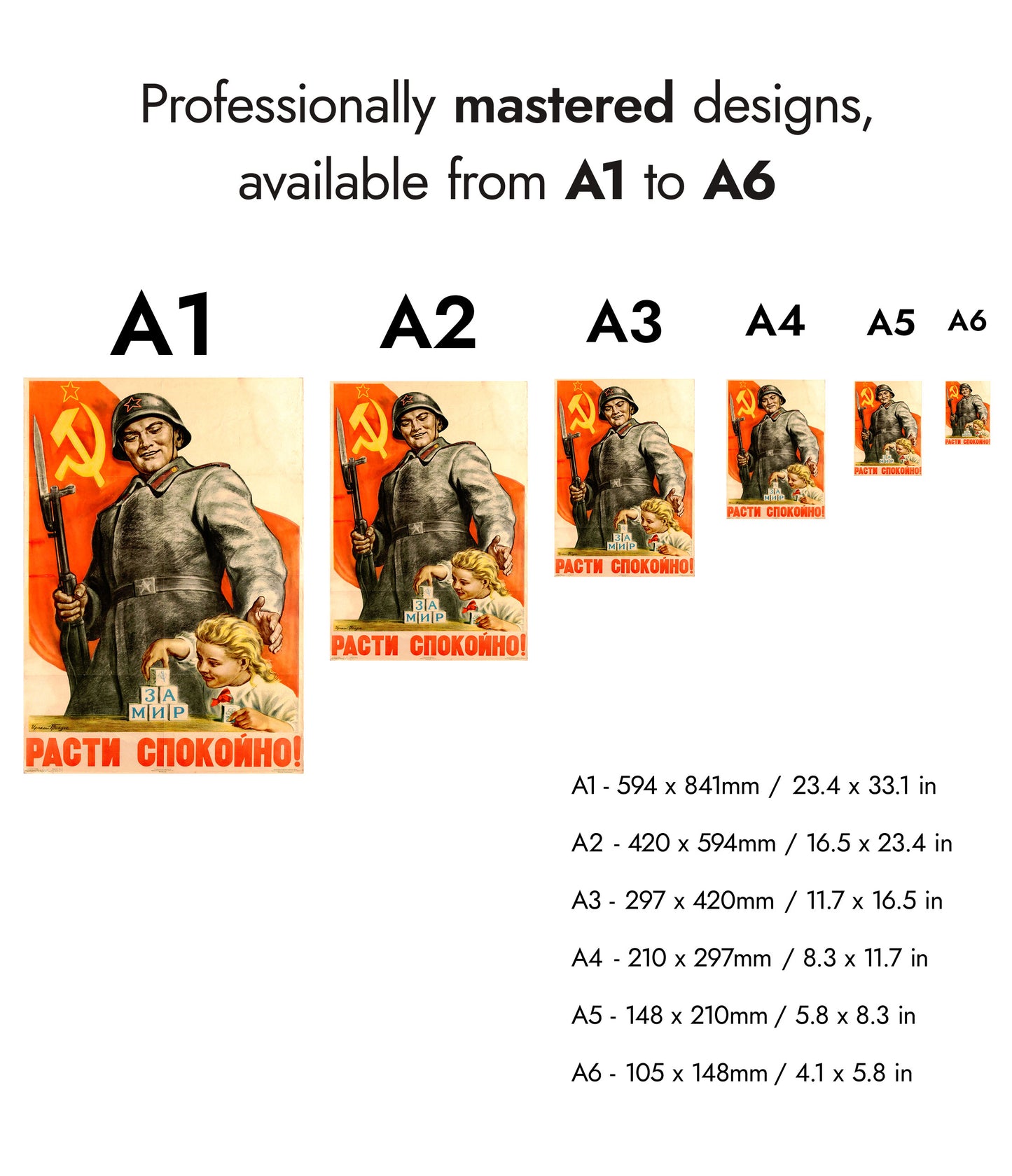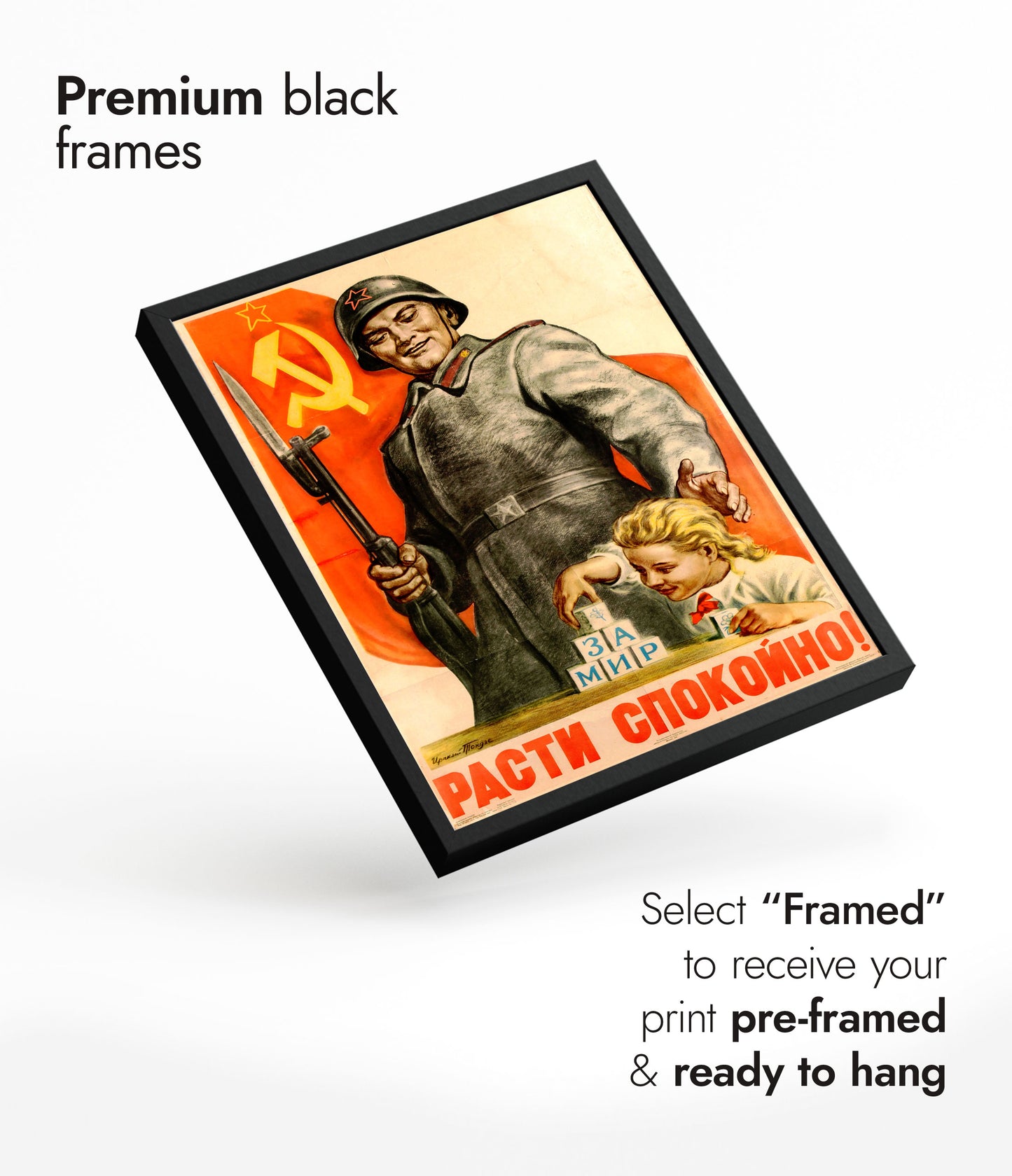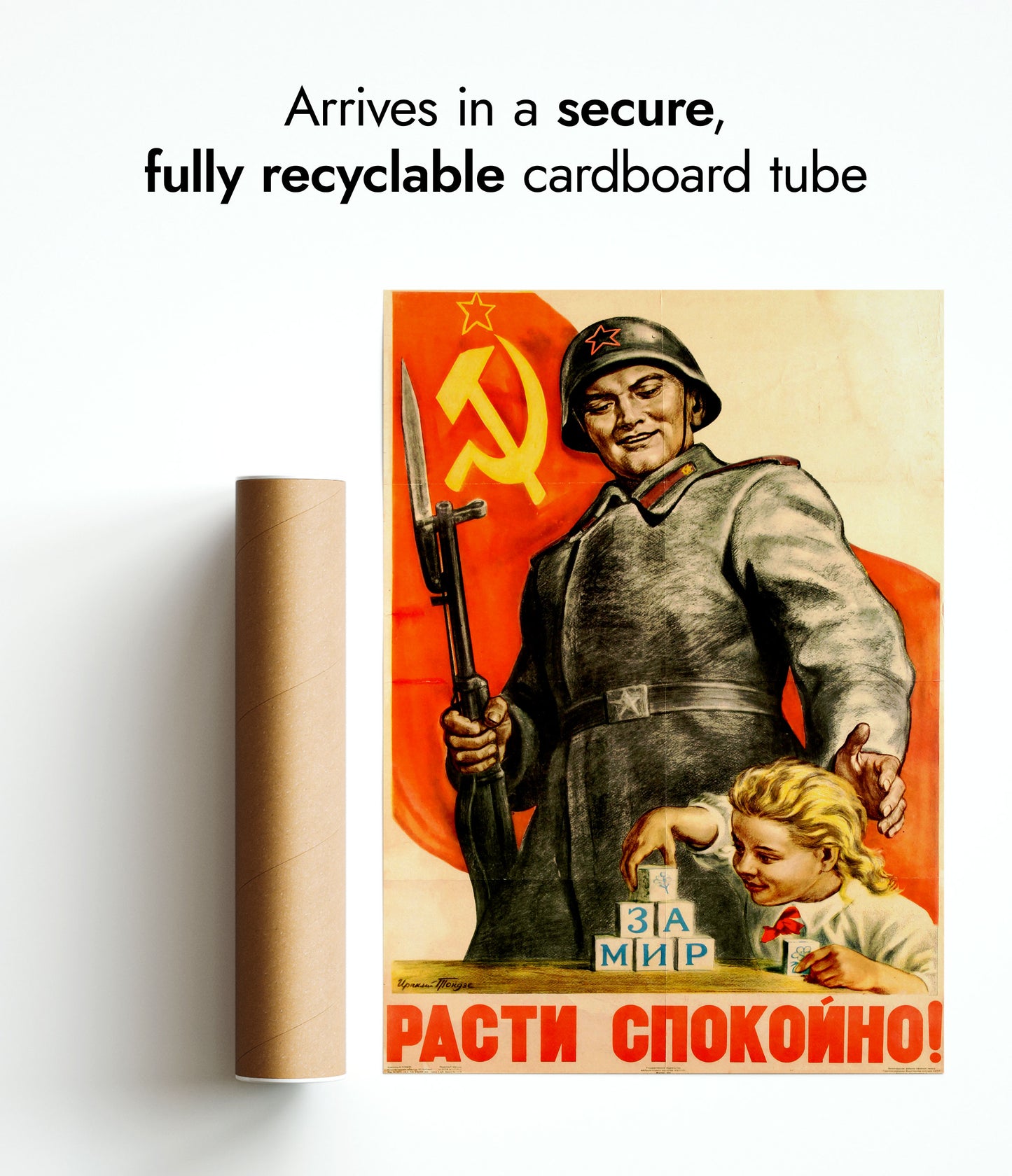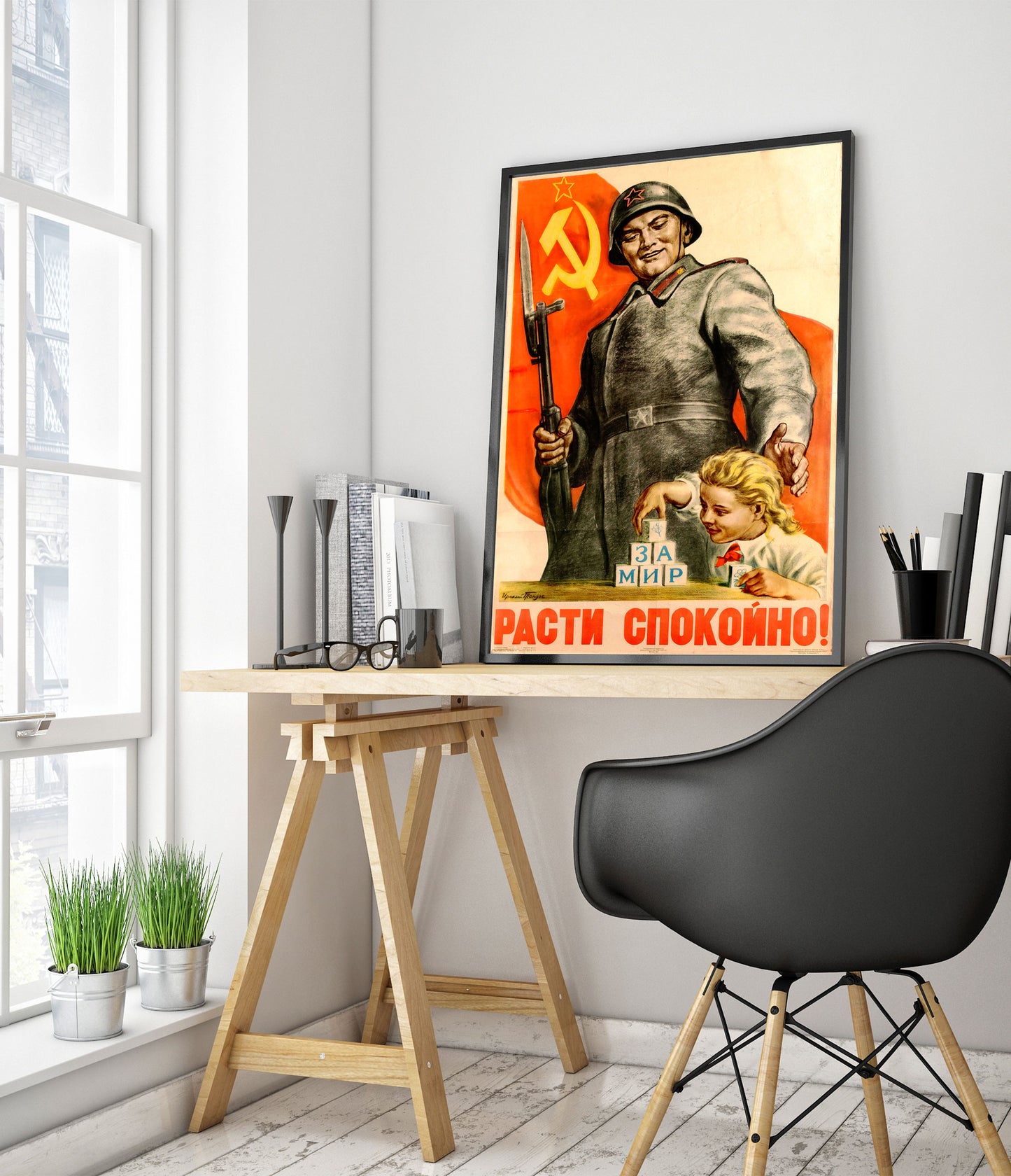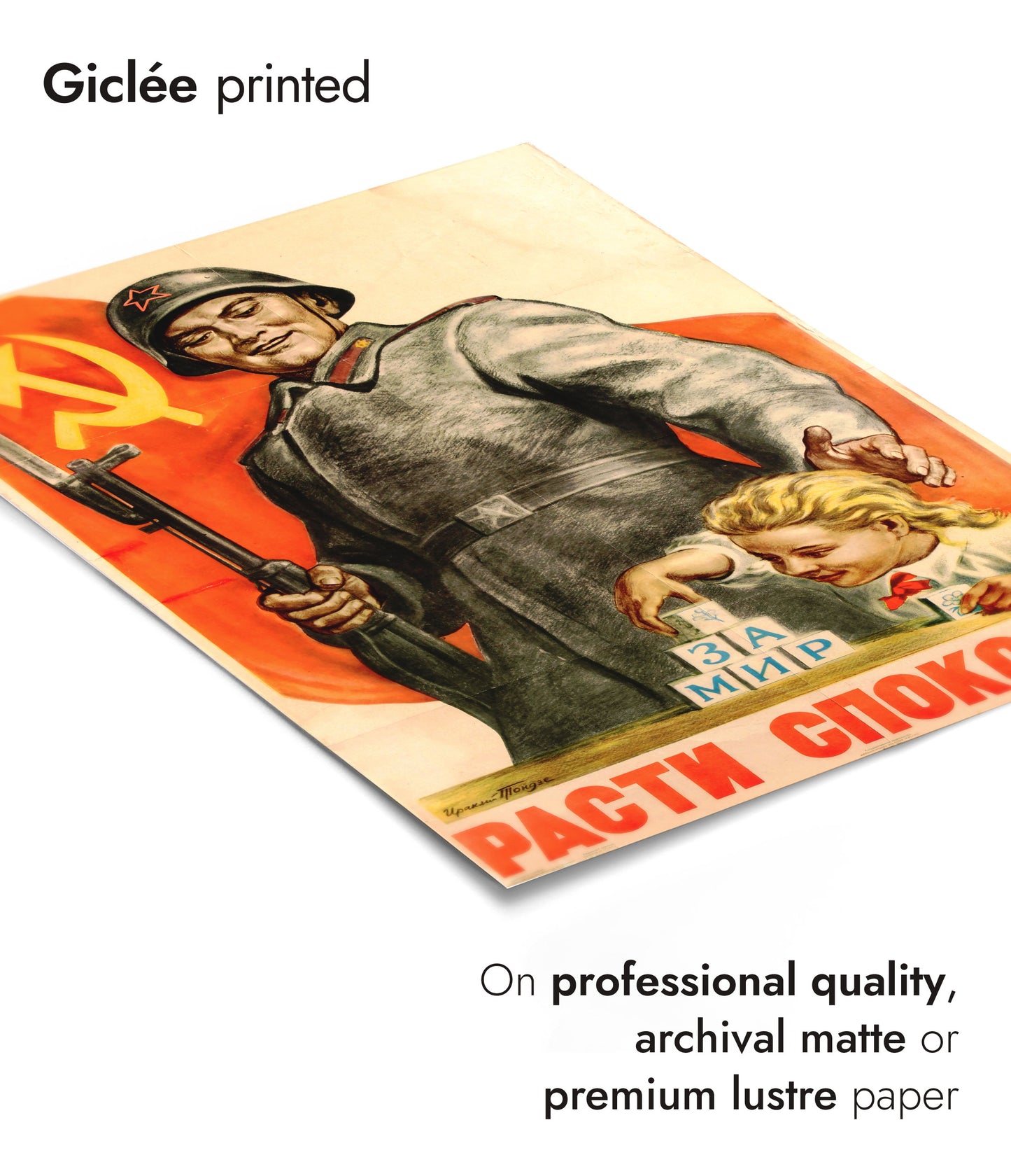 This vintage propaganda poster, "For The Future of the Youth," features a Soviet soldier protectively standing behind a smiling child. Emphasizing themes of war, communism, and Russian pride, the illustration showcases bold, symbolic imagery with a prominent red star and hammer and sickle in the background. Ideal for enthusiasts of vintage illustration and historical posters.