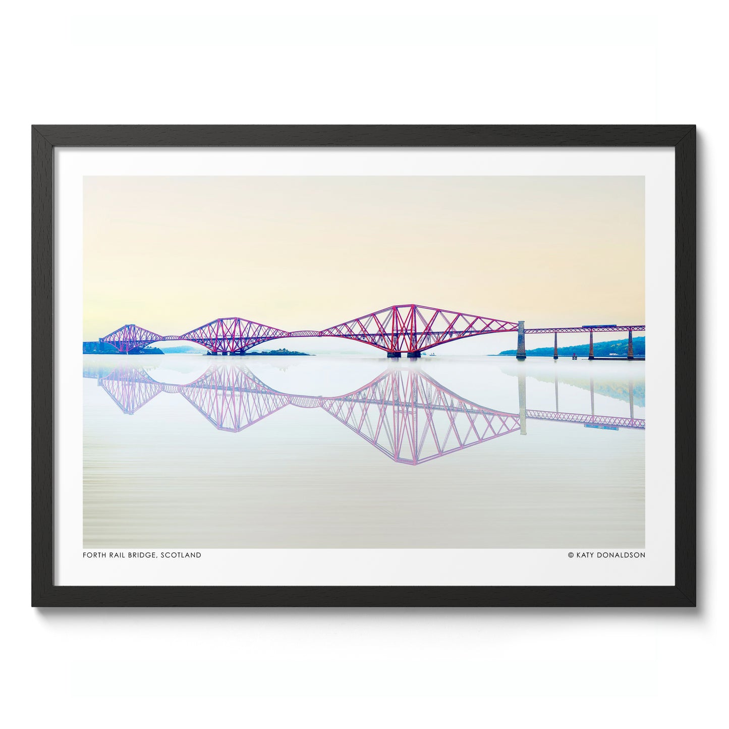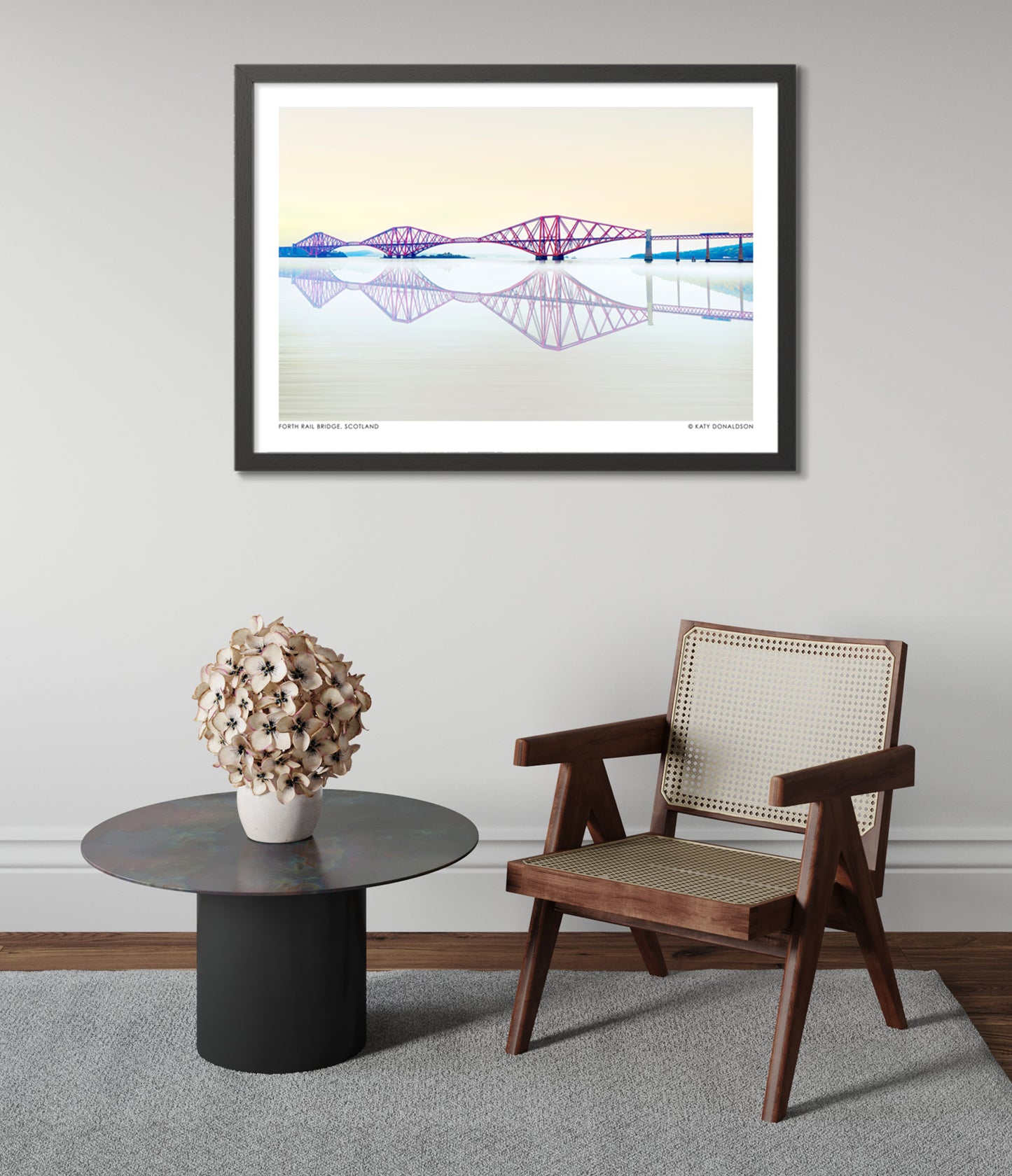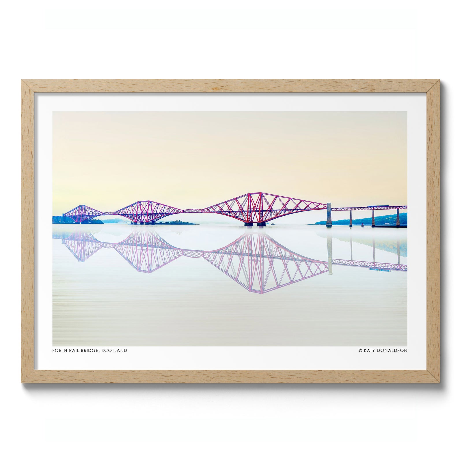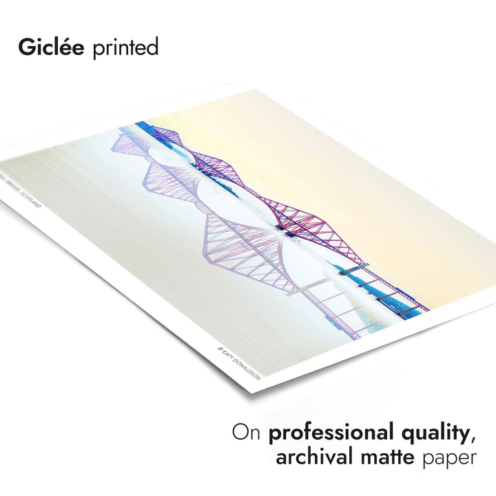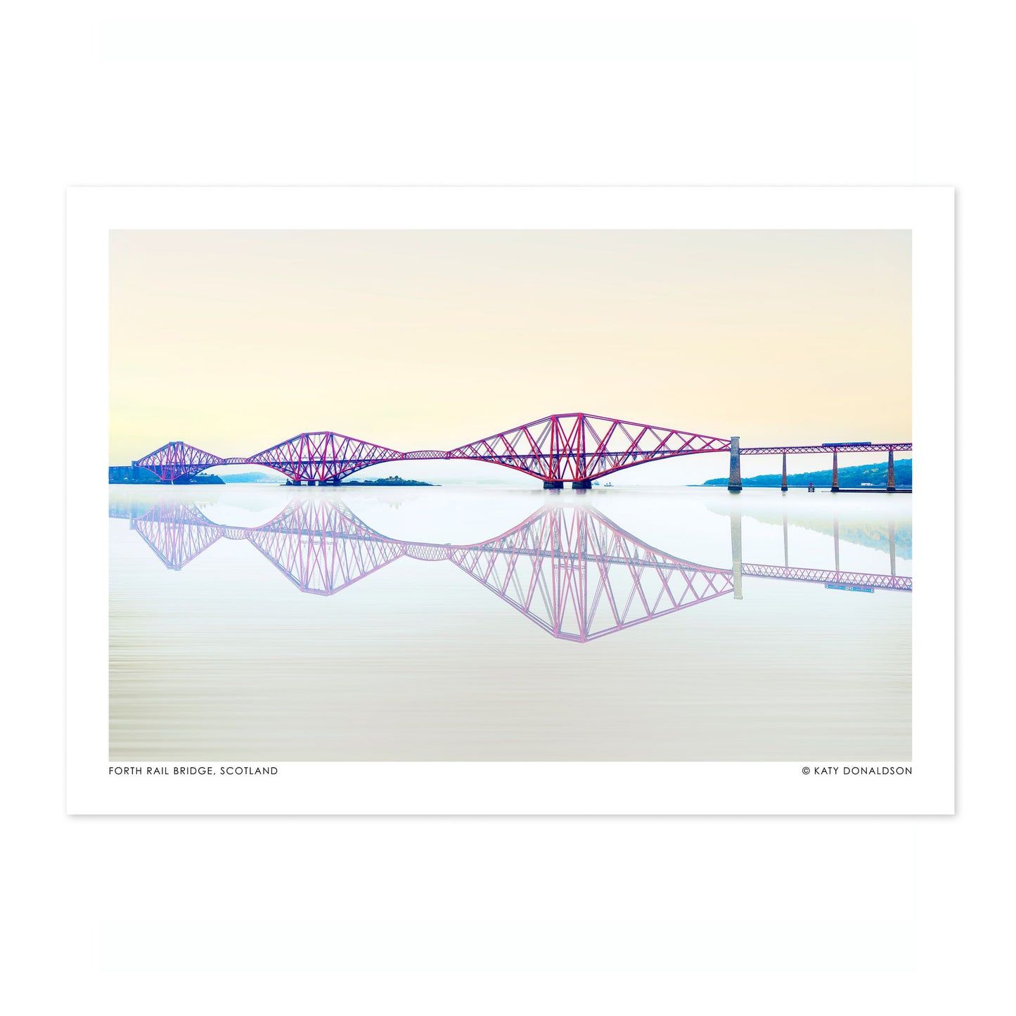 This poster captures the iconic Forth Rail Bridge in Scotland with striking minimalist elegance. The intricate red steel structure is artistically mirrored in the tranquil waters below, creating a symmetrical and serene landscape. Photographed by Katy Donaldson, this travel-themed piece highlights the bridge's engineering beauty amidst a soft, muted sky, offering a timeless Scottish vista perfect for any décor.