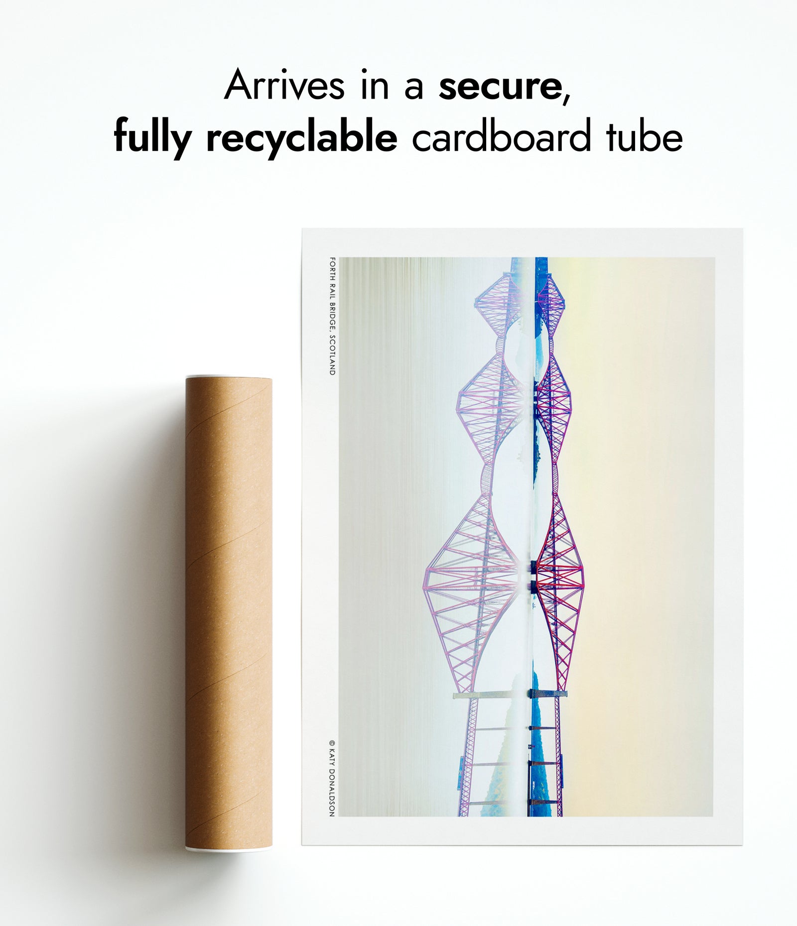 All orders are securely packed in recyclable, eco-friendly solutions. Frames are protected with sustainable bubble wrap alternatives inside thick boxes. Print only orders are shipped in heavy-duty cardboard tubes or protective hard-backed envelopes.