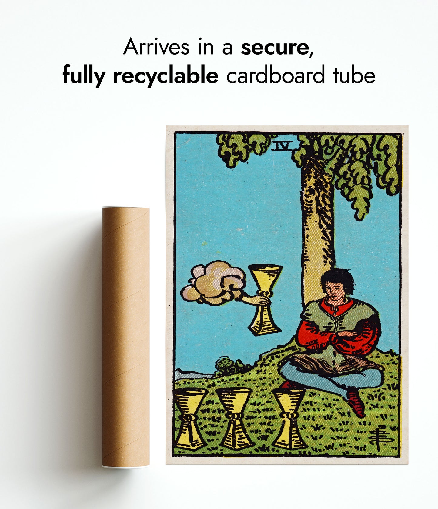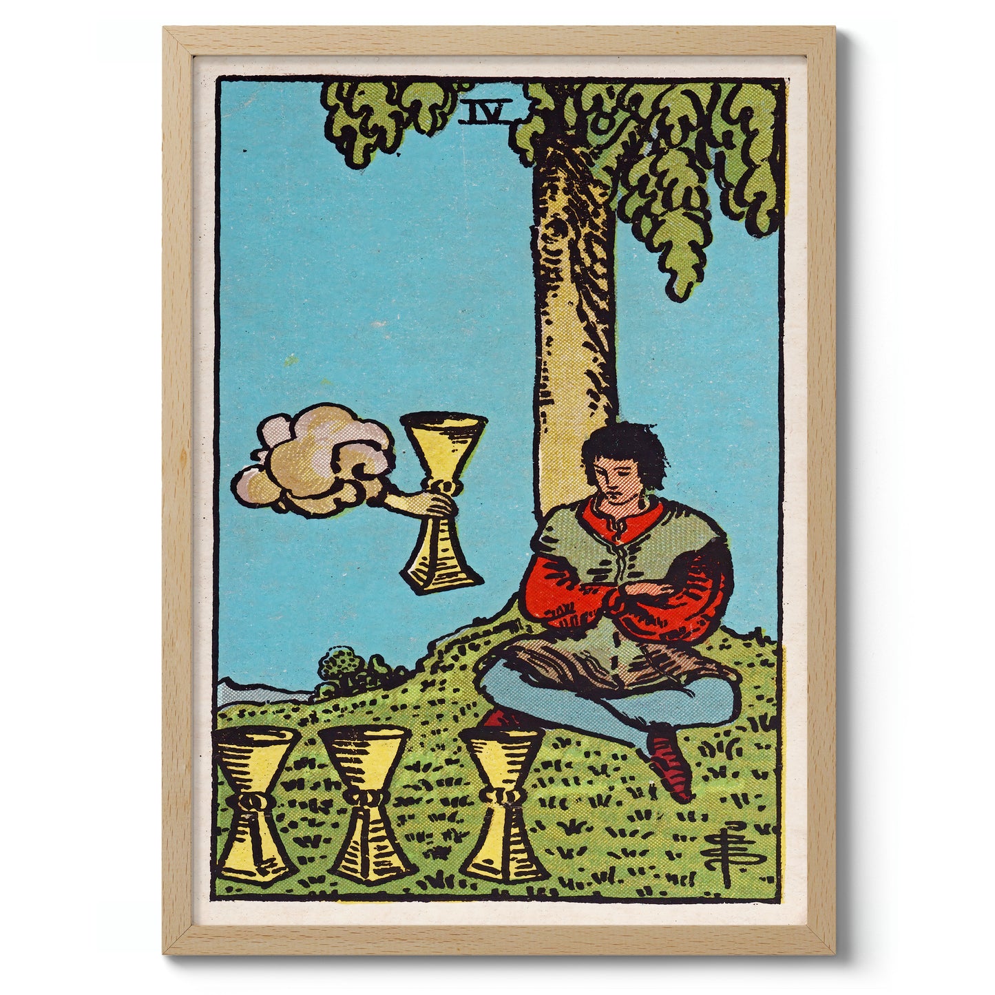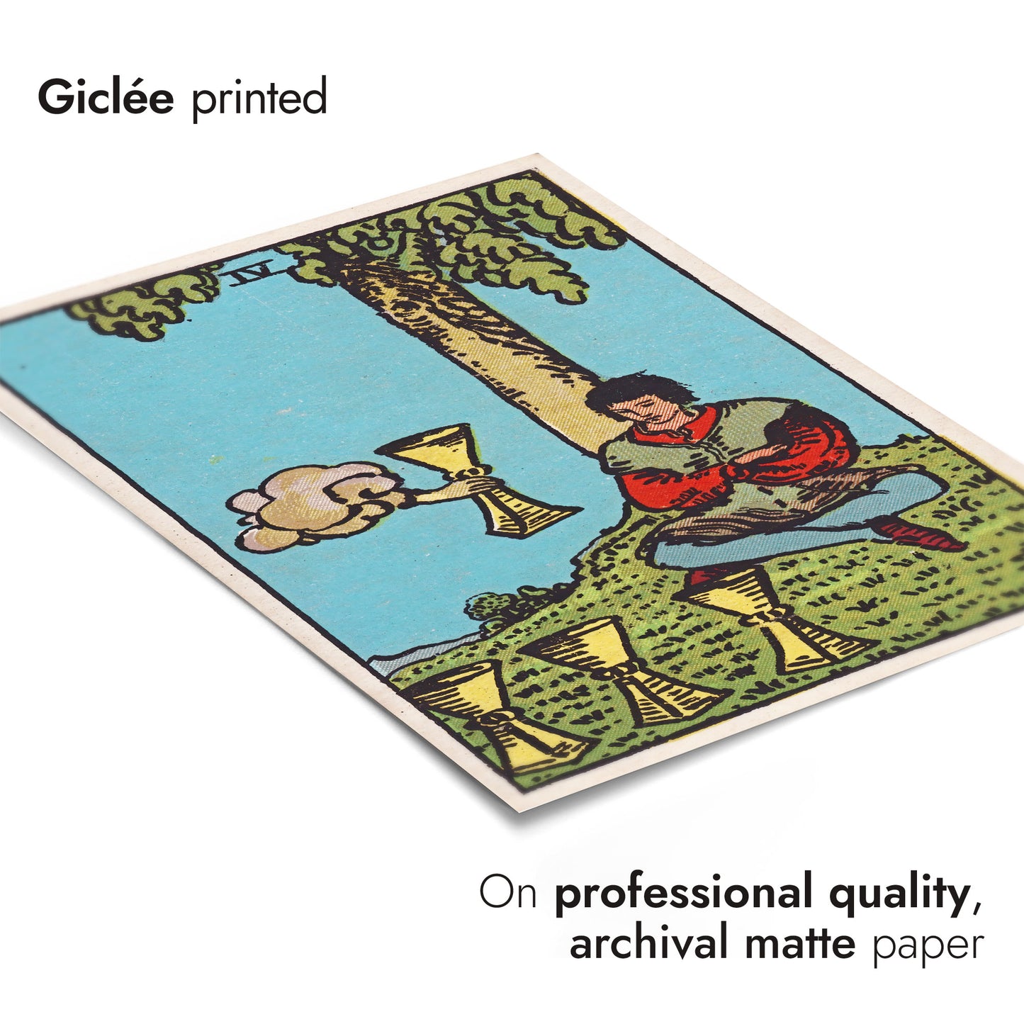 This "Four of Cups" tarot card poster features a vintage illustration of a seated figure under a tree, contemplating three cups with a fourth cup emerging from a cloud. The detailed artwork incorporates a serene landscape with earthy tones and mystical elements, making it a perfect addition for fans of tarot, magic, and fantasy themes.