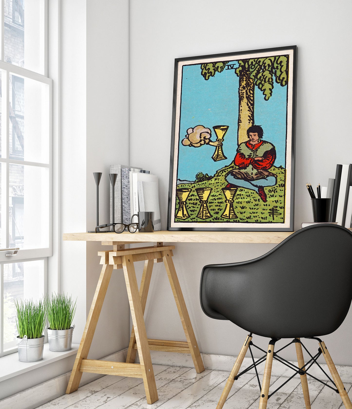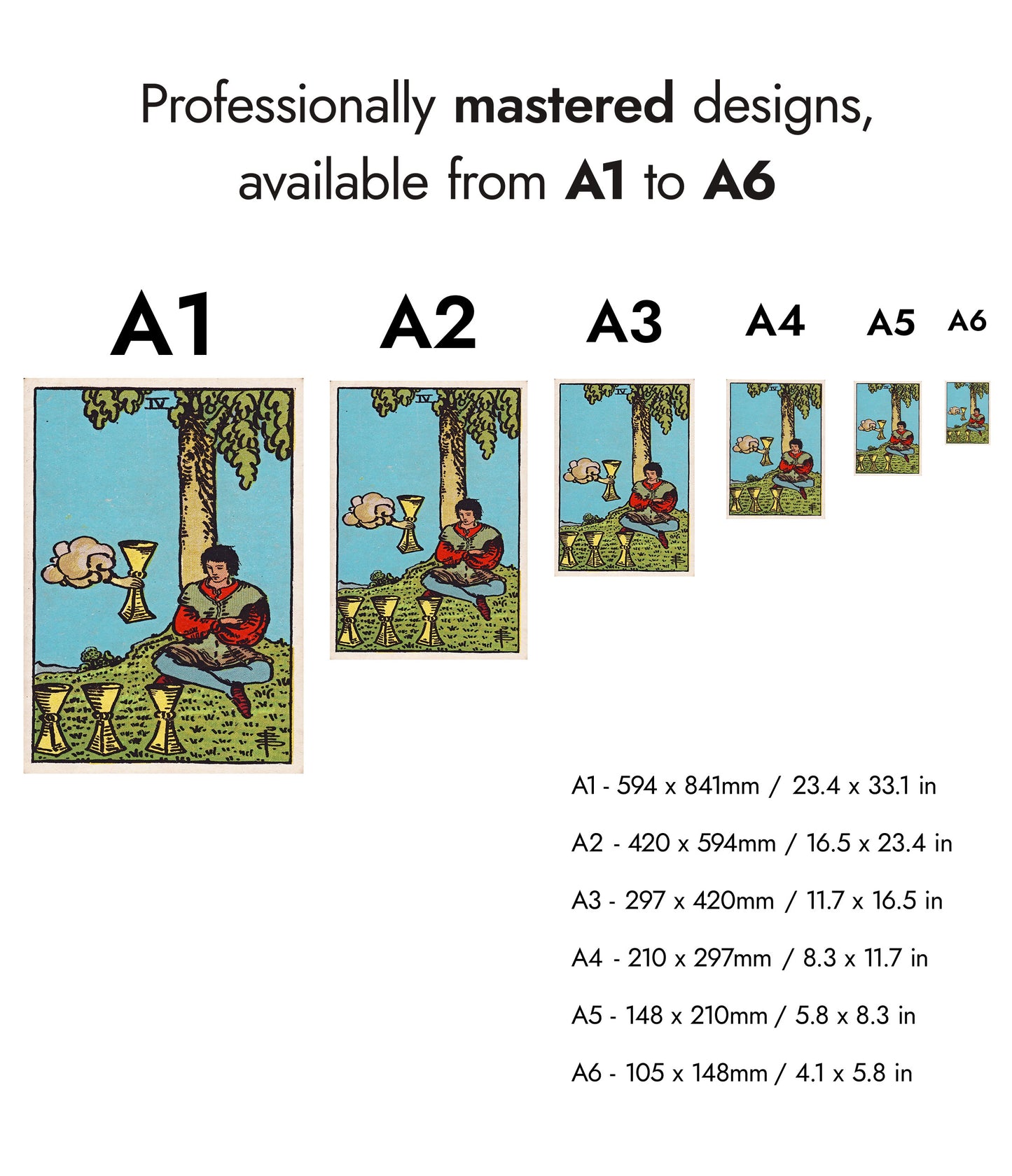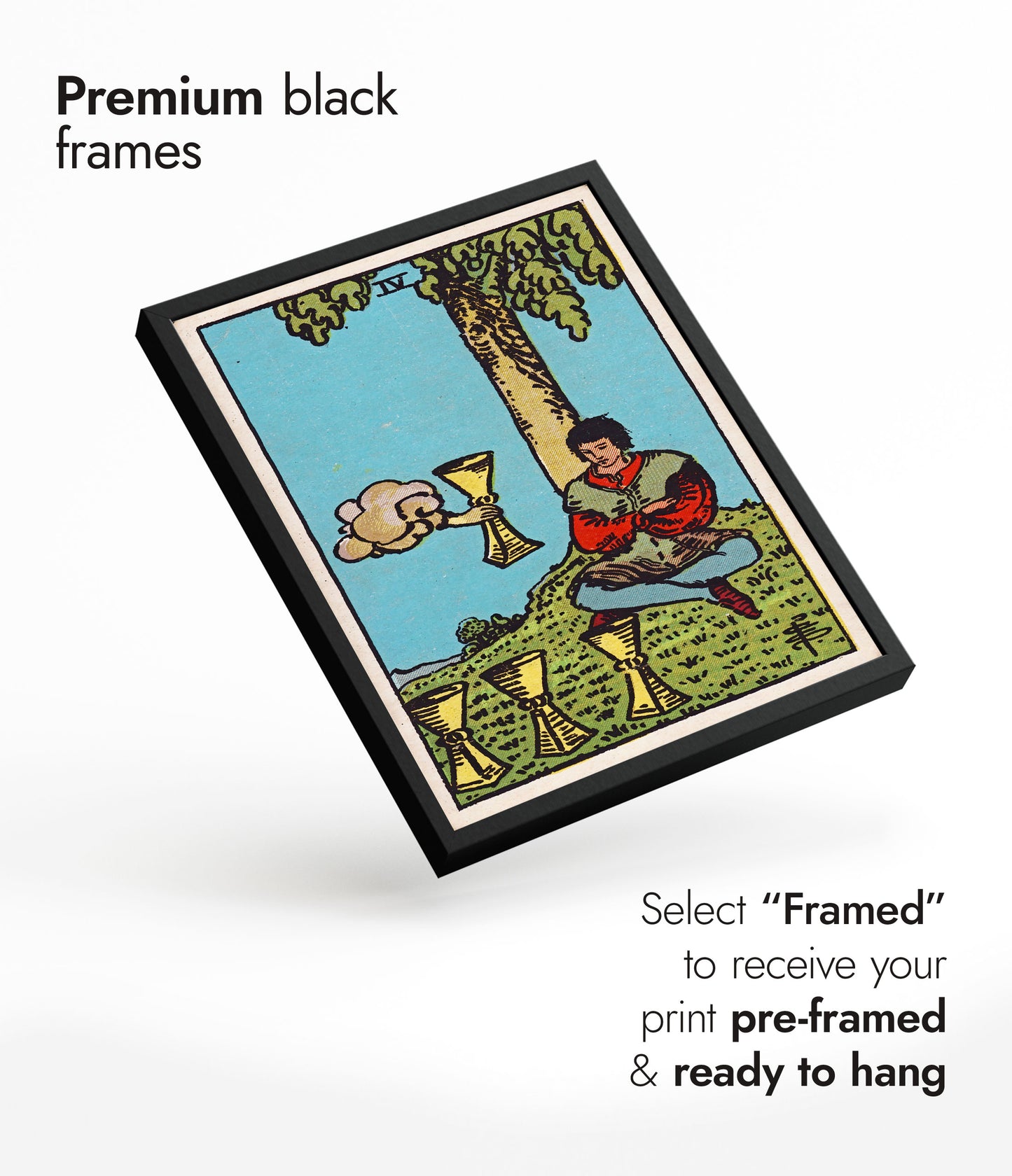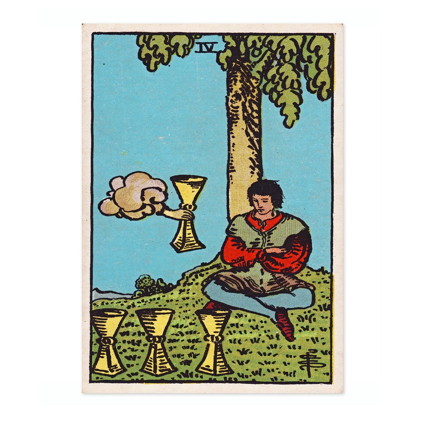 This "Four of Cups" tarot card poster features a vintage illustration of a seated figure under a tree, contemplating three cups with a fourth cup emerging from a cloud. The detailed artwork incorporates a serene landscape with earthy tones and mystical elements, making it a perfect addition for fans of tarot, magic, and fantasy themes.