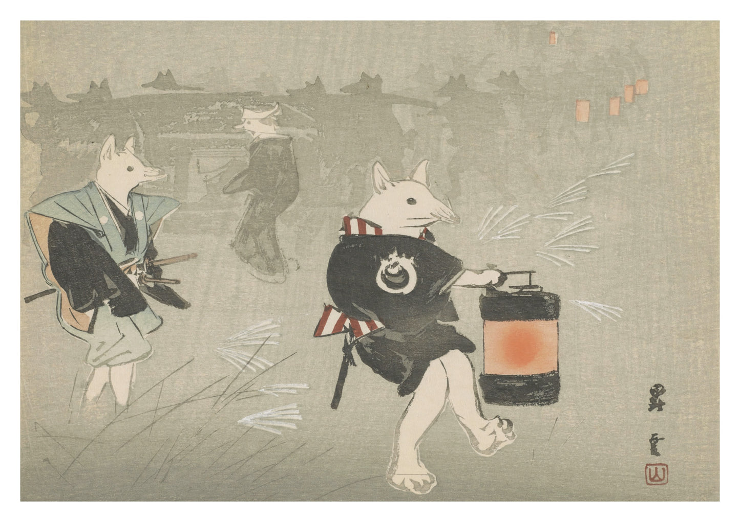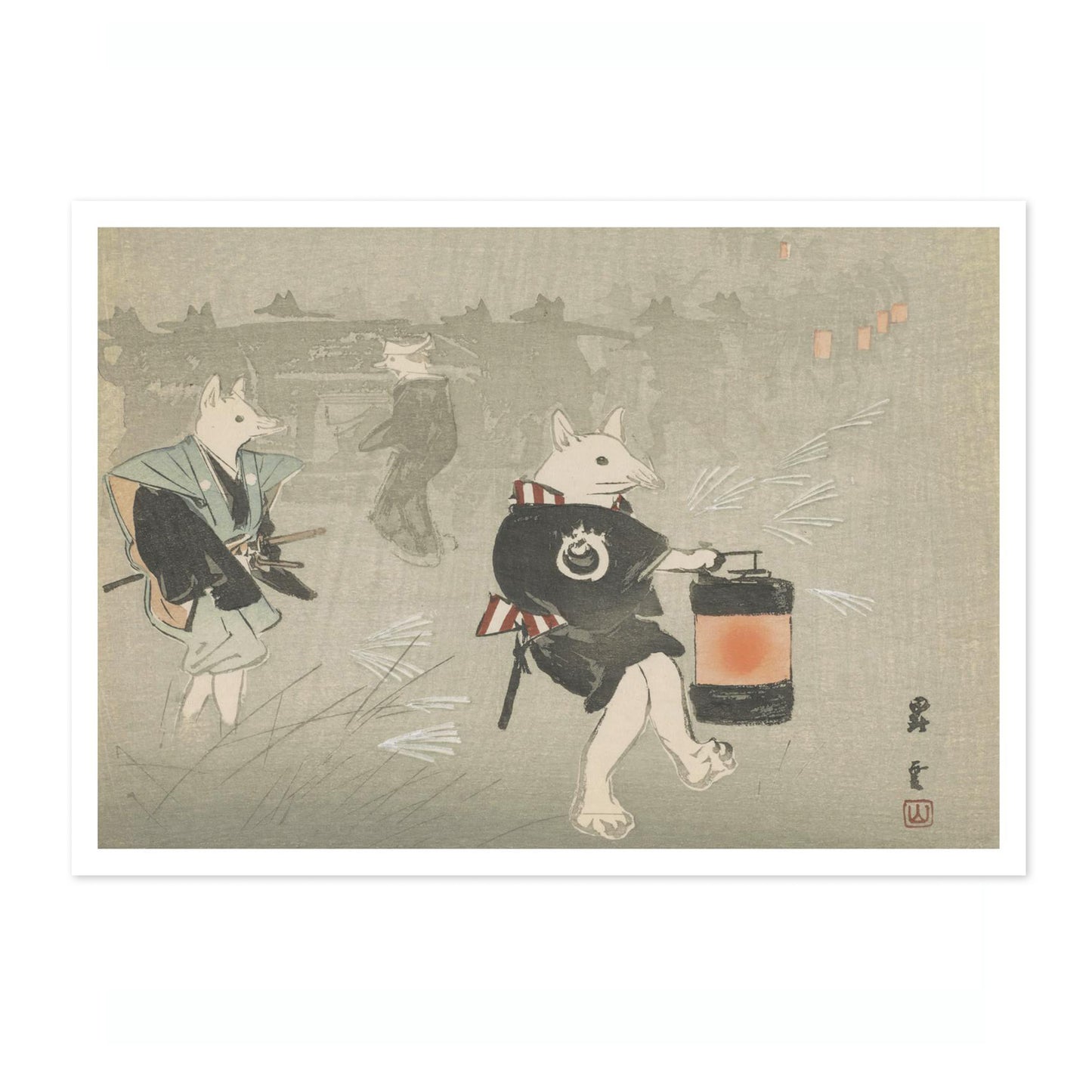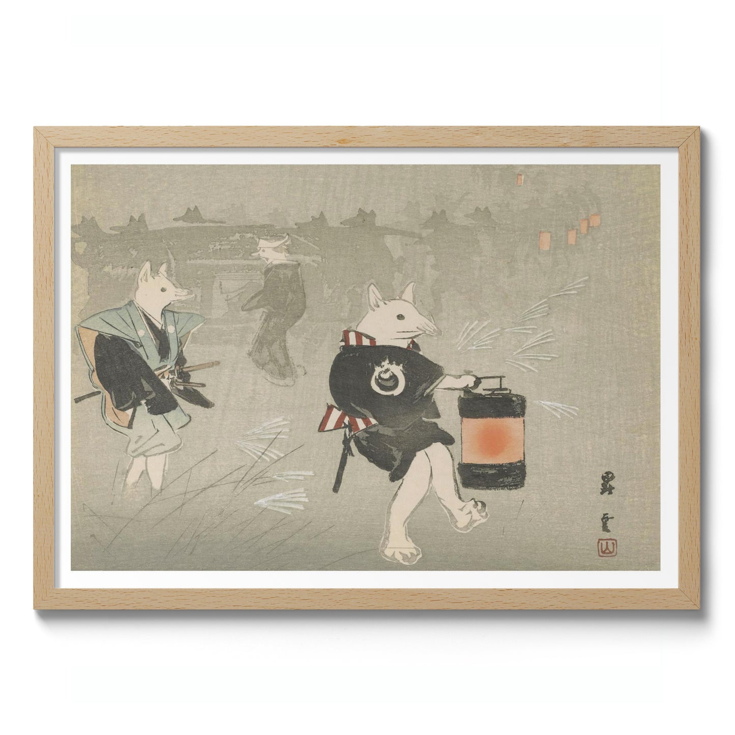 The "Fox Wedding Procession" poster by Yamamoto Shoun captures a mystical scene with anthropomorphic foxes, dressed in traditional attire, illuminated by lanterns under a dusky sky. Executed in a traditional Japanese woodblock style, the poster features soft beige and grey tones, depicting the ethereal ambiance as fog swirls around grass and lanterns. Perfect for those intrigued by Ukiyo-E and Shin-Hanga art.