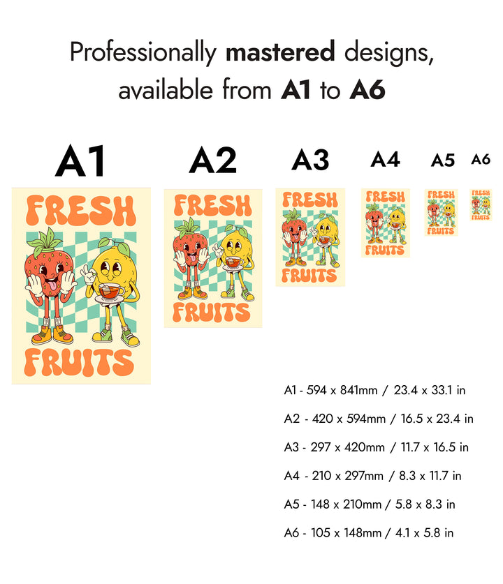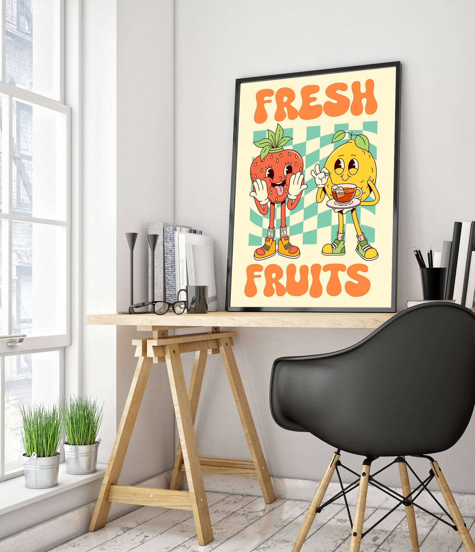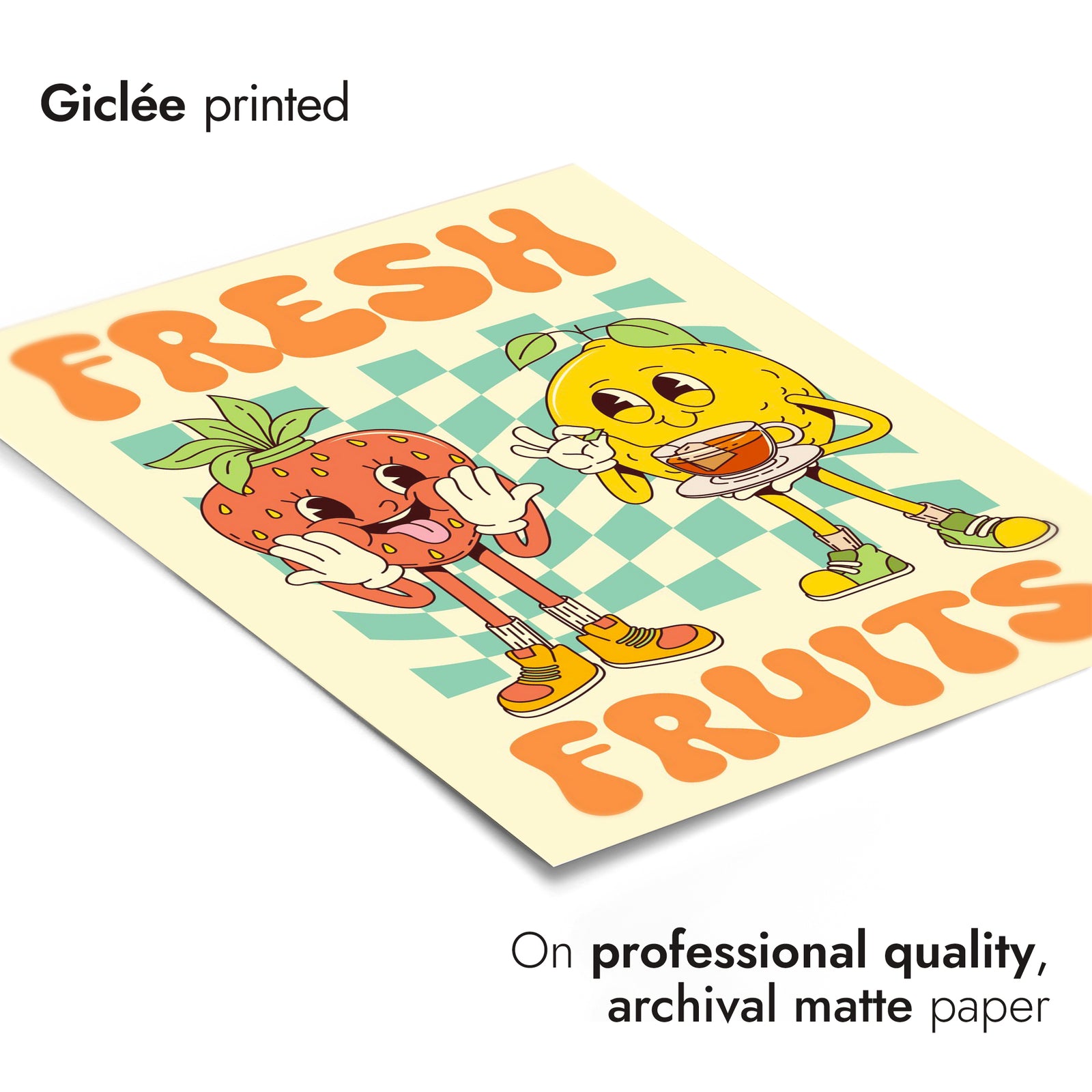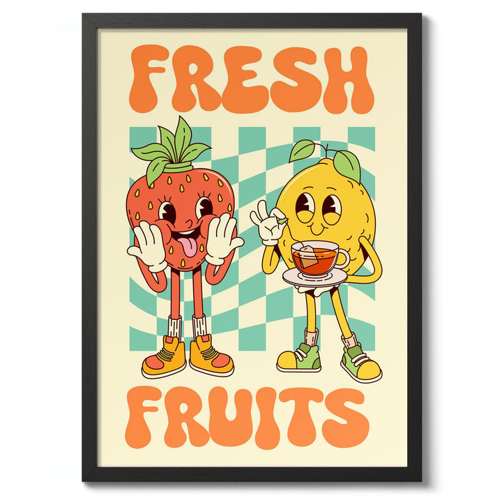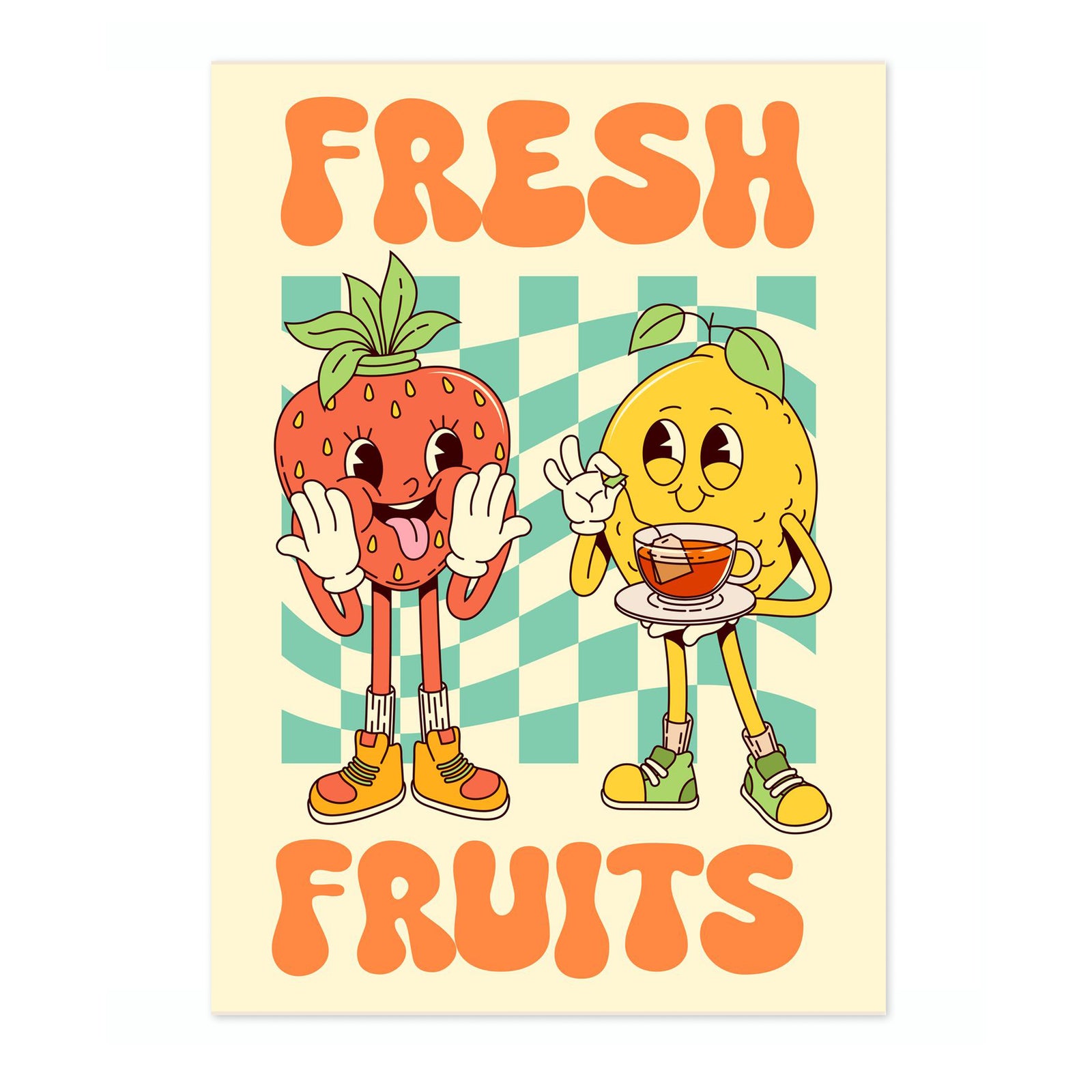 This playful, retro poster titled "Fresh Fruits" features cheerful, anthropomorphized strawberry and lemon characters. The vibrant illustration showcases the fruits in a cartoon style, set against a checkered background, with bold typography above and below. Its vivid colors and charming design capture a whimsical, nostalgic essence. Ideal for adding a fun, vintage vibe to any space.